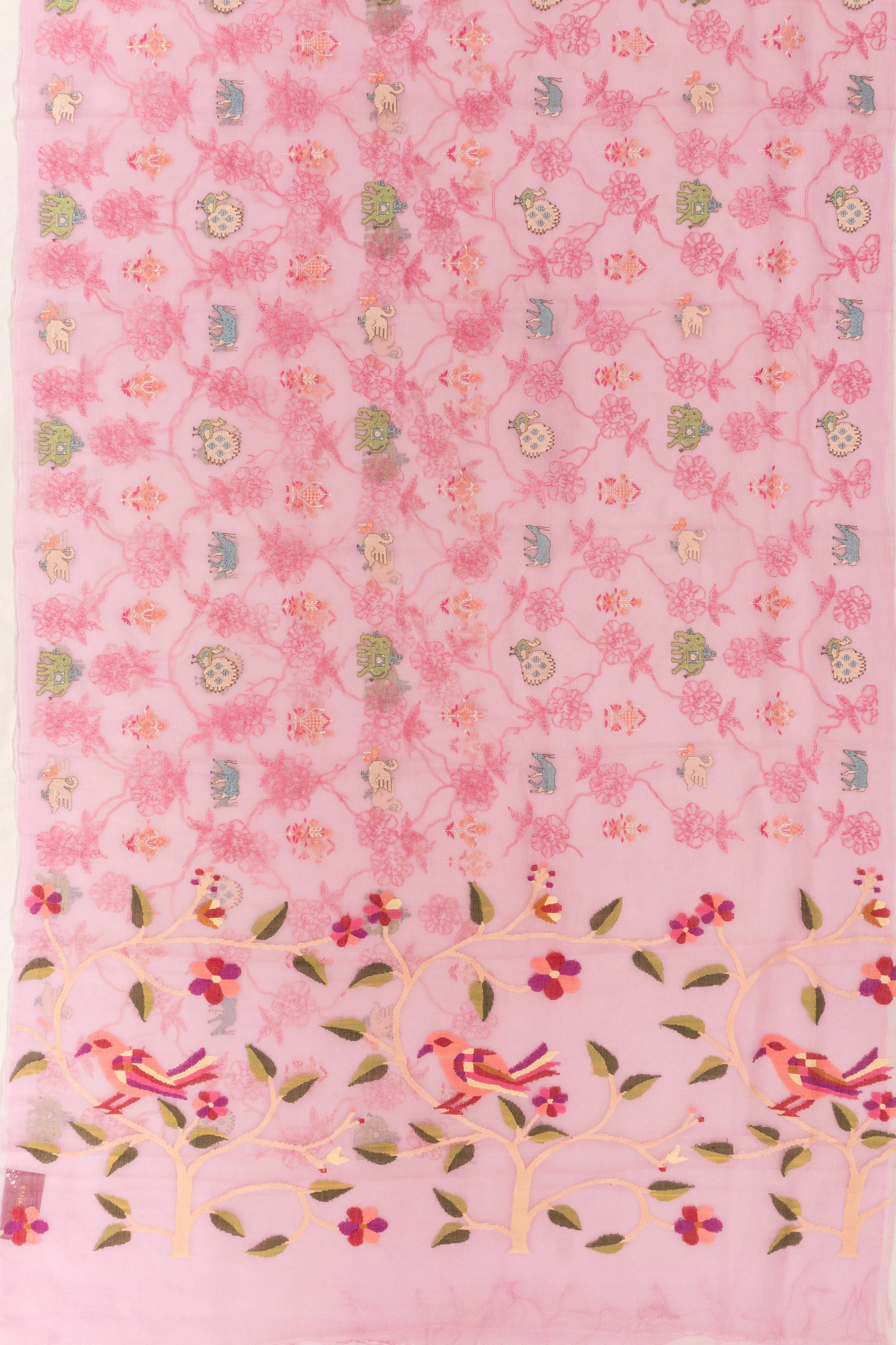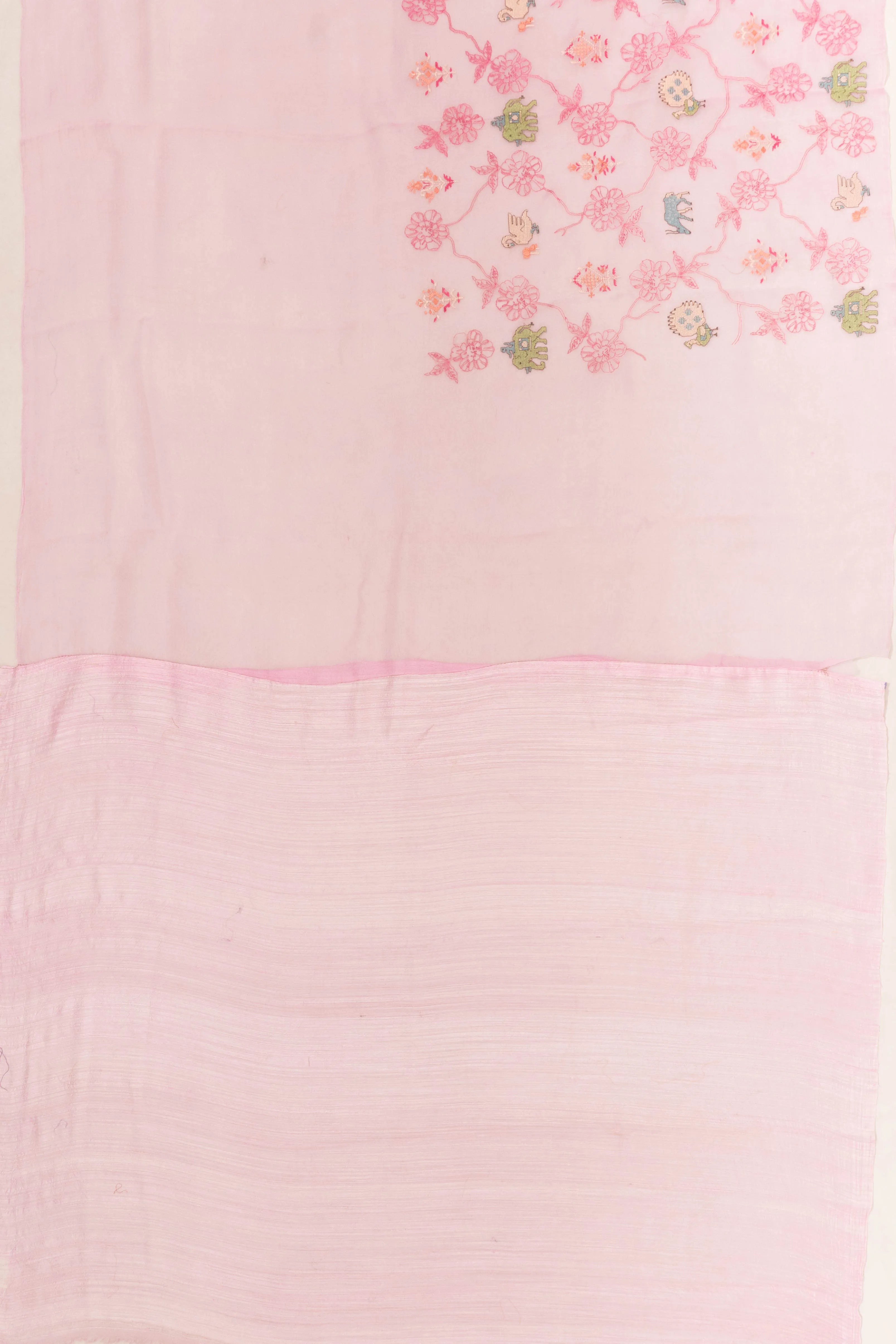 Embrace the charm of heritage with this Organza Embroidery Baby Pink Saree, a graceful embodiment of tradition The saree is adorned with exquisite floral embroidery interspersed with delicate animal motifs, creating a tapestry of elegance and storytelling