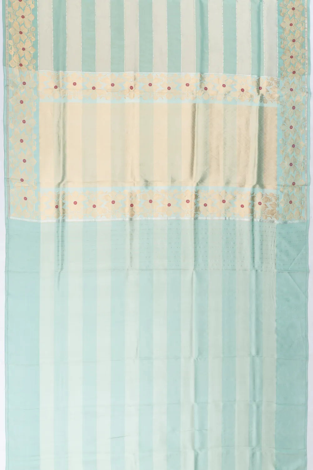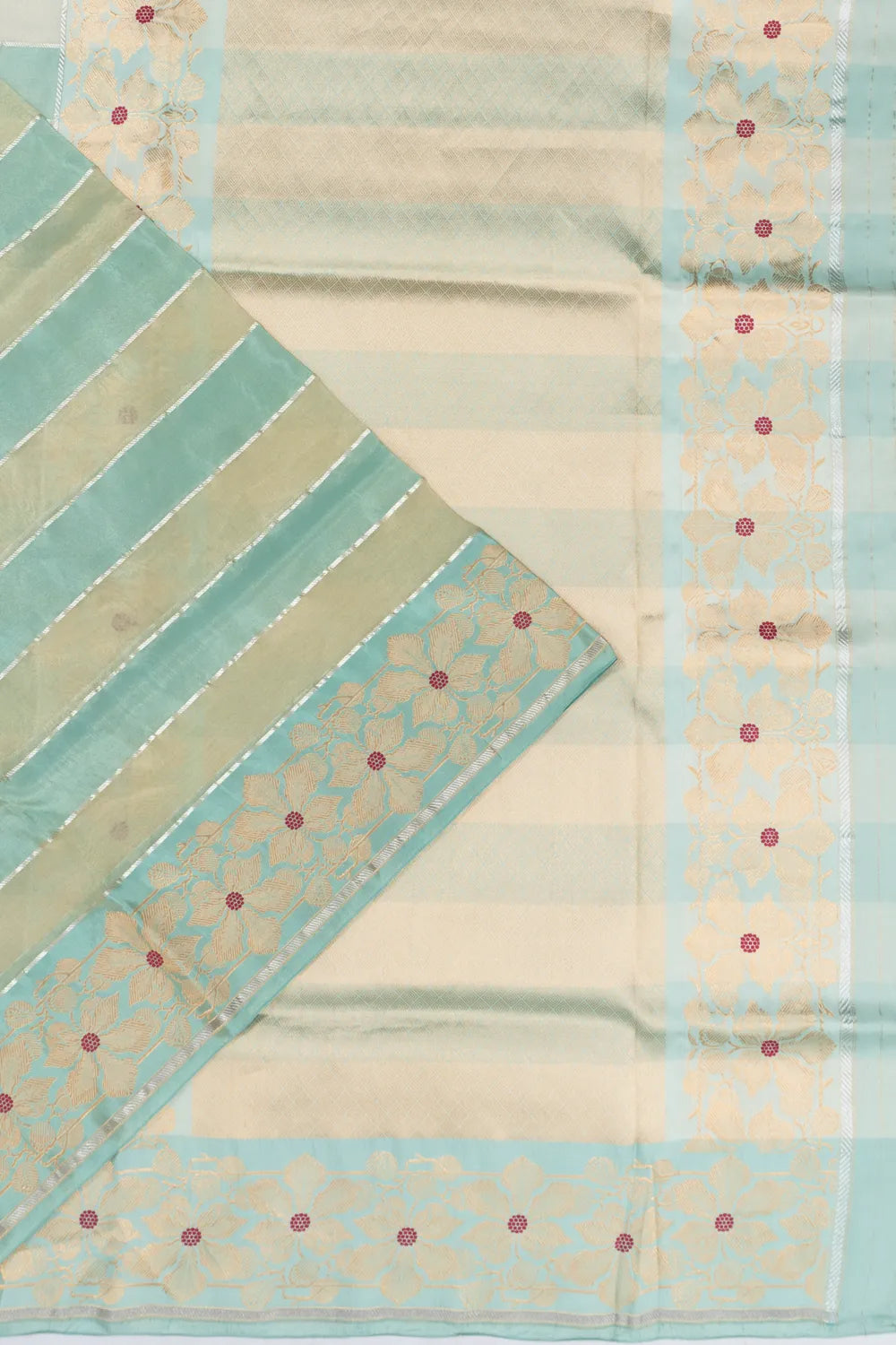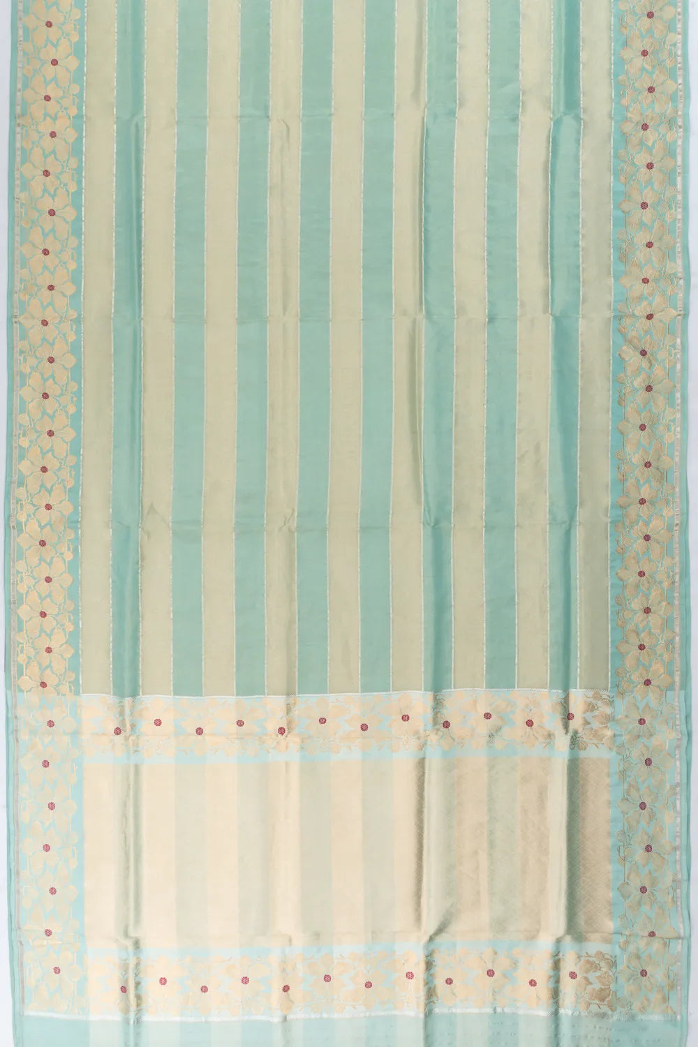 Finished with a self gold zari floral brocade small border, highlighted with delicate red meenakari accents for a pop of color.
