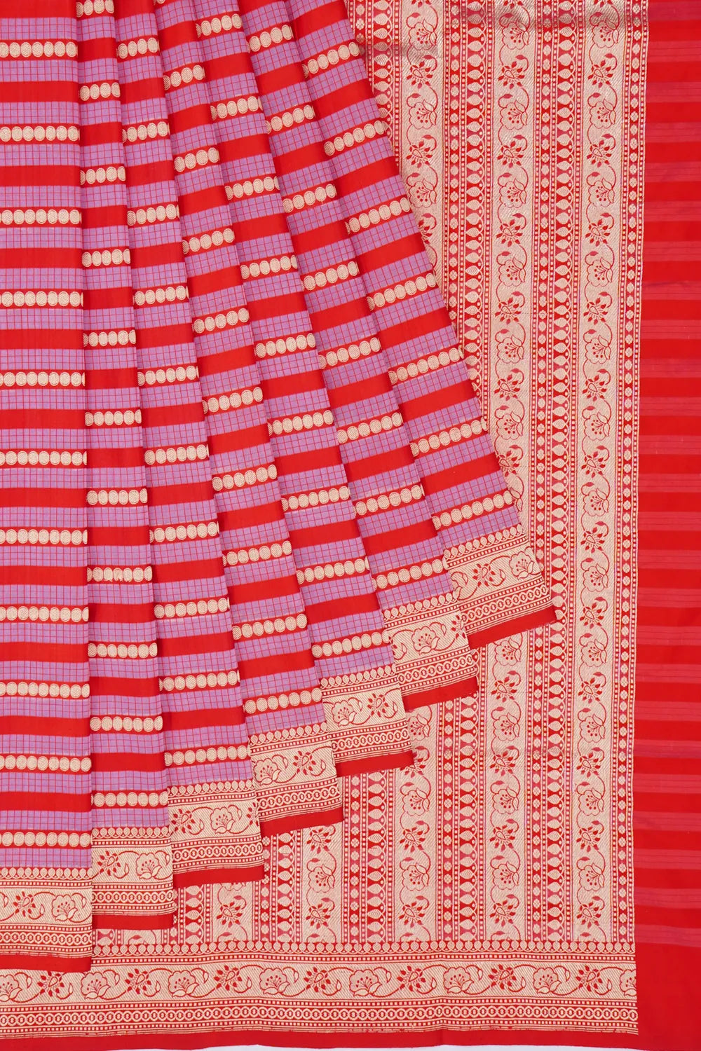 Embrace the rich heritage of Banaras with this captivating Banarasi Kora and satin Brocade Red Saree The saree features a striking interplay of checks on a violet base, adorned with delicate silver zari polka dots, creating an exquisite visual appeal