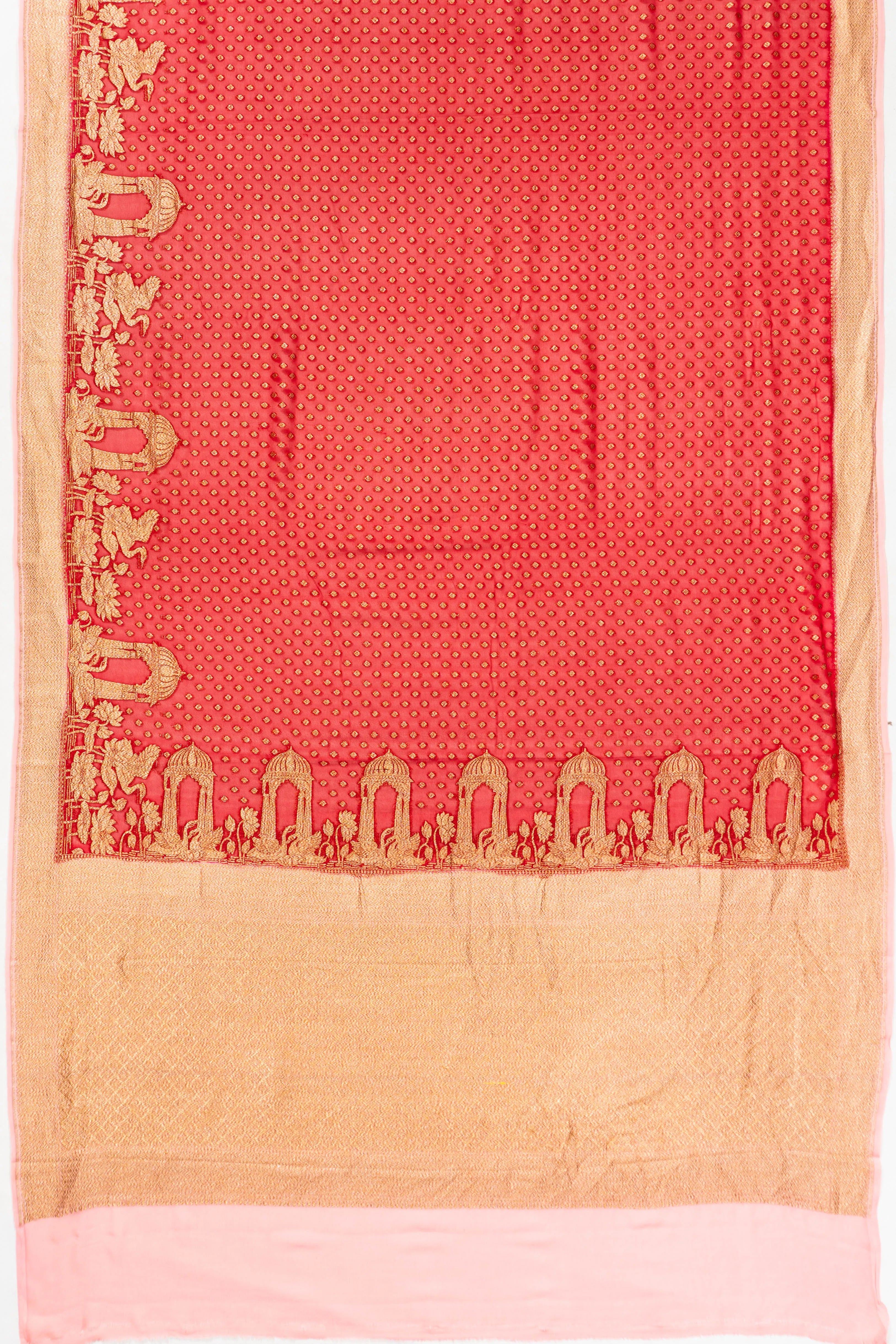 A coordinated baby pink border in gold zari brocade adds a subtle contrast, enhancing the saree's rich red hue with a touch of gentle charm