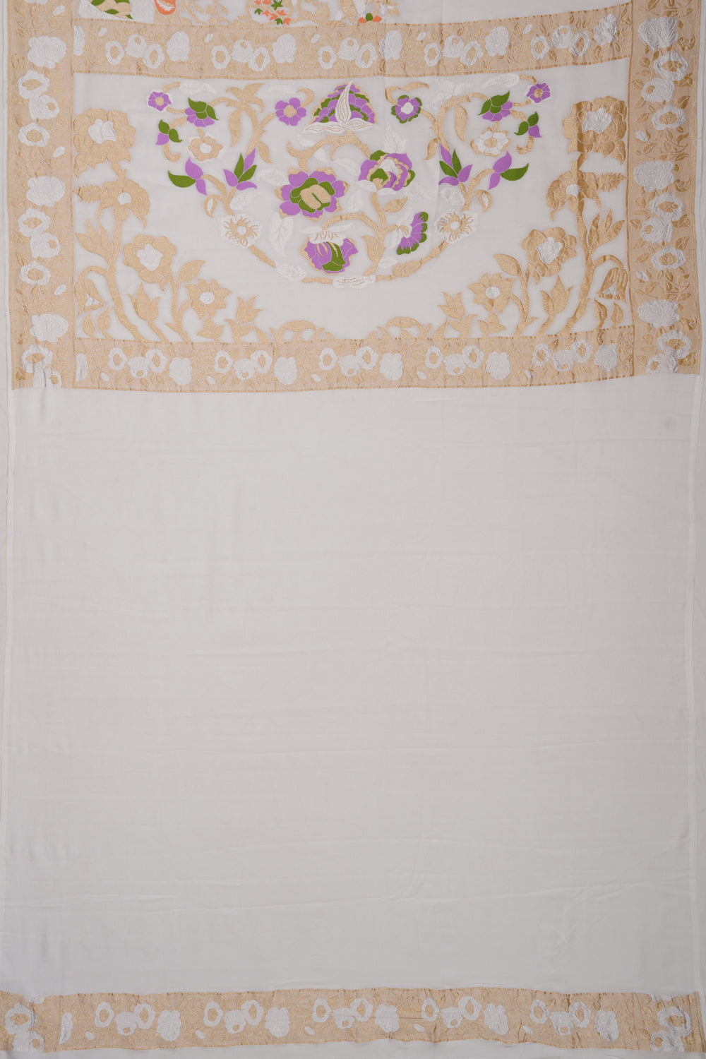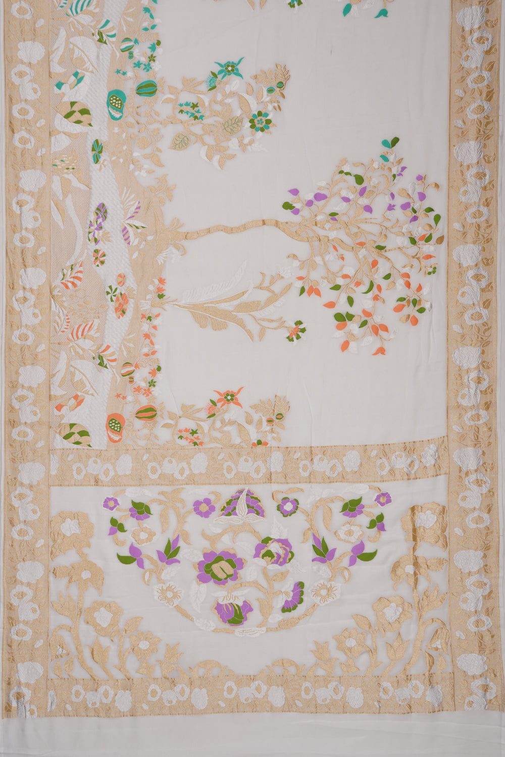 This saree features a self-border embellished with gold and silver zari floral vines, adding a subtle yet sophisticated touch