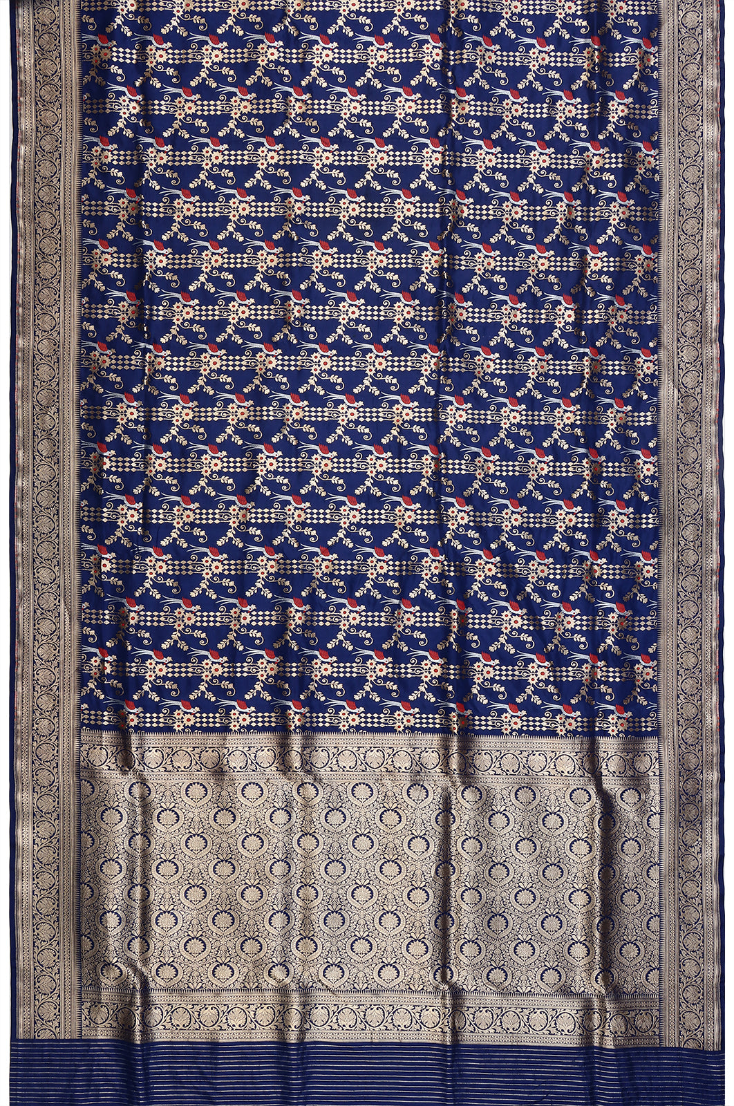 The lush blue silk is adorned with intricate zari motifs, creating a mesmerizing brocade that speaks of rich heritage and timeless elegance