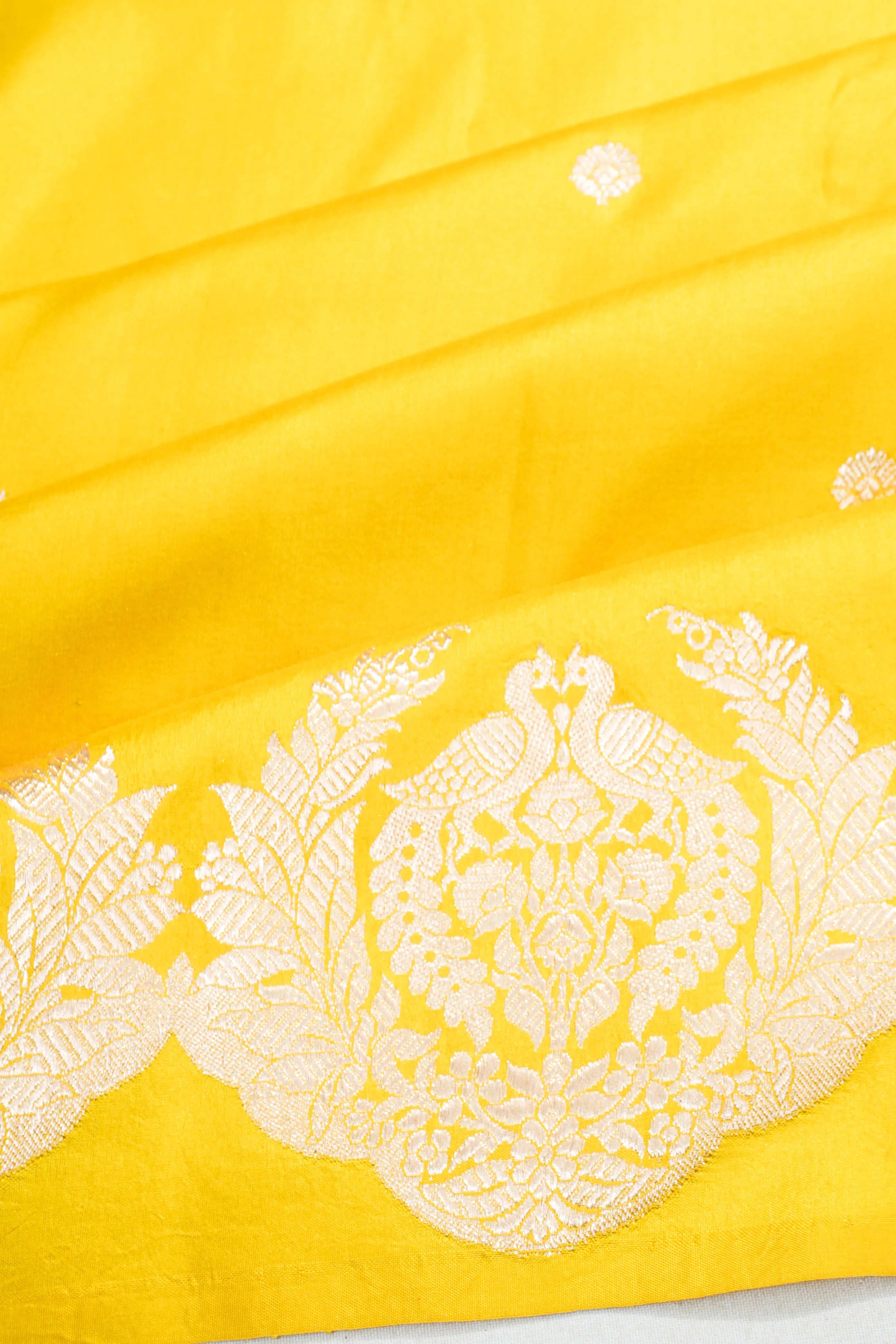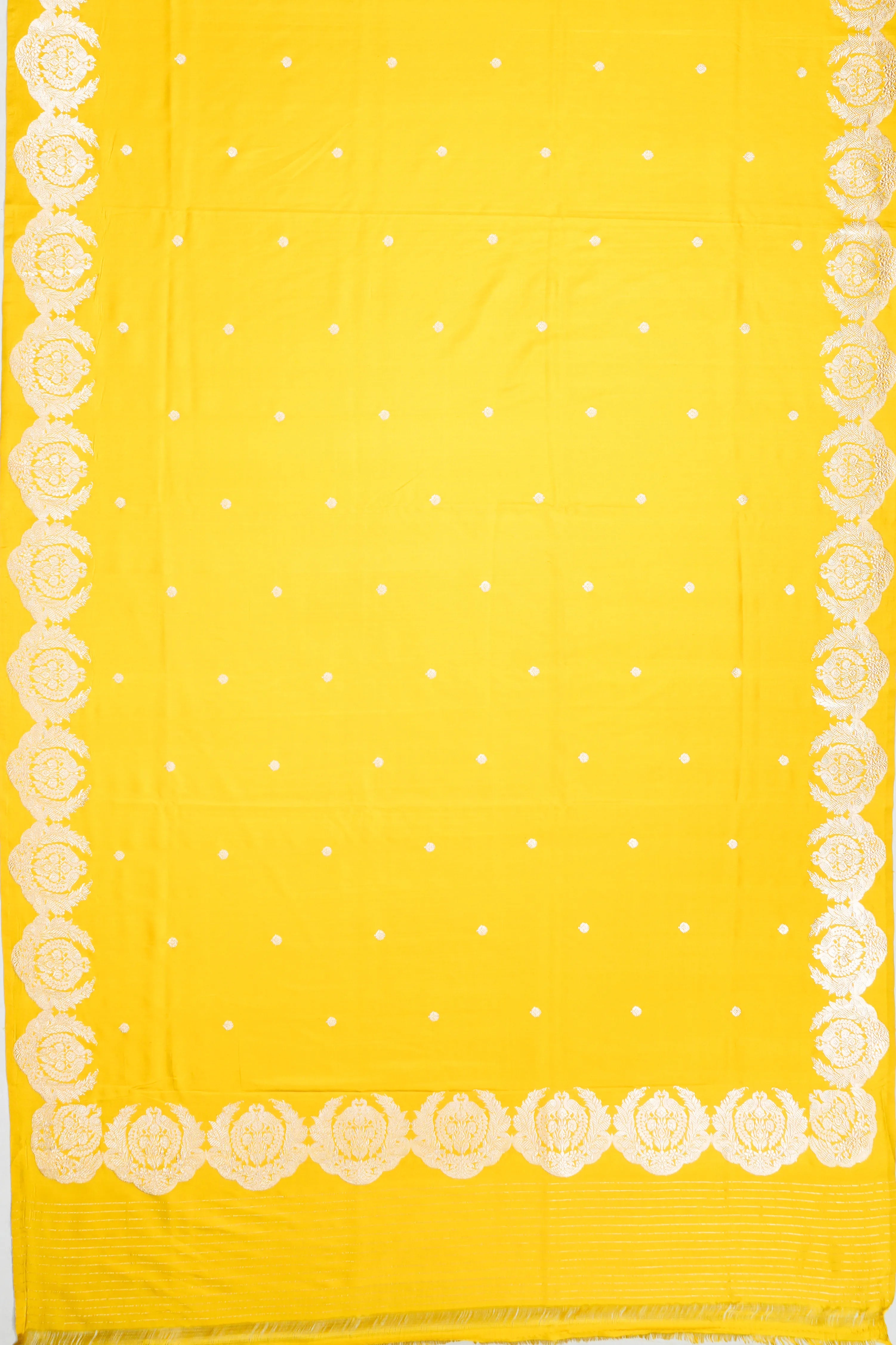 The saree's body is adorned with delicate Kadwa Butta motifs, woven seamlessly into the luxurious silk, capturing the beauty of age-old craftsmanship