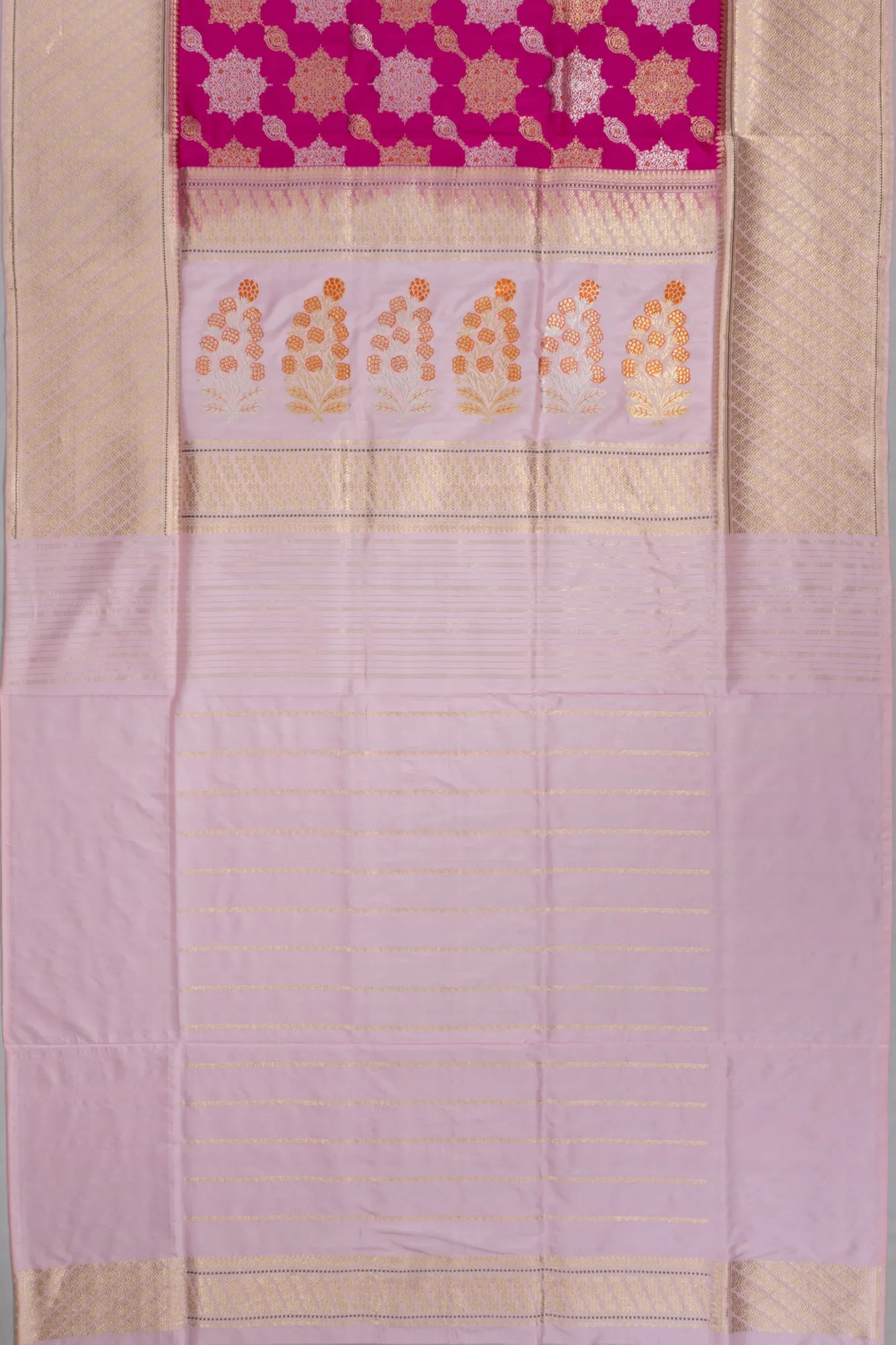The sarees body is a masterpiece of gold and silver zari jaal brocade, weaving a tapestry of heritage-rich motifs that exude sophistication and grace