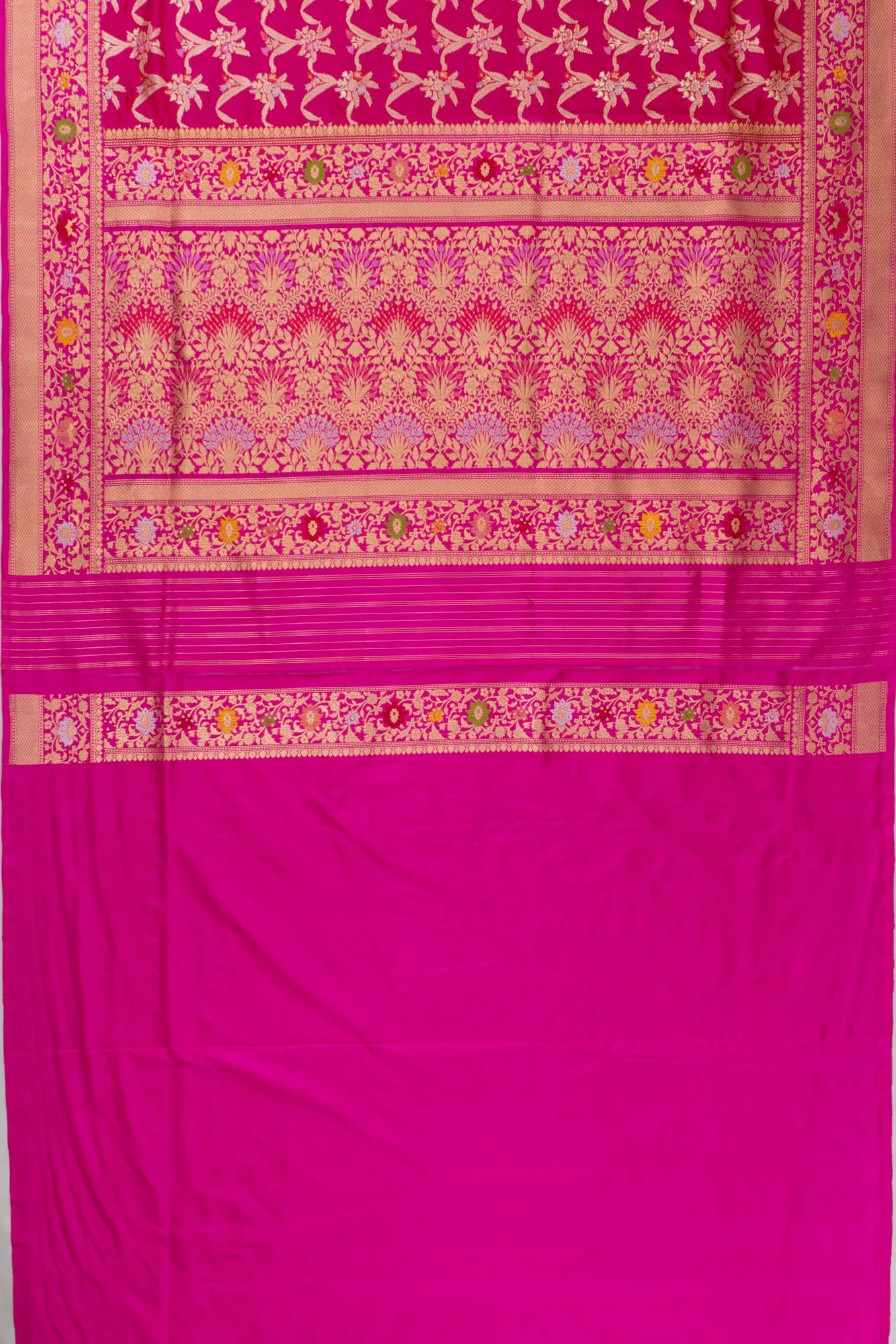 The saree's body showcases a luxurious gold zari floral jaal that exudes elegance and sophistication, capturing the essence of timeless artistry