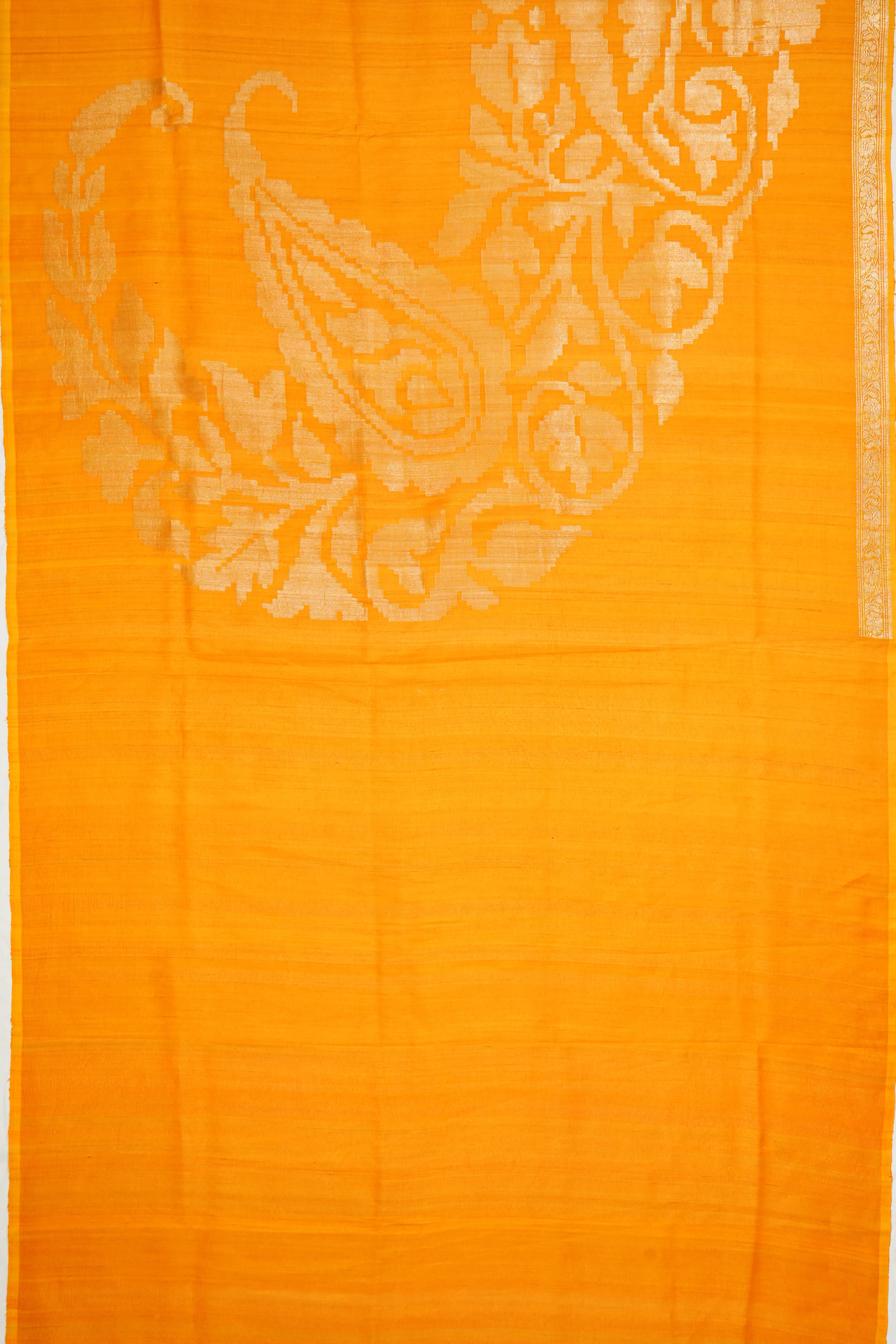 Rich mustard yellow base with gold zari floral brocade, combining the earthy texture of tussar silk with the opulence of Banarasi weaving.