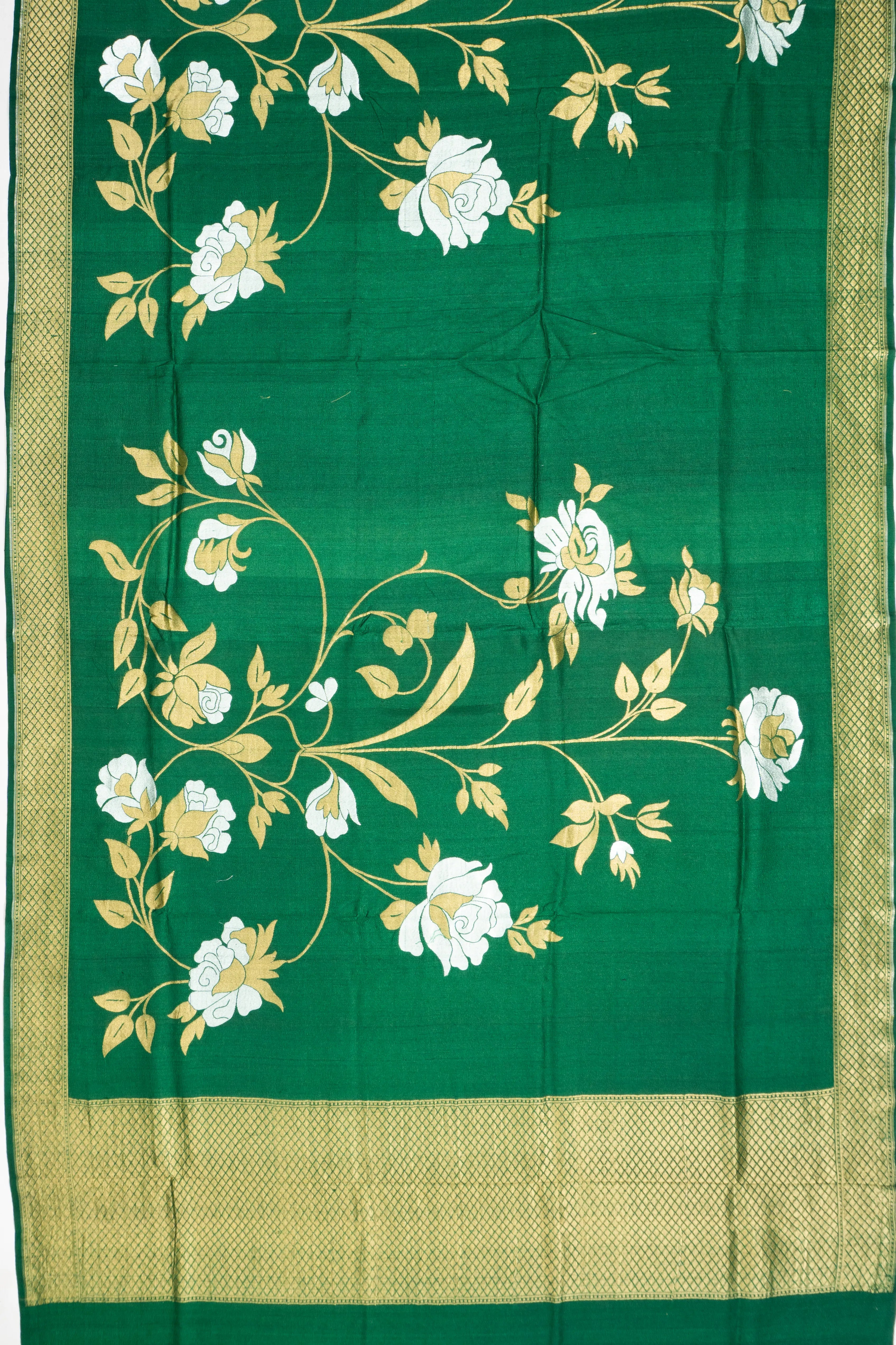 Embrace the allure of heritage with this Banarasi Tussar Brocade Green Saree, a masterpiece of traditional artistry The saree's body is adorned with lush gold and silver zari floral brocade, exuding a graceful charm that captures the essence of elegance