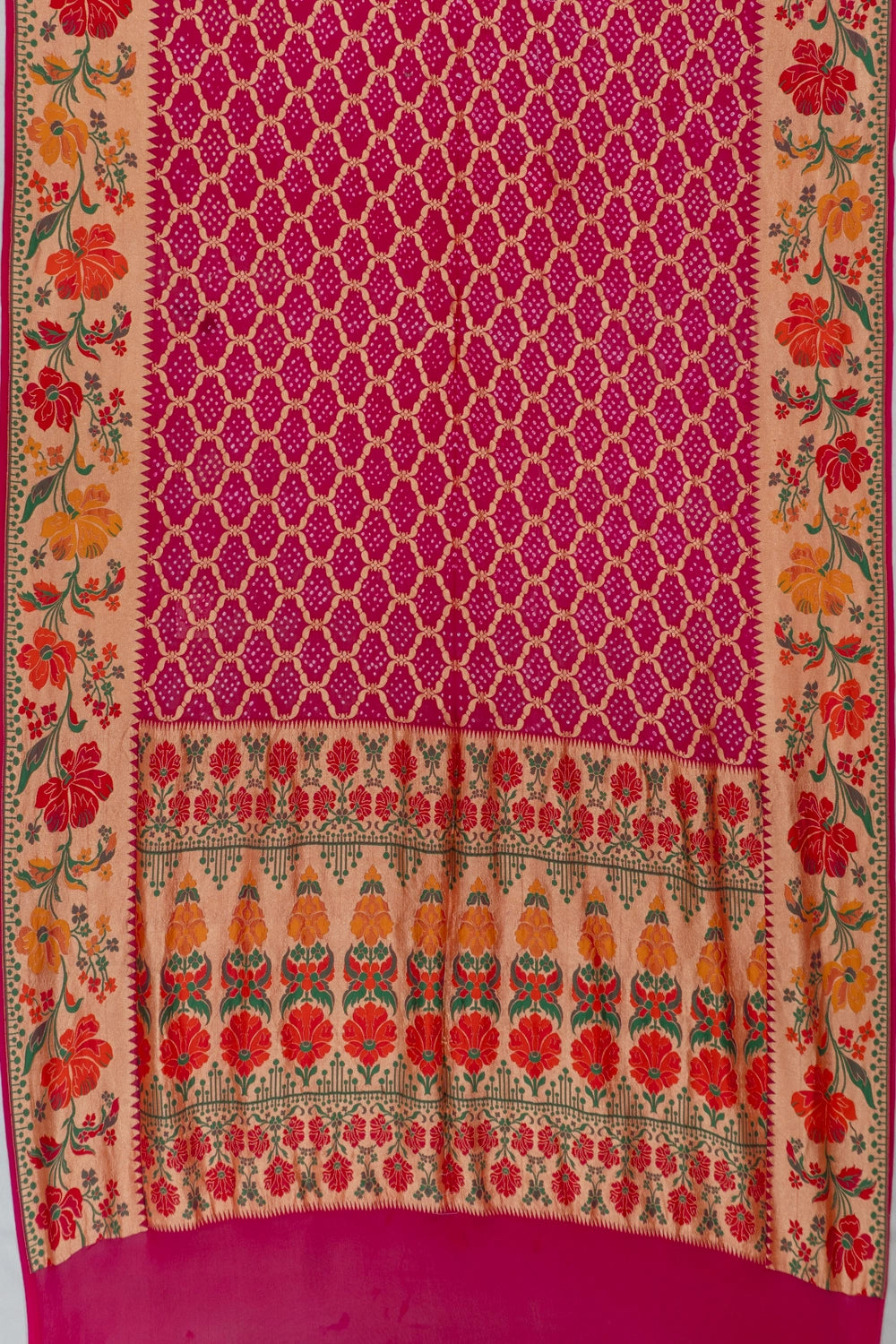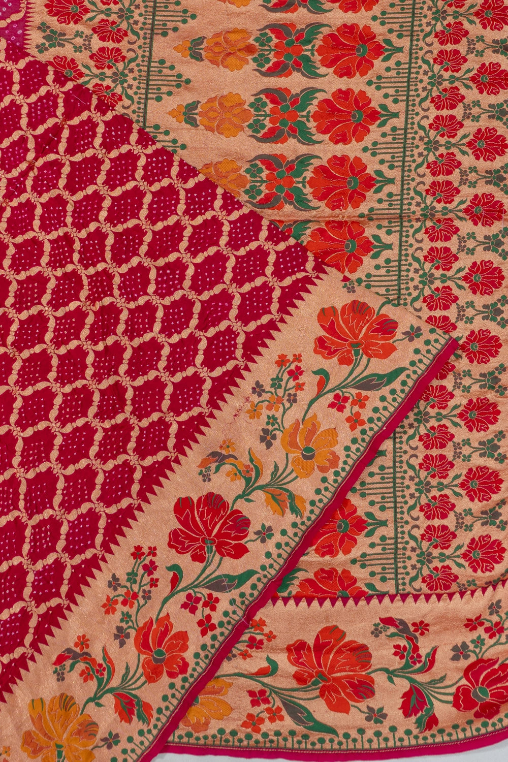 The saree's body is beautifully embellished with traditional bandhani patterns, showcasing vibrant artistry that enhances its allure