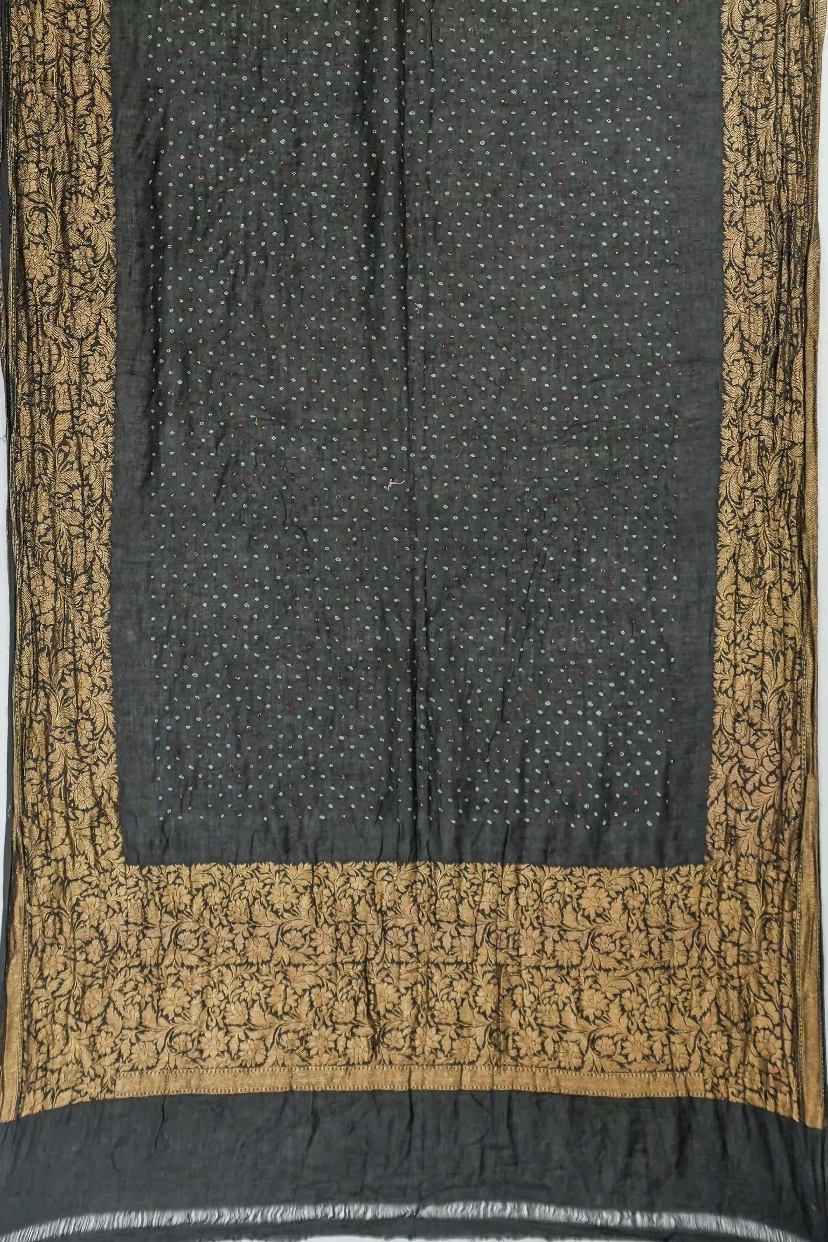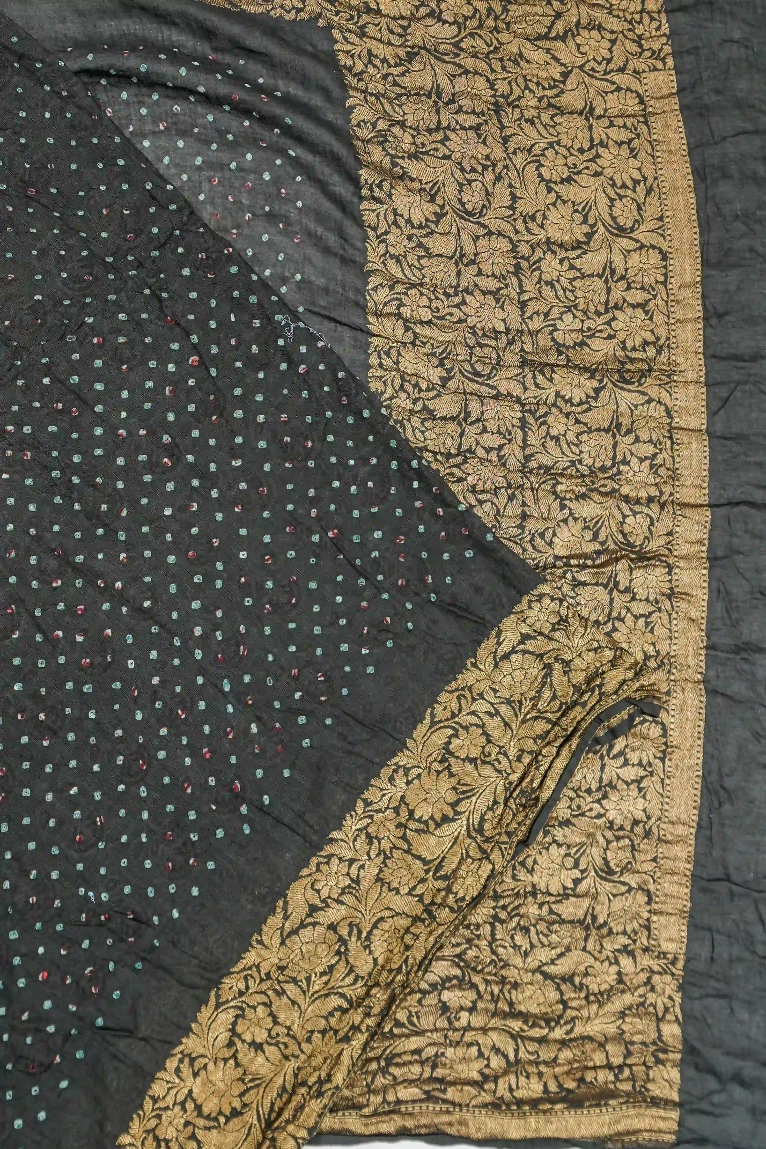 The saree's body is adorned with intricate Bandhani patterns, offering a rich tapestry of traditional artistry against the luxurious sheen of pure silk