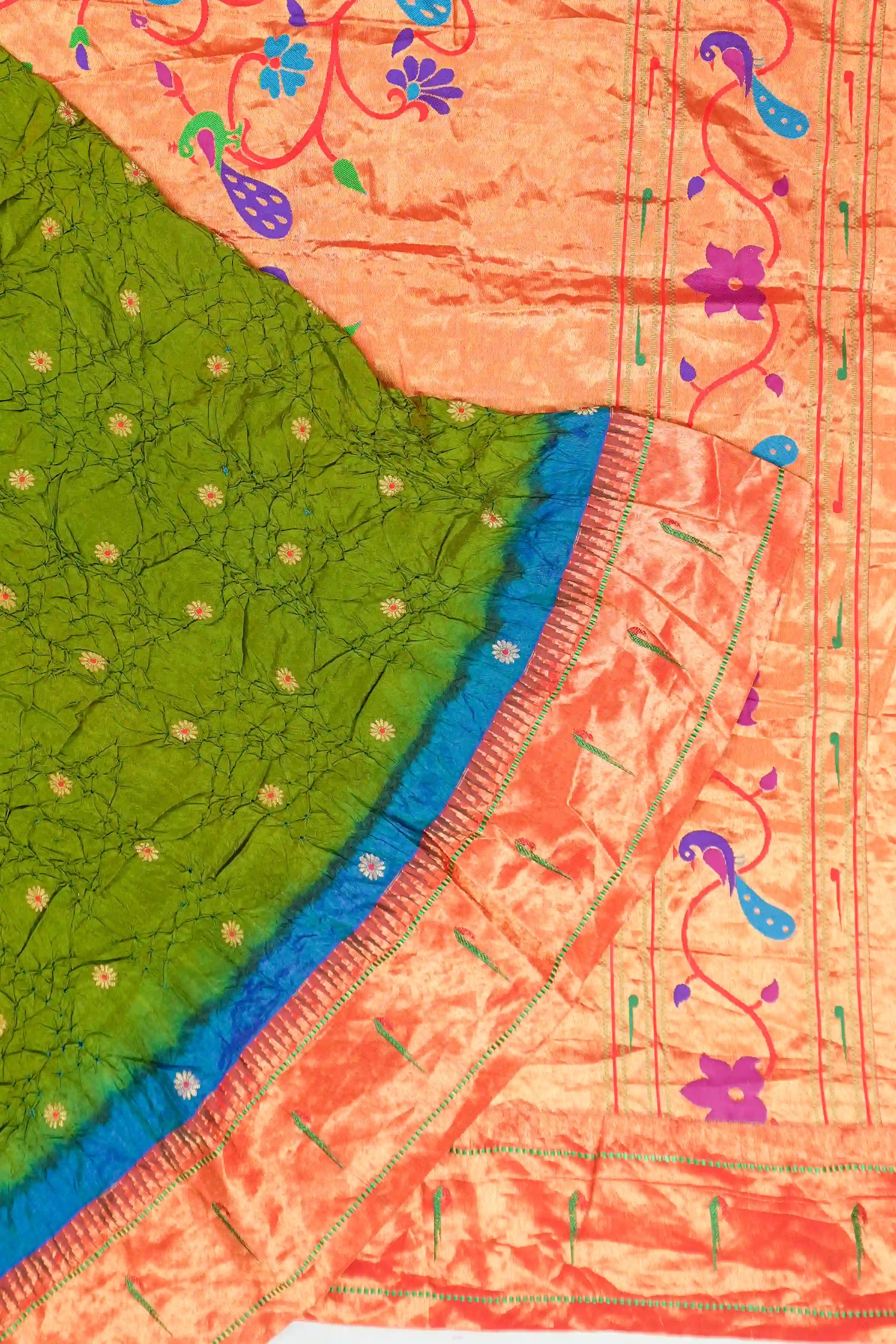 Muniya Silk Bandhani Green Saree With Paithani Inspired Border