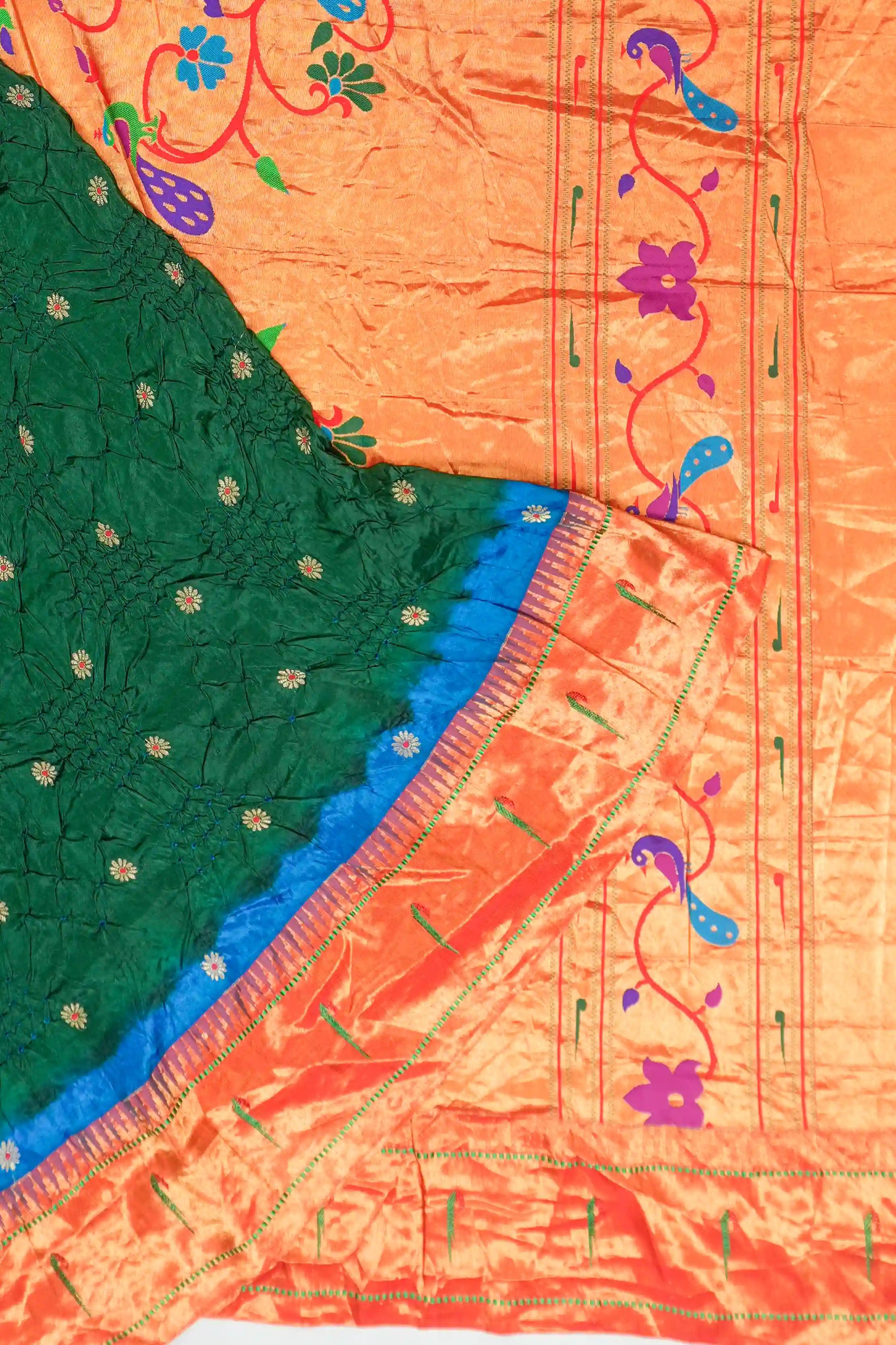 Muniya Silk Bandhani Green Saree with Paithani Inspired Border