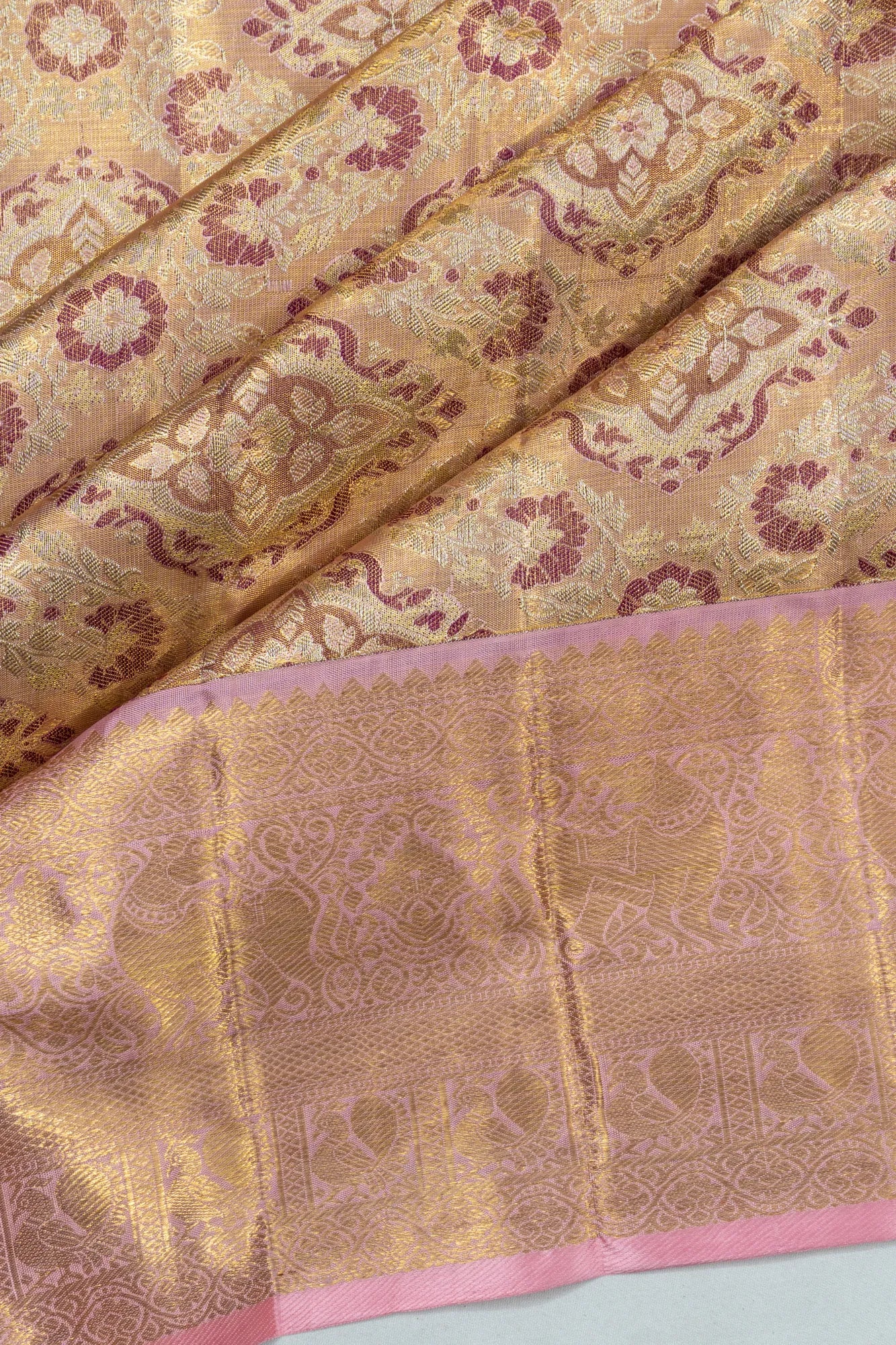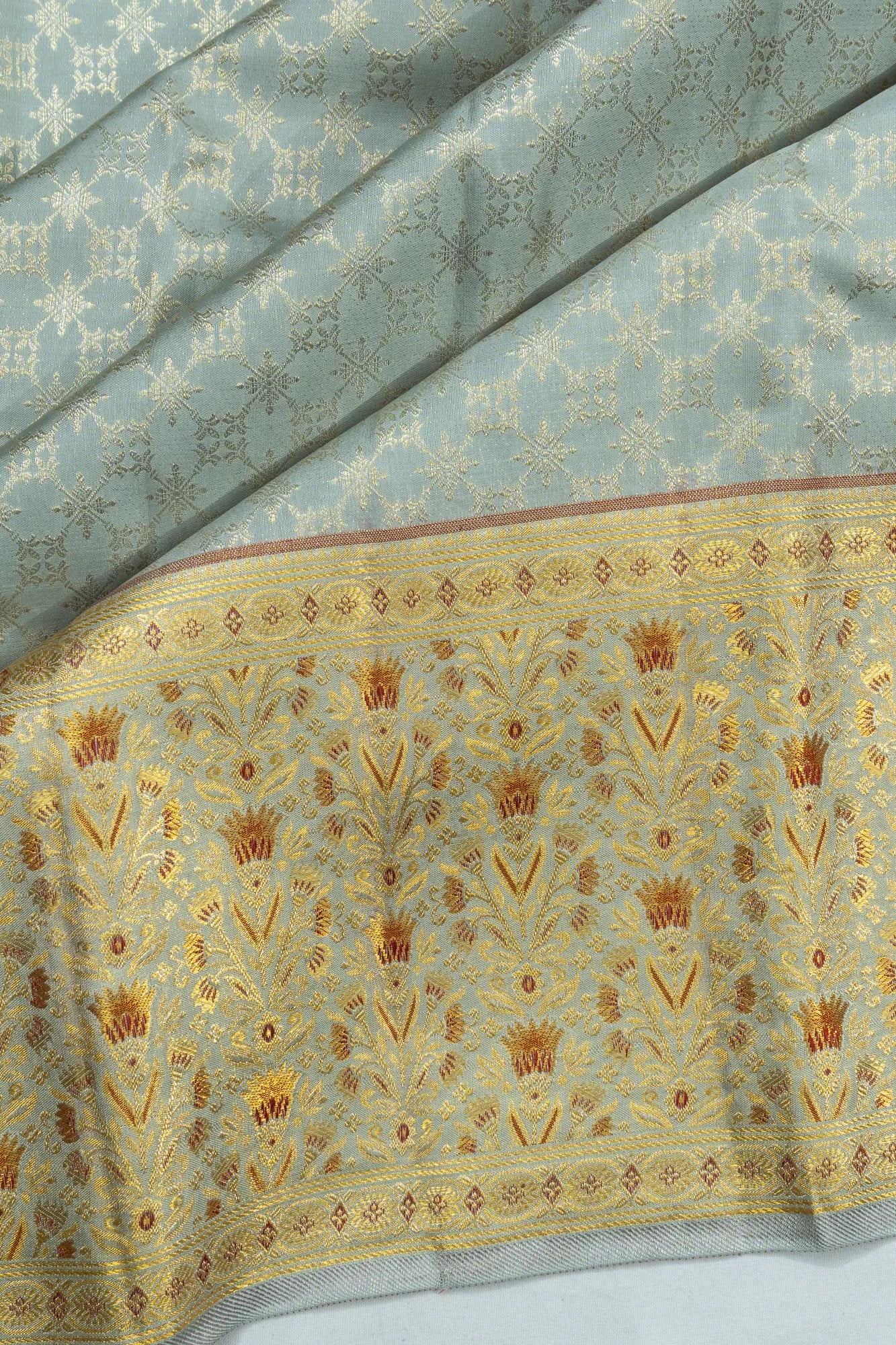 The big border saree is synonymous with Kanjivaram sarees. Usually, sarees have a border of around 2 inches. It can be thinner or thicker depending on the design. The border in a saree helps give it a defines shape and allows it to have a fall effect by keeping the weight of the fabric down. Big border Kanjivaram sarees are usually of 4-6 inches and are adorned with intricate zari work throughout. The designs are usually inspired from the Dravidian monuments, especially the thousand temples as evident in many Kanchipuram sarees. Other border designs include geometric patterns, buti motifs, flowers and animals. Nowadays, many fashion designers have nostalgic writing embroidered on the border to give it a personalized touch. The colour of the border is mostly in silver or gold upon a base colour. The base colour can either be the same as the body of the saree or be in contrast to it. In such cases, the blouse should correspond to the border to complete the regal look. They work great in big border pattu sarees that are used for weddings.