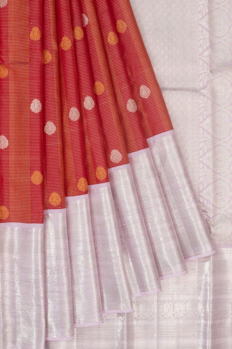 A contrast silver zari brocade lavender big border with intricate floral vines provides a graceful contrast.