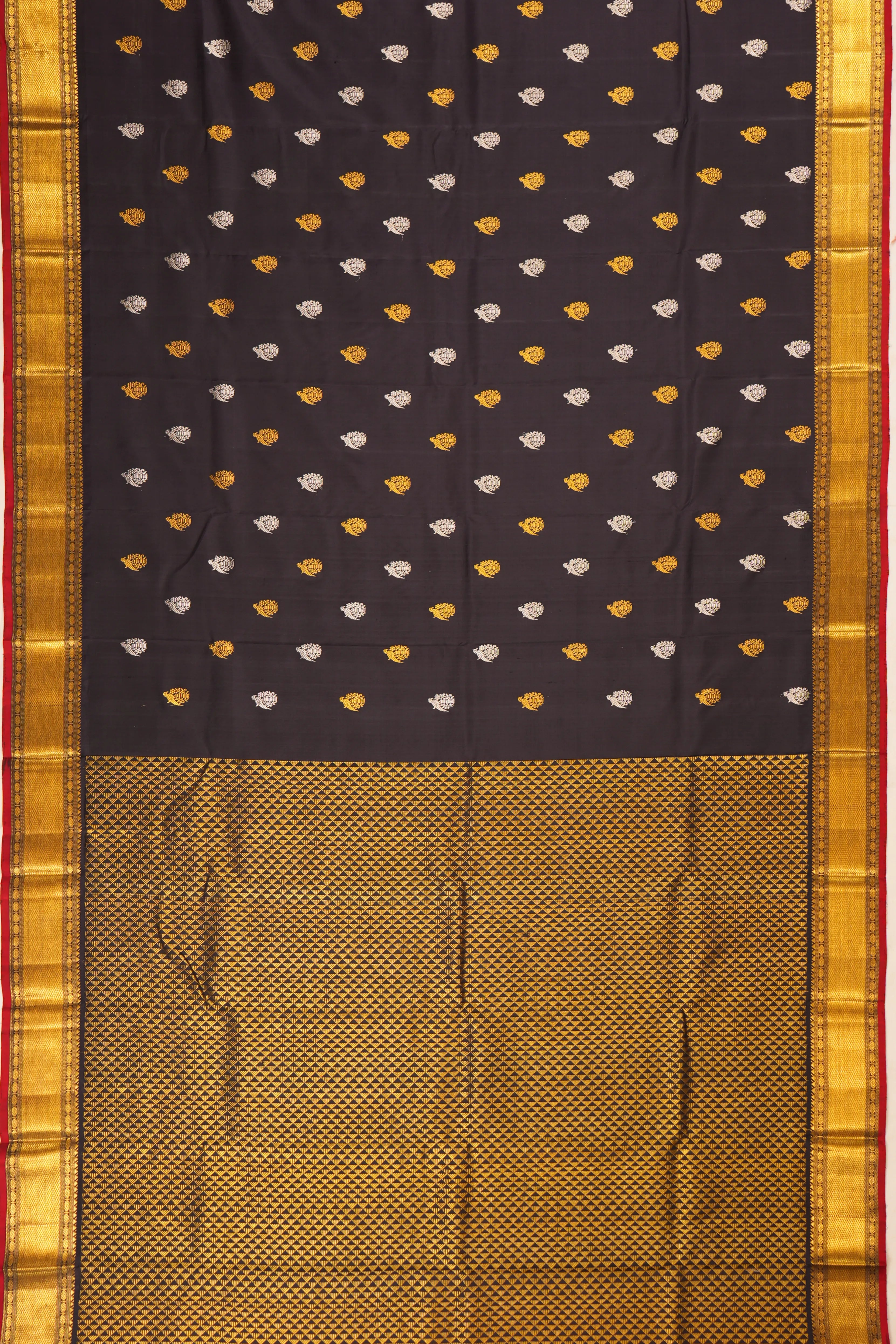 The deep black base is elevated with shimmering gold and silver zari floral butta, casting an opulent aura with every drape.