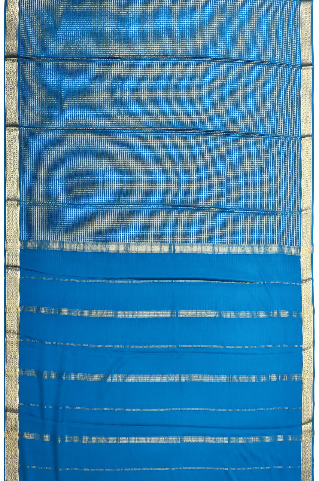 The saree features an exquisite checkered pattern that gracefully blends with the rich blue hue, creating a mesmerizing visual symphony