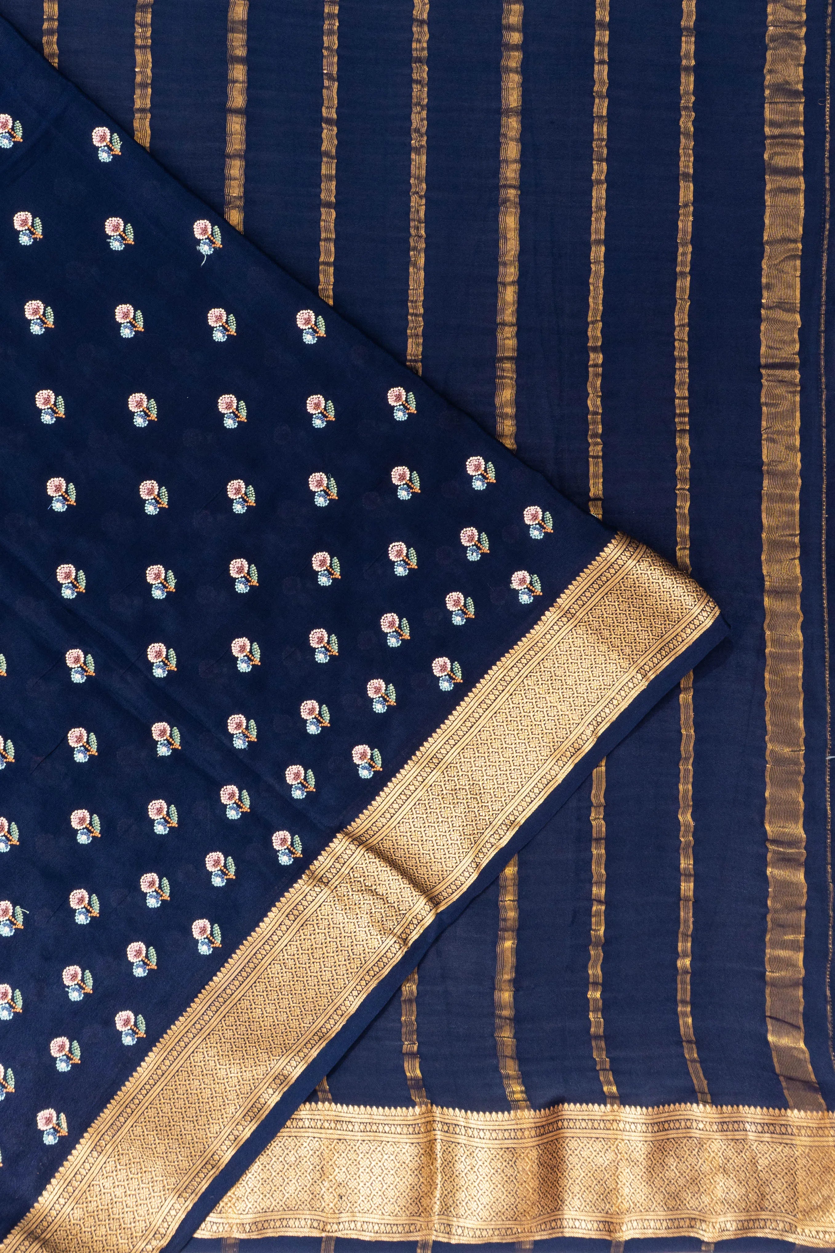 The body is adorned with floral embroidery buttas that dance gracefully across the luxurious silk, creating a striking visual symphony