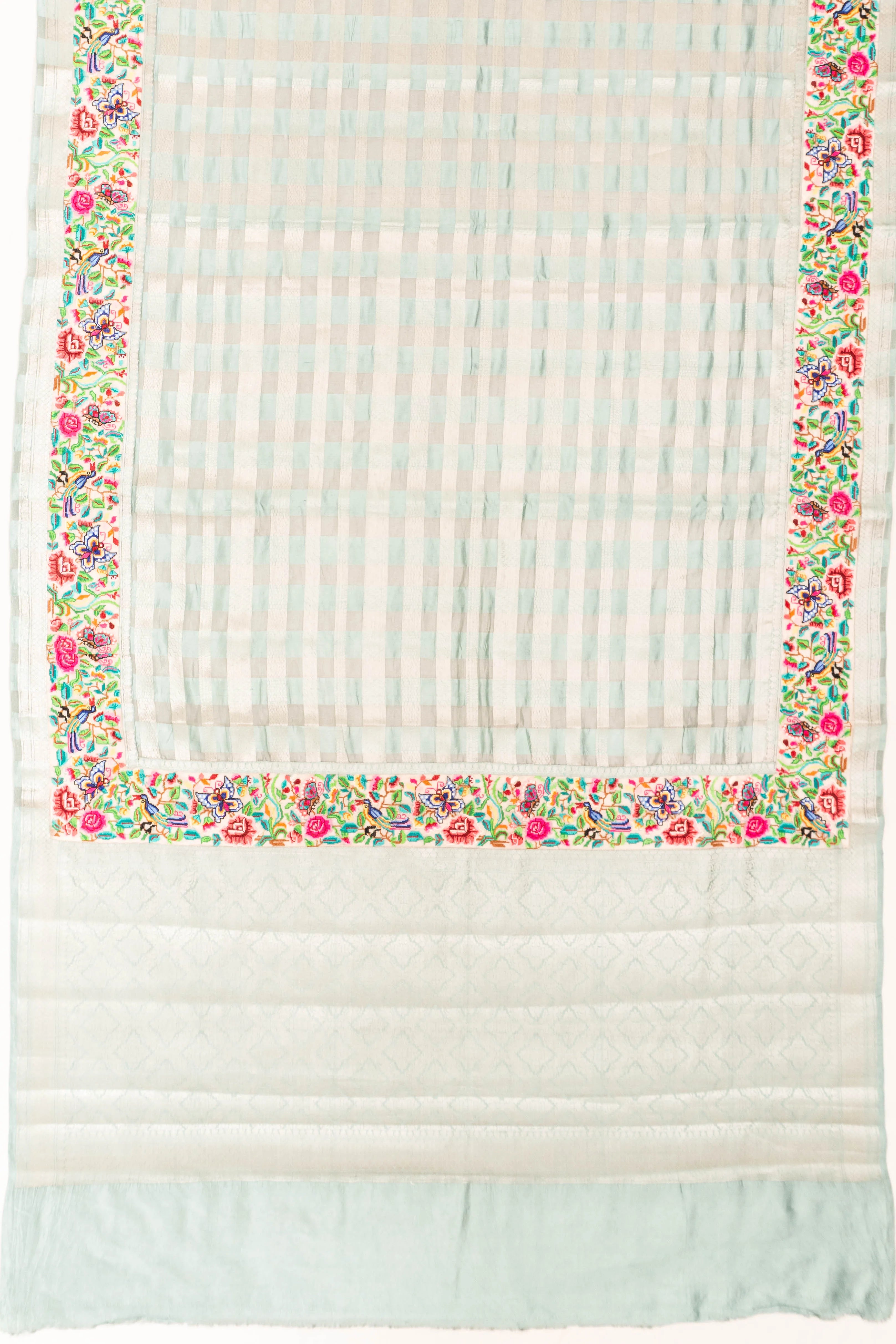 The body is adorned with delicate silver zari checks, offering a subtle shimmer that enhances the serene sky blue backdrop