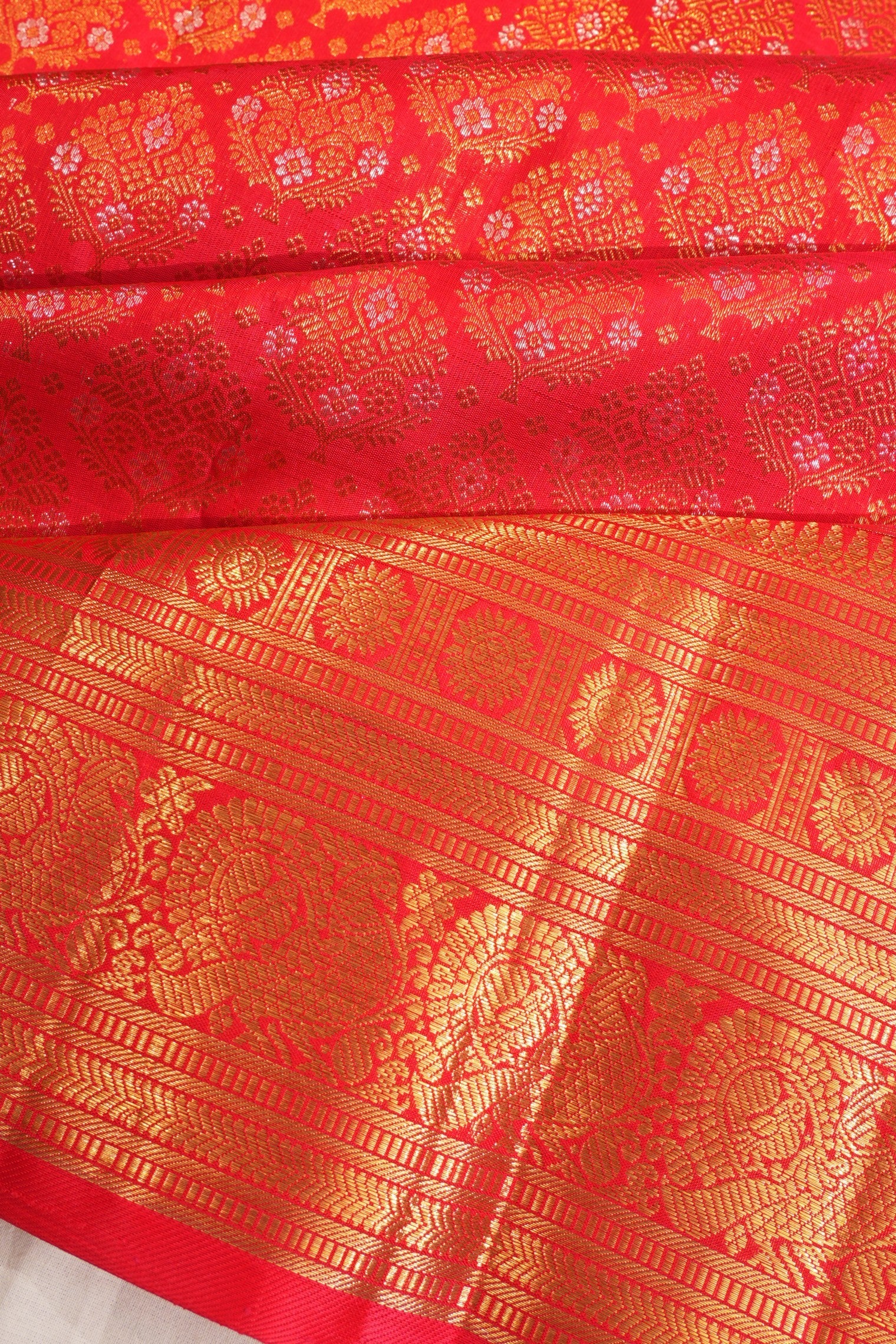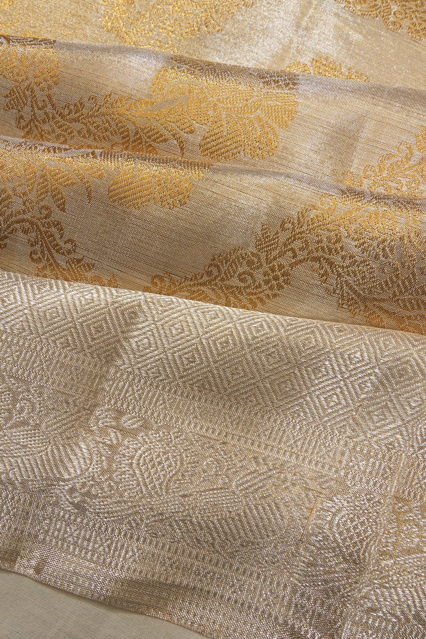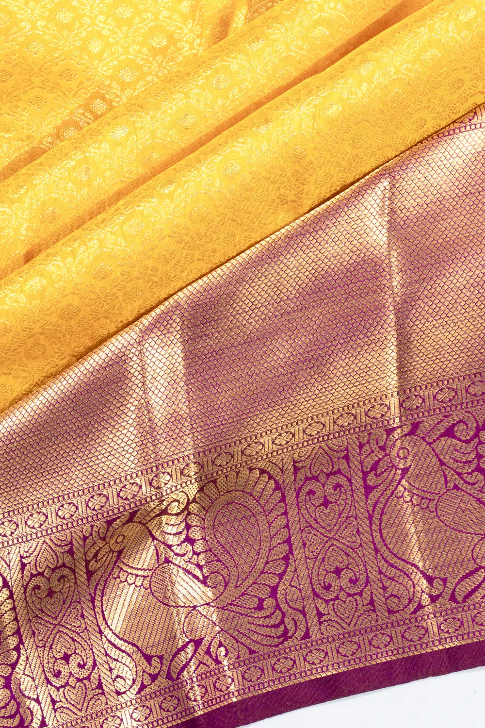 Every bridal Kanchipuram features standard or pure zari—real silver threads coated with gold. The kuttu borders and 5-inch contrasts define South Indian bridal grandeur.