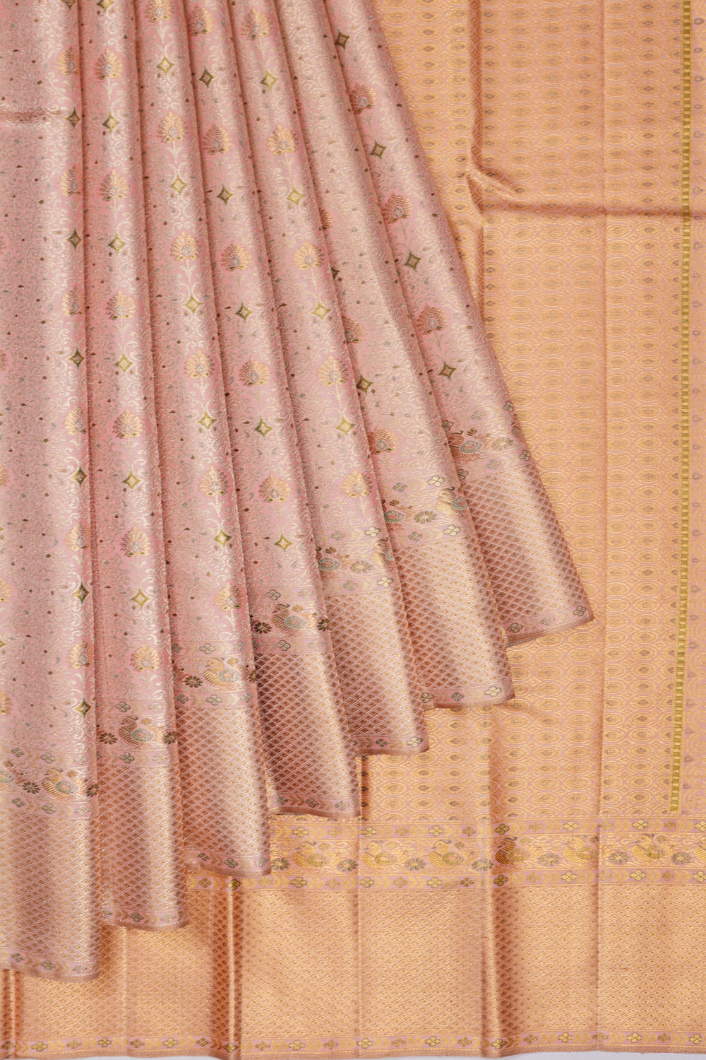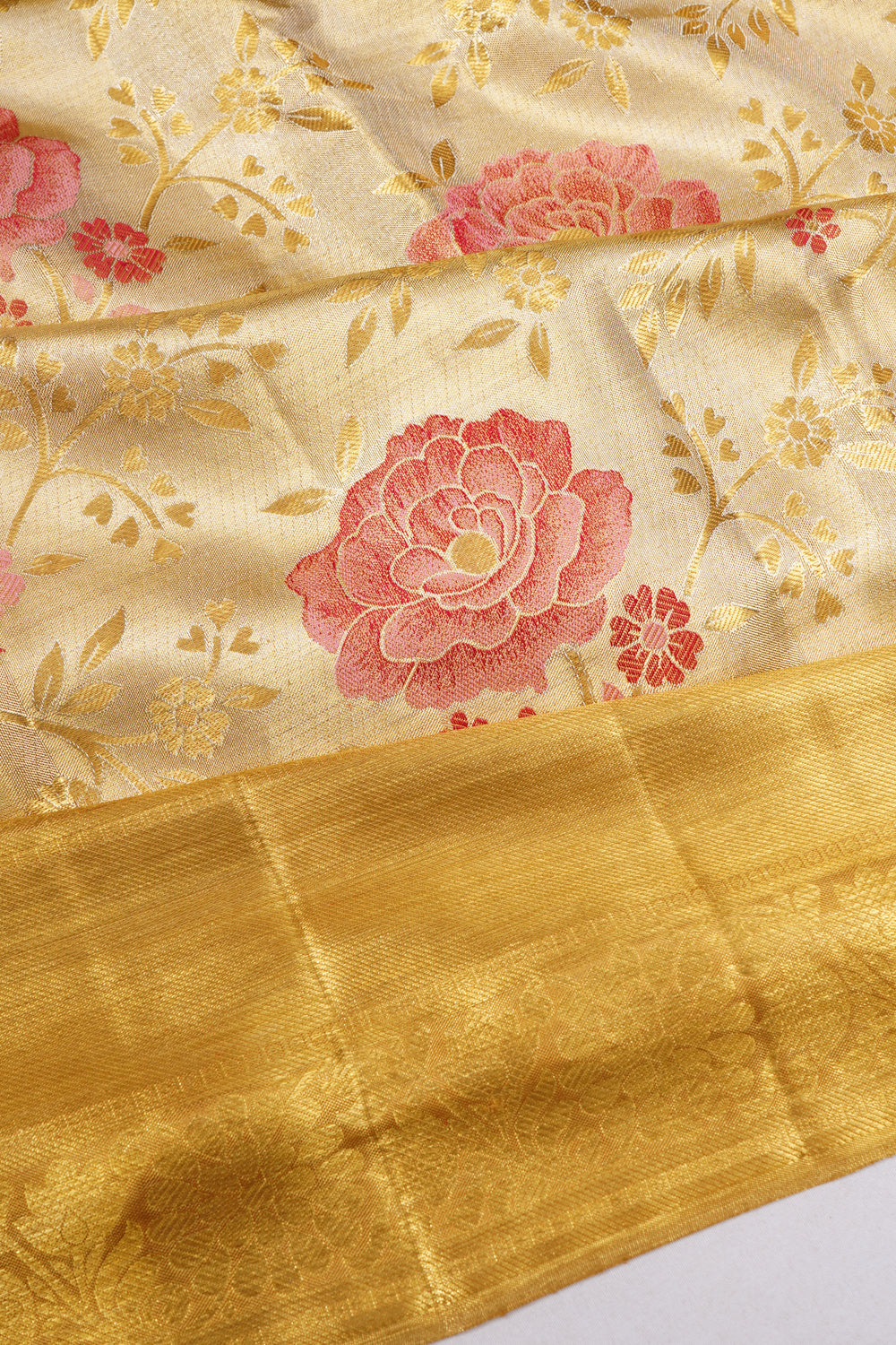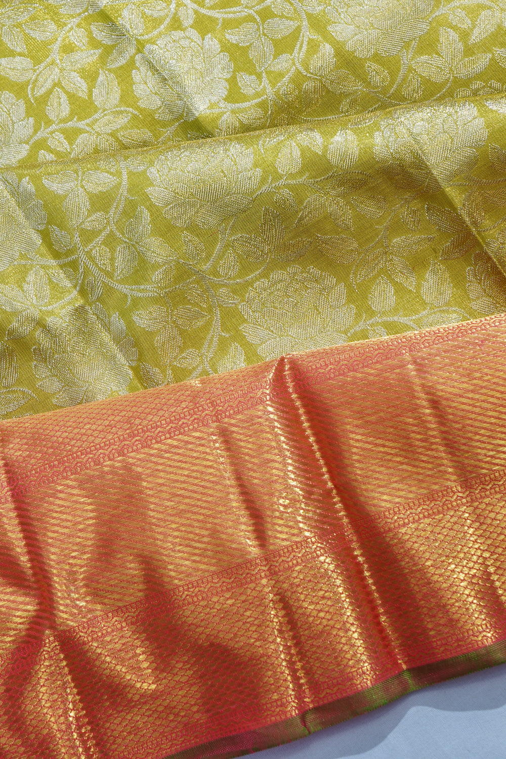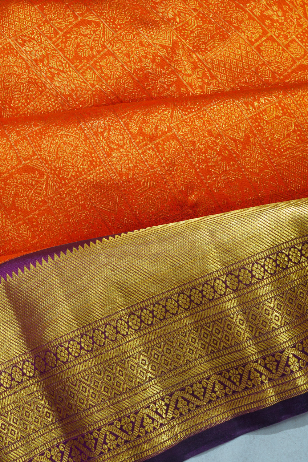 Every bridal Kanchipuram features standard or pure zari—real silver threads coated with gold. The kuttu borders and 5-inch contrasts define South Indian bridal grandeur.