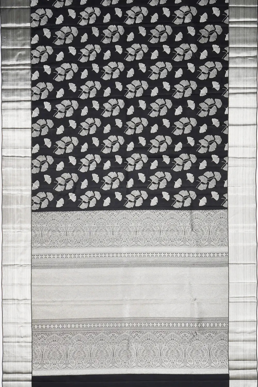 The saree's body is adorned with floral brocade, offering a graceful dance of motifs that play beautifully against the luxurious black backdrop