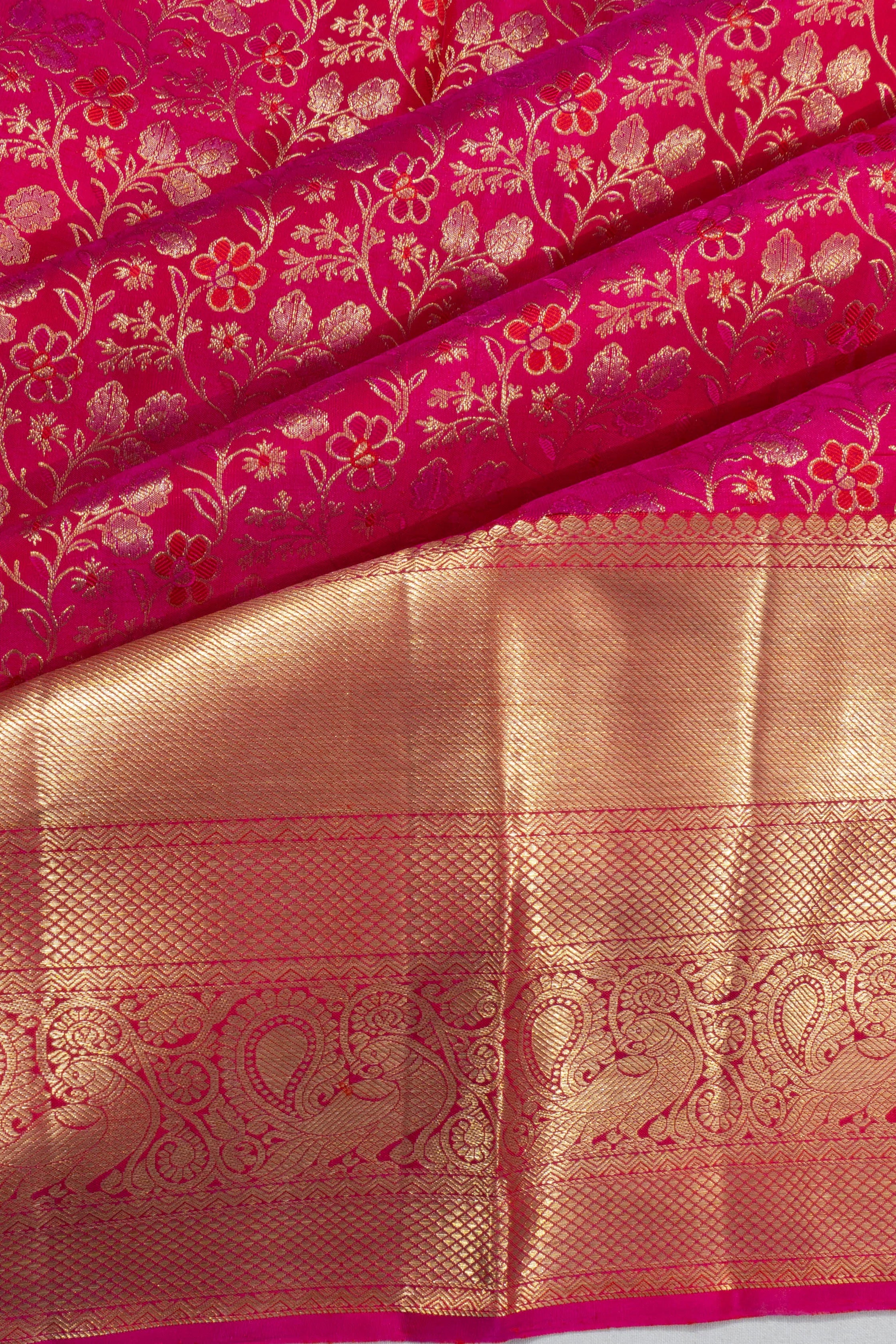 Embrace the timeless allure of tradition with our Kanchipuram Silk Brocade Pink Saree, a masterpiece of elegance and heritage The saree's body is adorned with a luxurious gold zari floral brocade, capturing the essence of opulence and grace in every thread