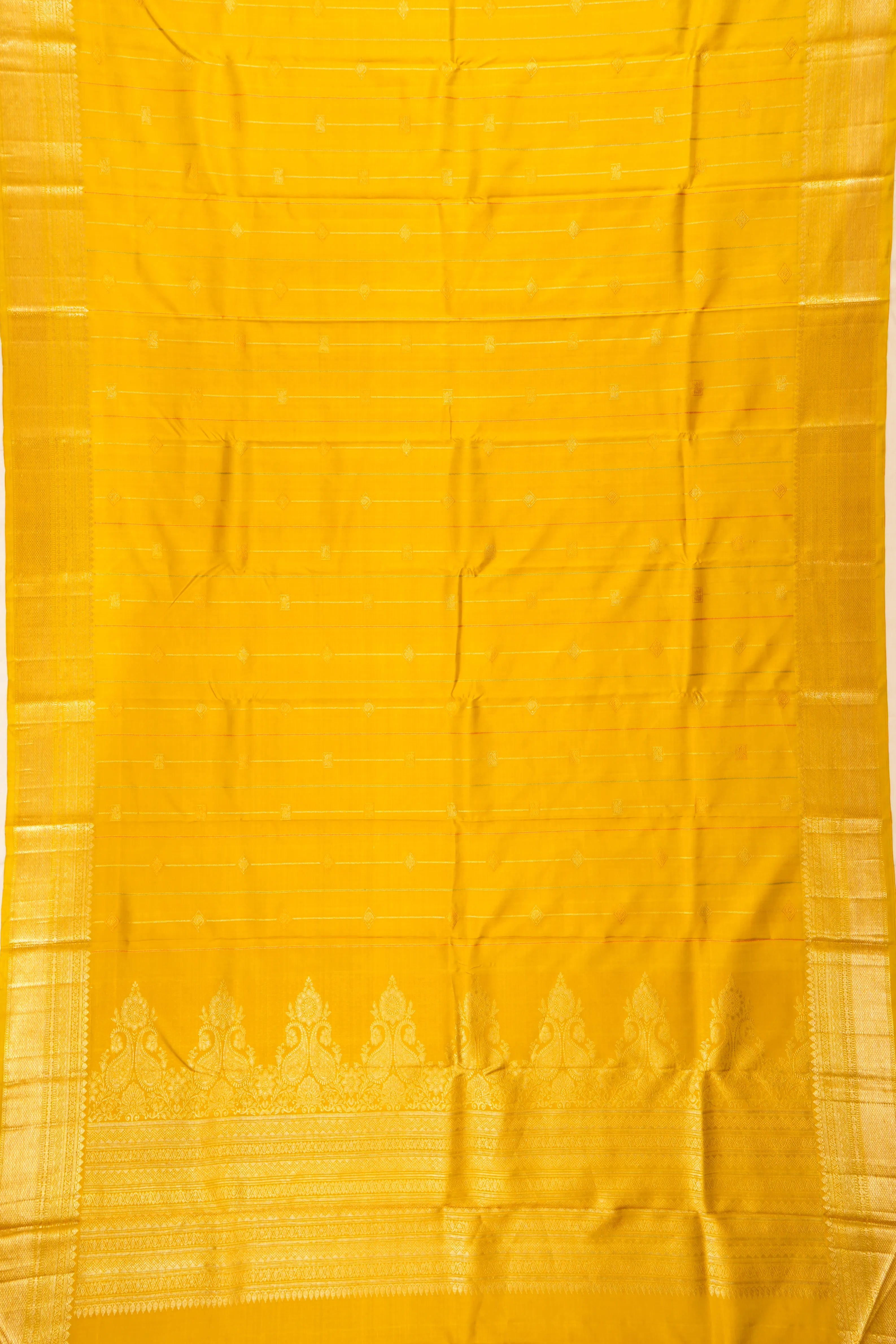 Glowing in a radiant yellow tone, the body is adorned with gold zari vertical lines, lending a graceful structure and luminous finish.