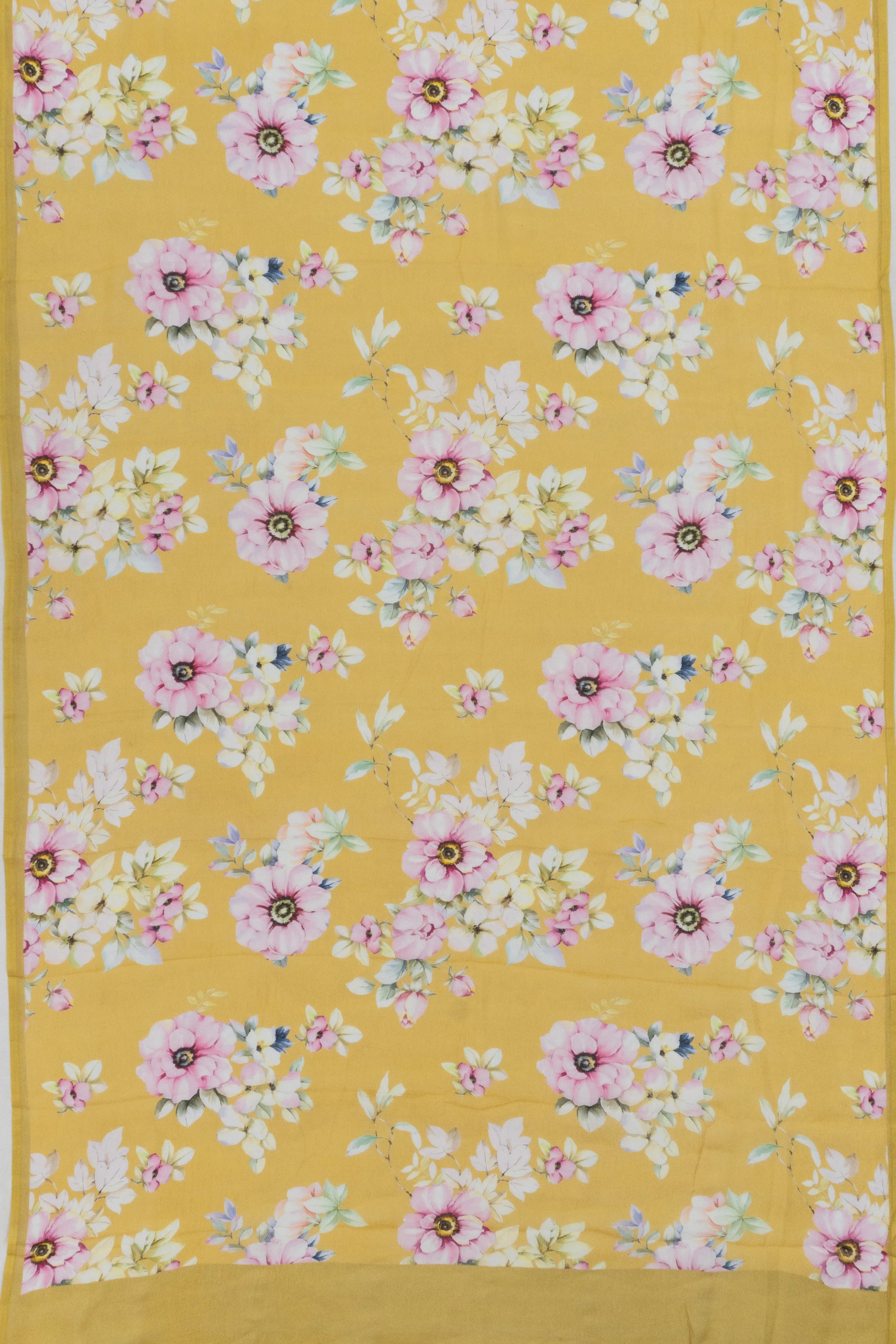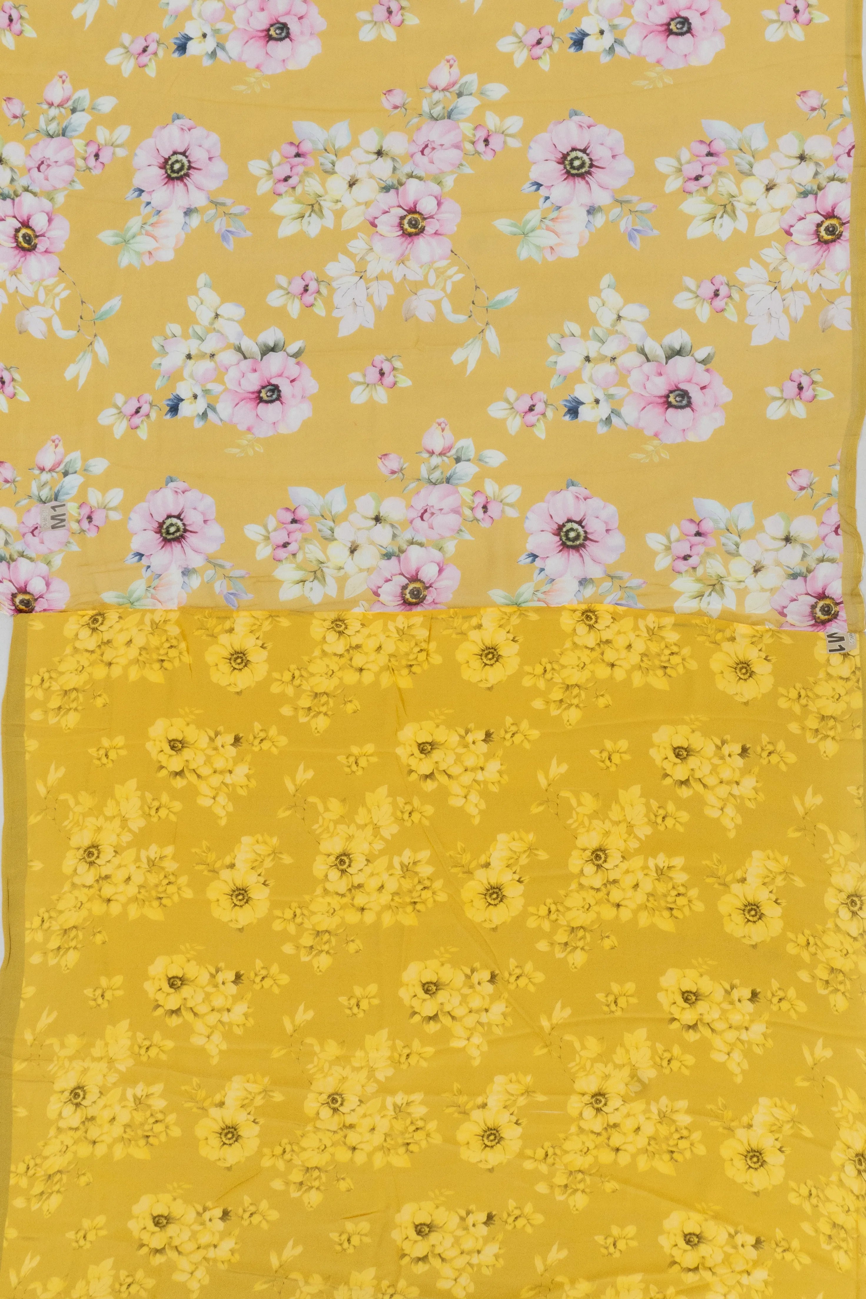 The saree's body is adorned with delicate floral prints, offering a graceful symphony of nature-inspired motifs that dance across the vibrant yellow fabric