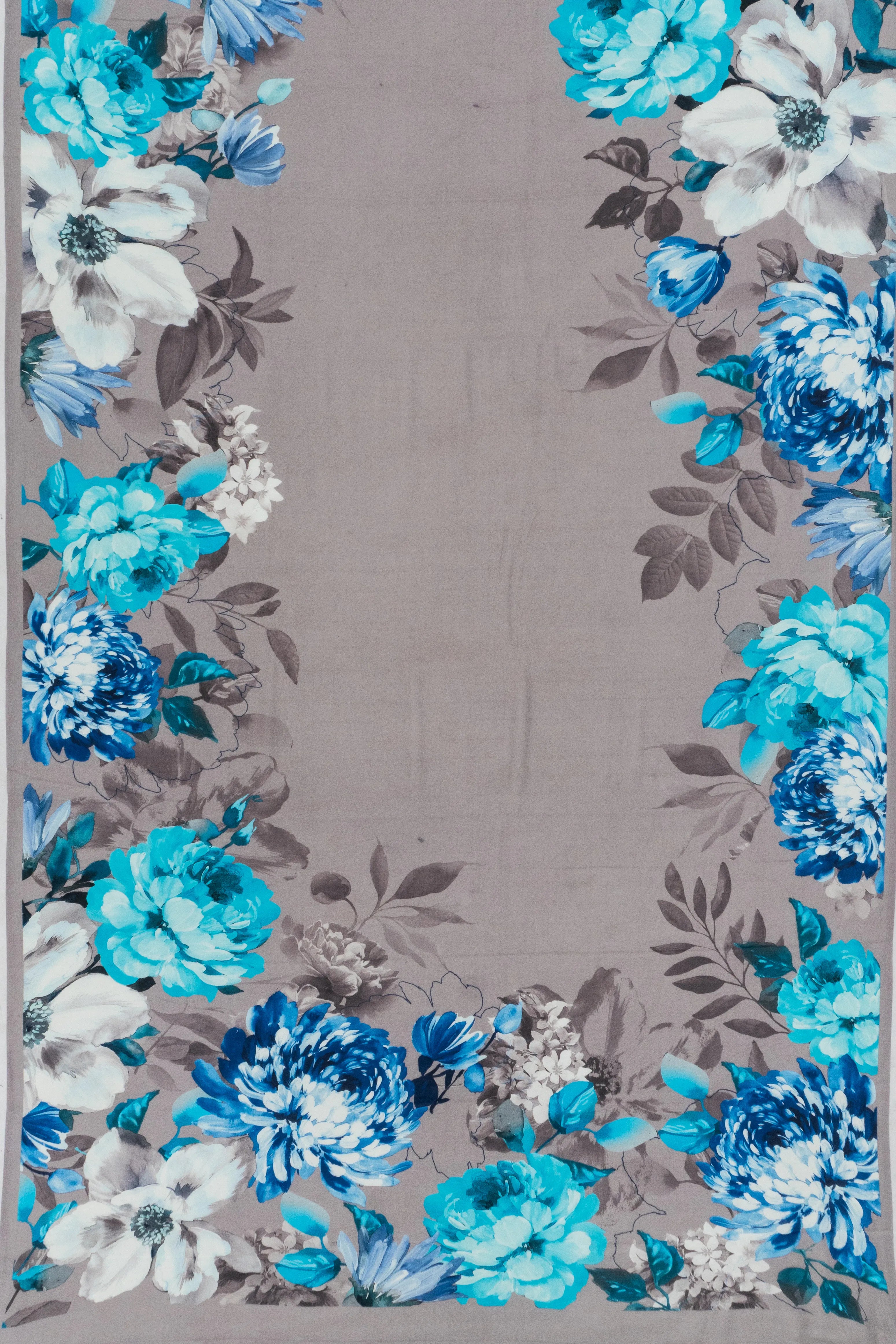 The saree's self-floral printed big border adds a touch of sophistication, seamlessly blending with the harmonious pallu, which echoes the floral theme