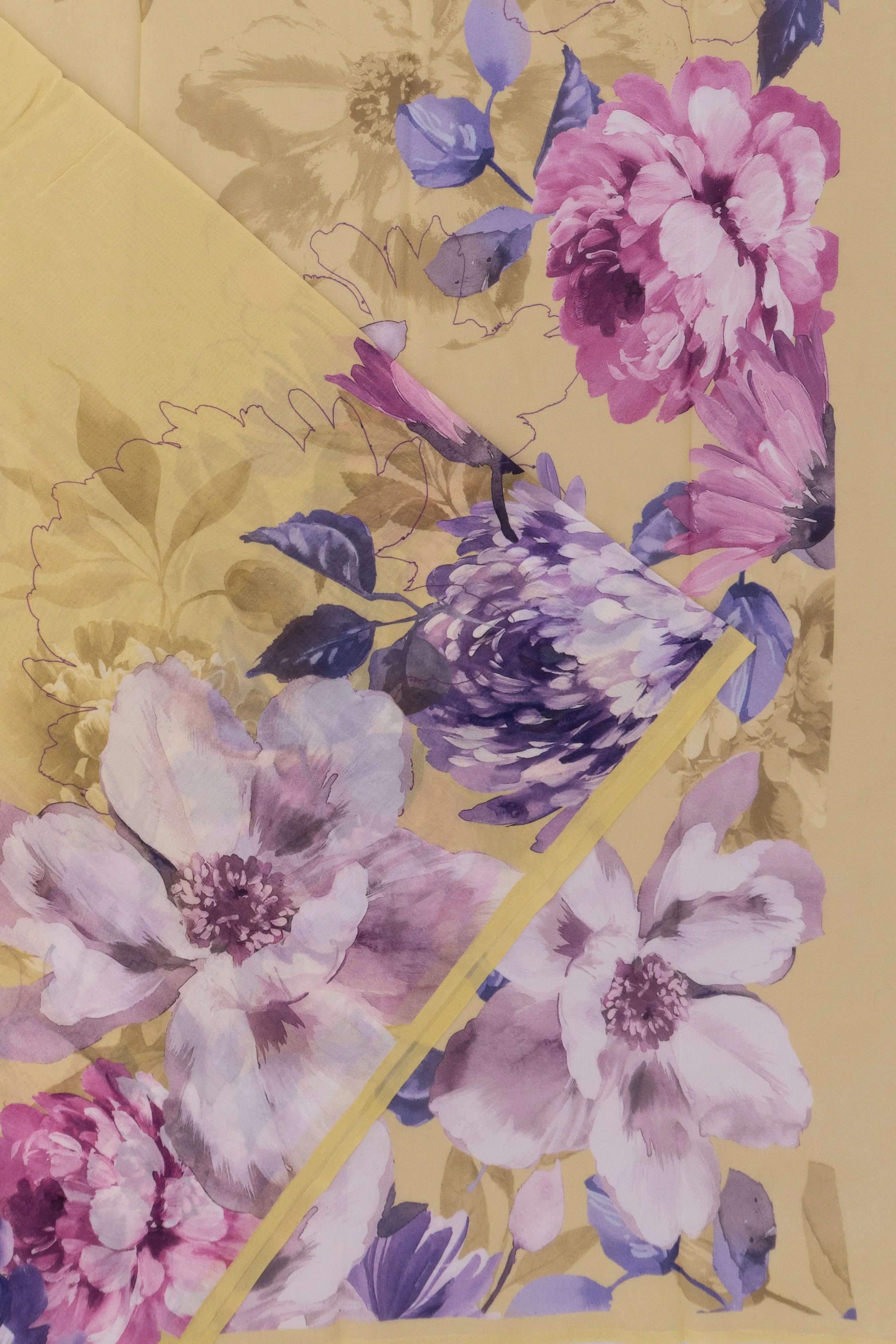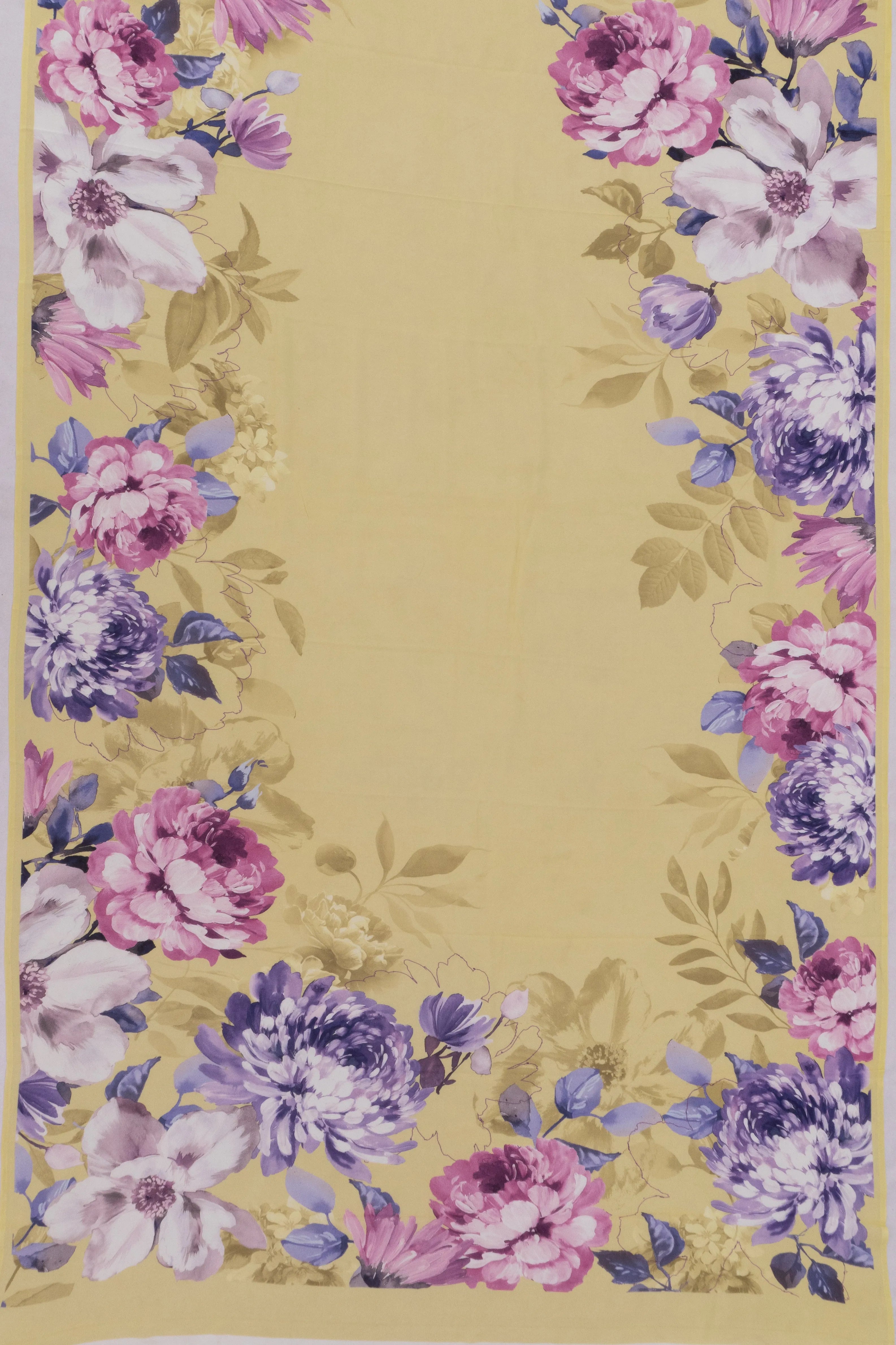 The saree features a self floral printed big border that flows into a harmonious pallu, both echoing the same intricate motifs for a unified aesthetic