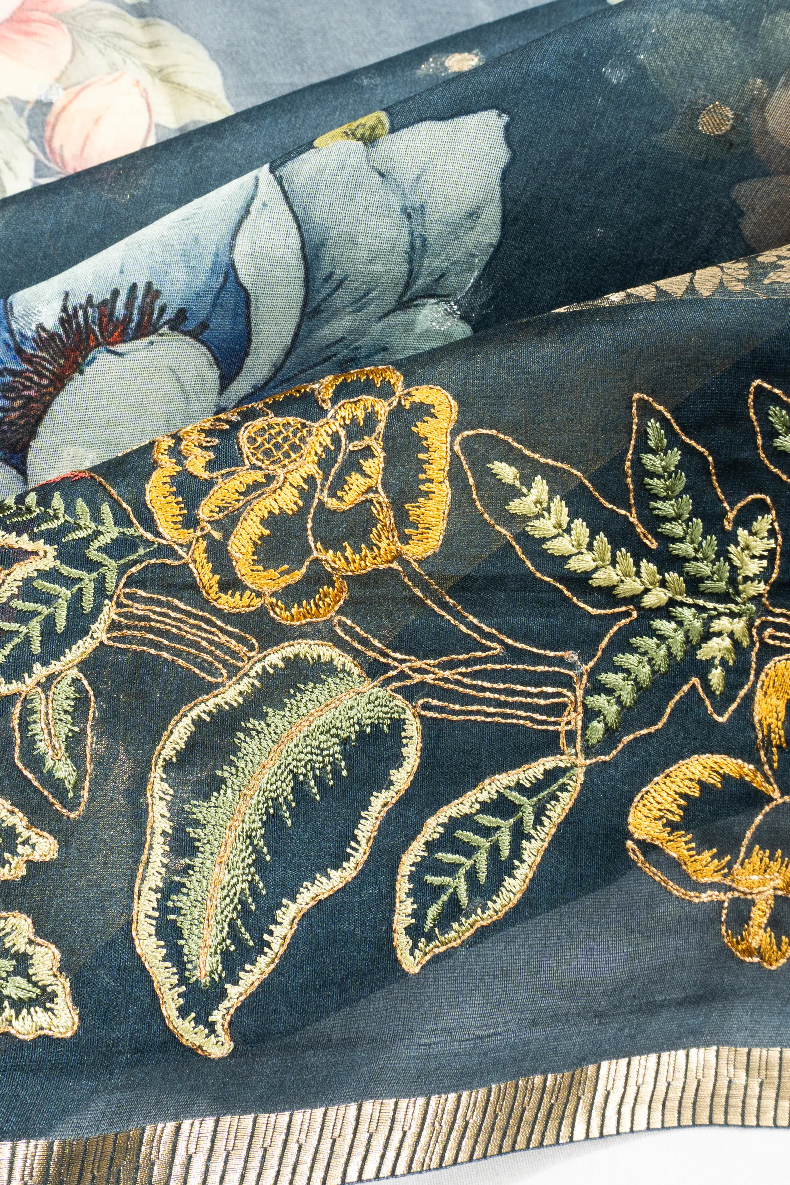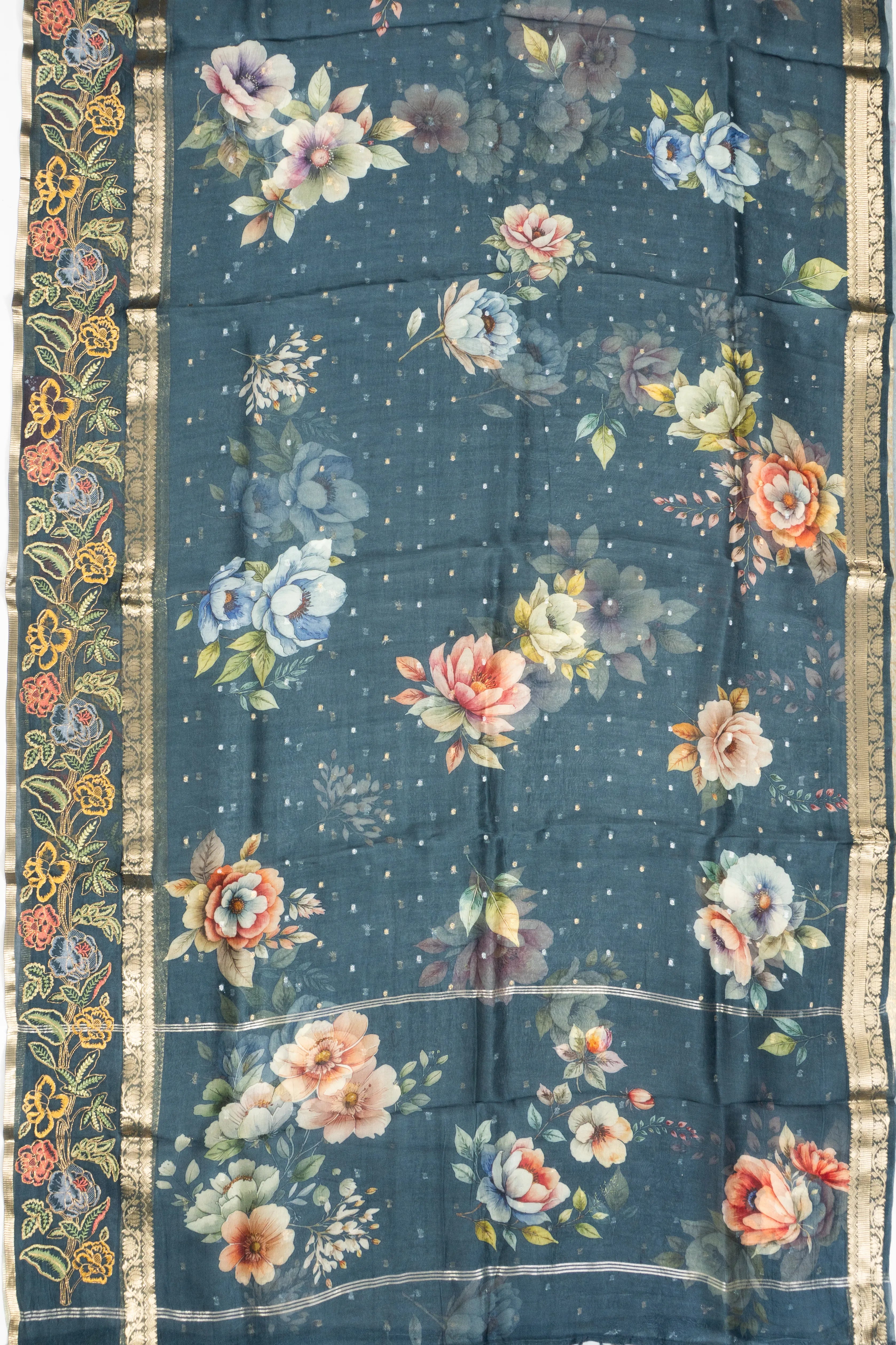 The saree's border is adorned with intricate floral prints, further enhanced by an embroidered outline, adding a touch of sophistication