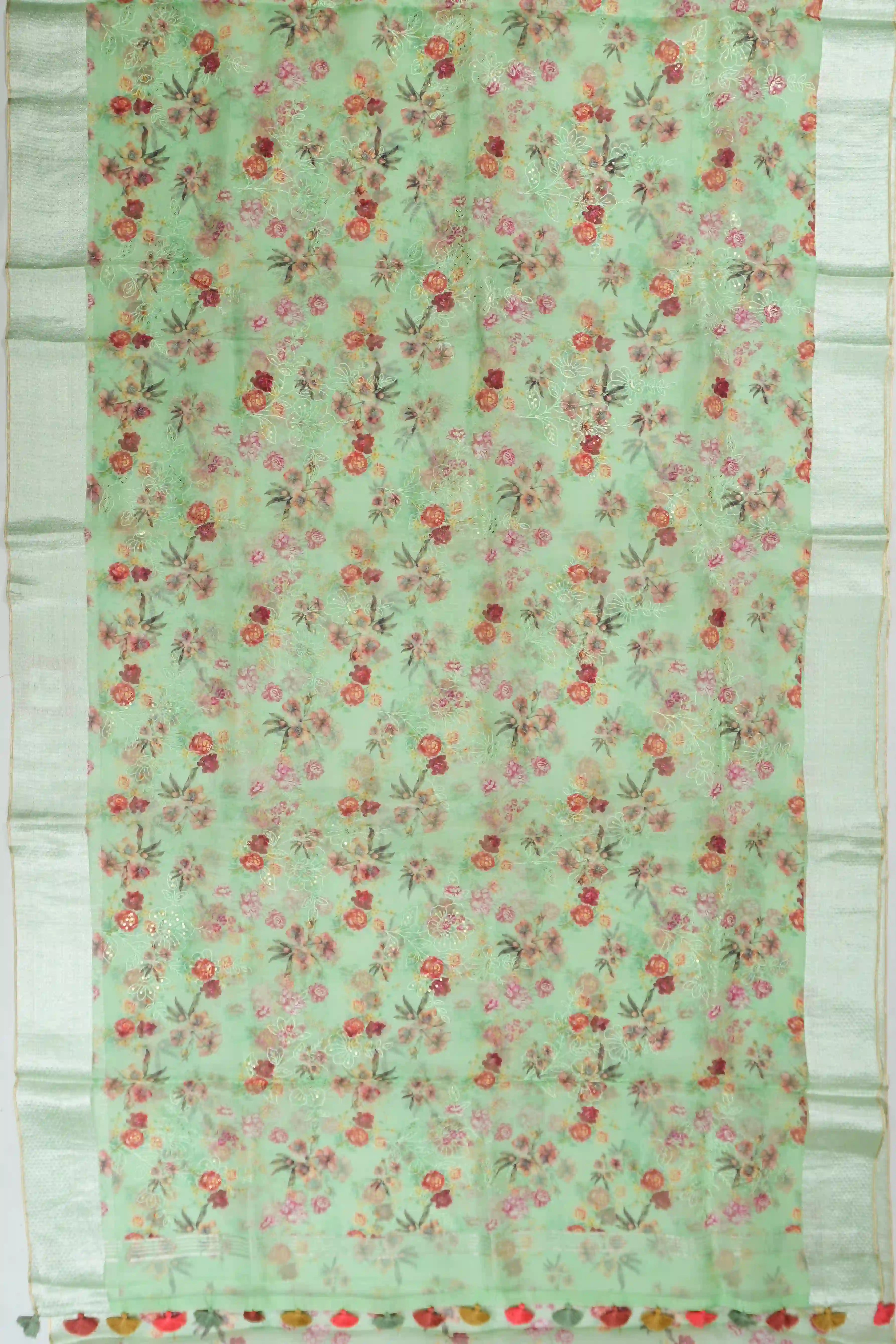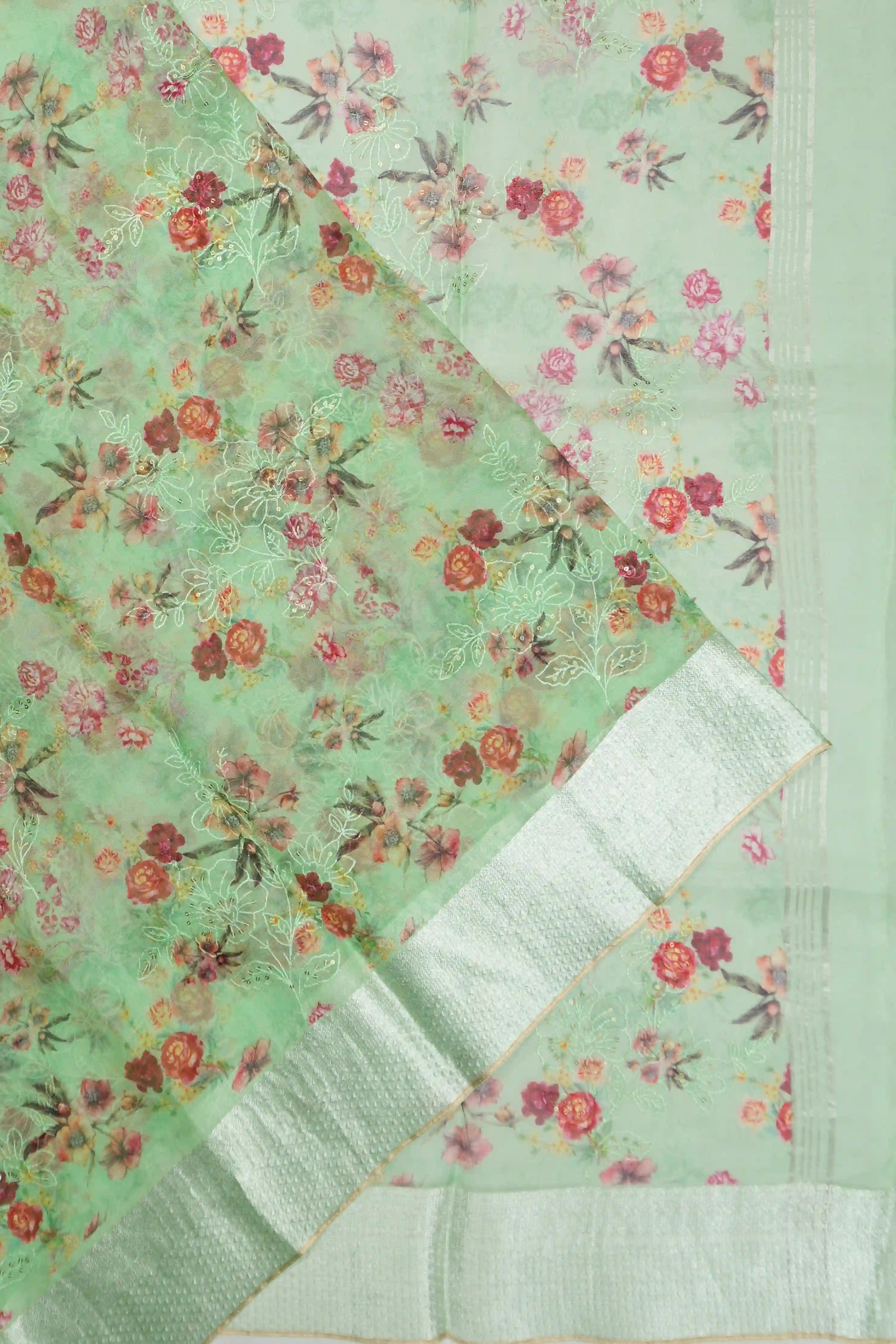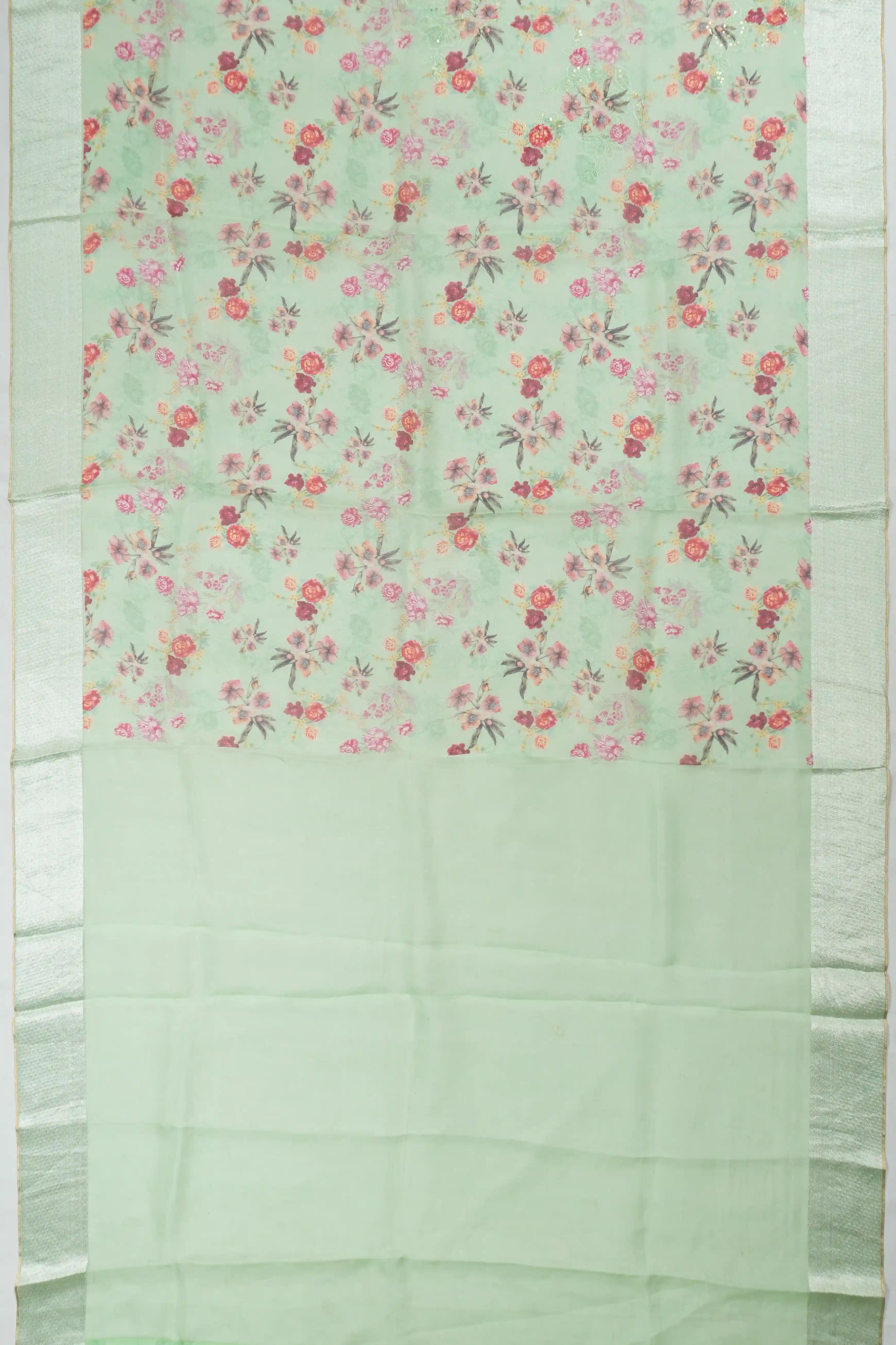 Embrace the allure of heritage with our Organza Floral Printed Sequen Pastel Green Saree, a graceful testament to traditional elegance The saree's body is adorned with delicate floral prints that dance across the fabric, adding a touch of whimsy to its sophisticated demeanor