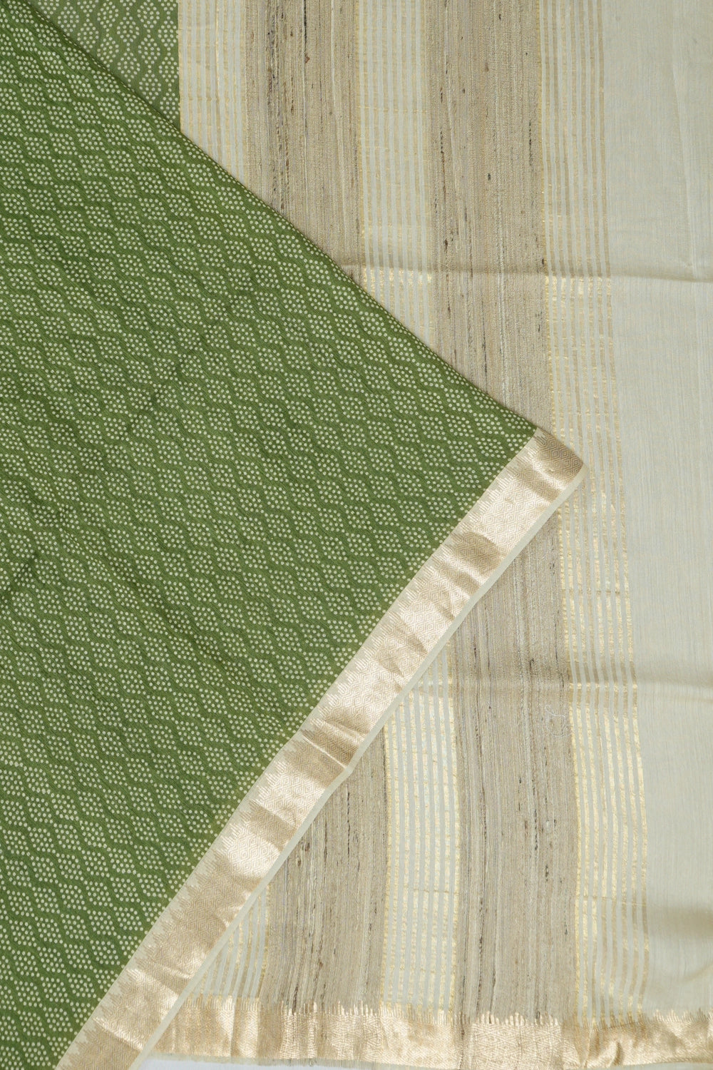 A contrast gold zari border adds a touch of opulence, featuring small, intricate designs that enhance the saree's graceful appeal