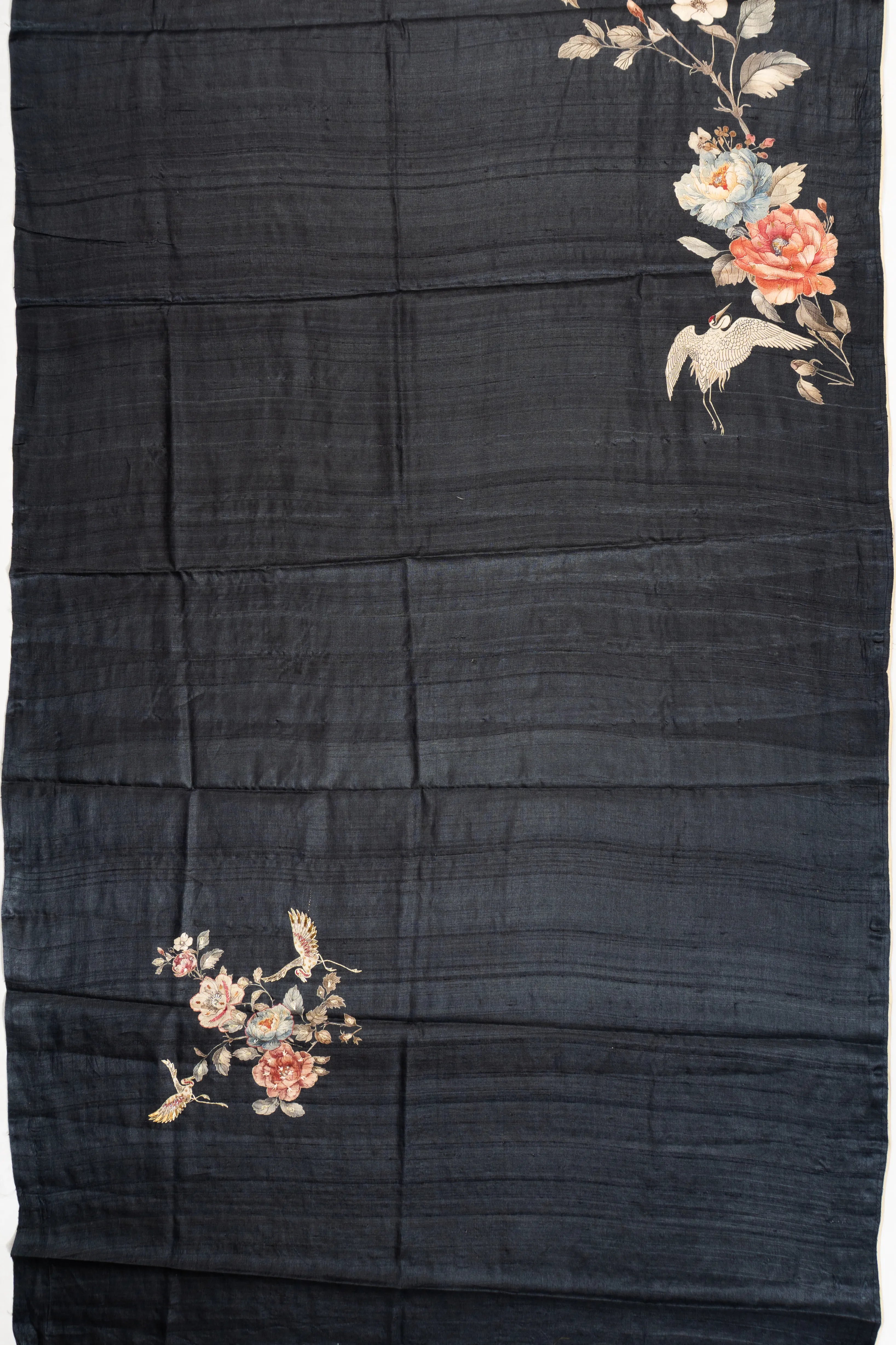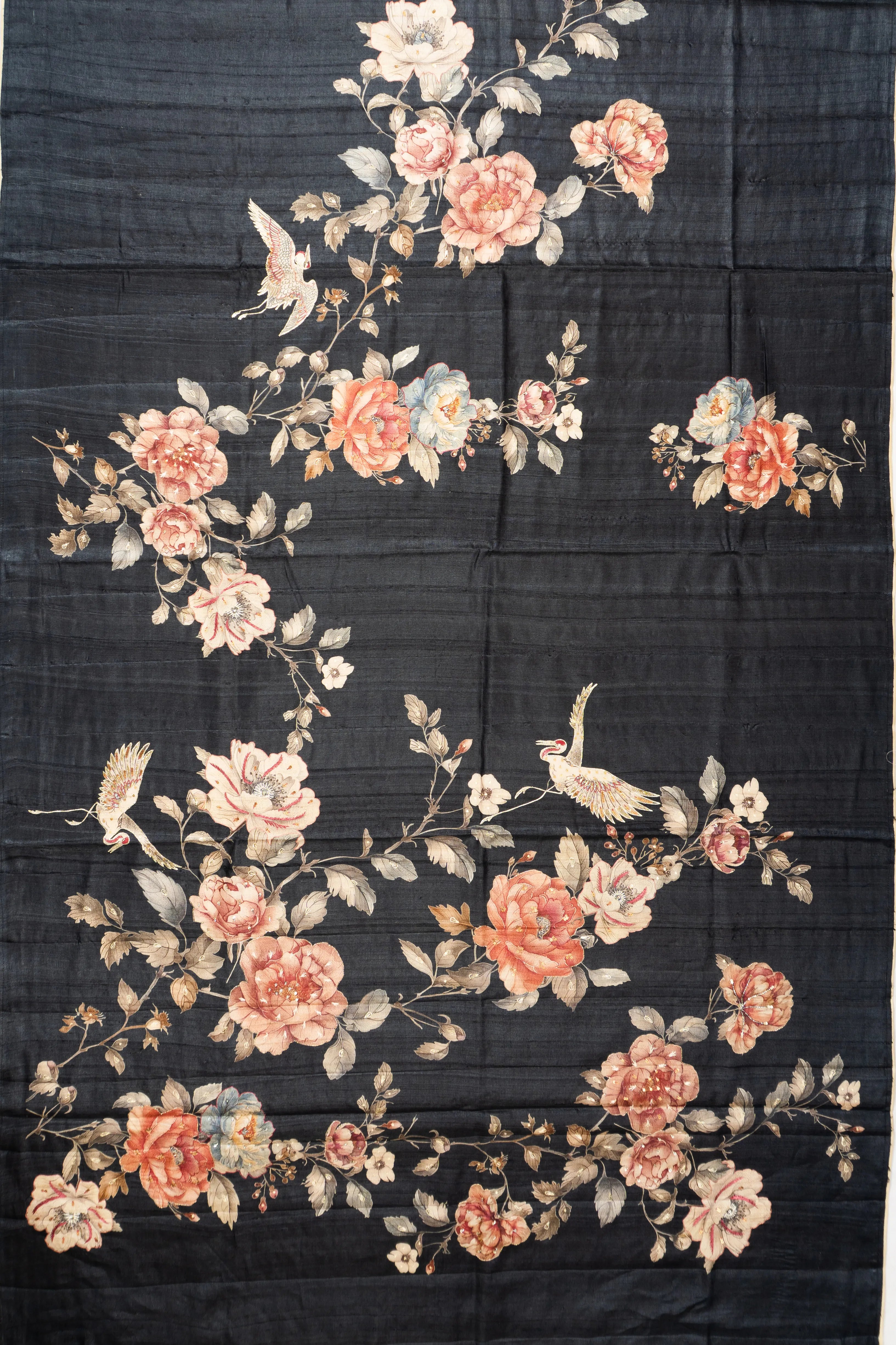 Its body is adorned with exquisite floral prints, enhanced by delicate sequins and embroidered outlines, capturing the essence of timeless sophistication