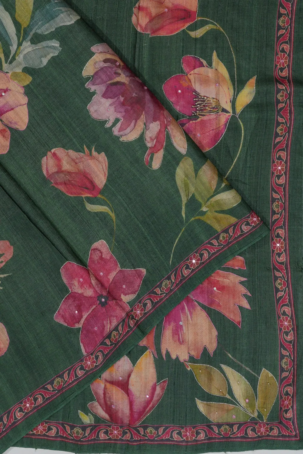 The body of the saree is adorned with intricate prints that echo the lushness of nature, creating a serene yet striking appearance