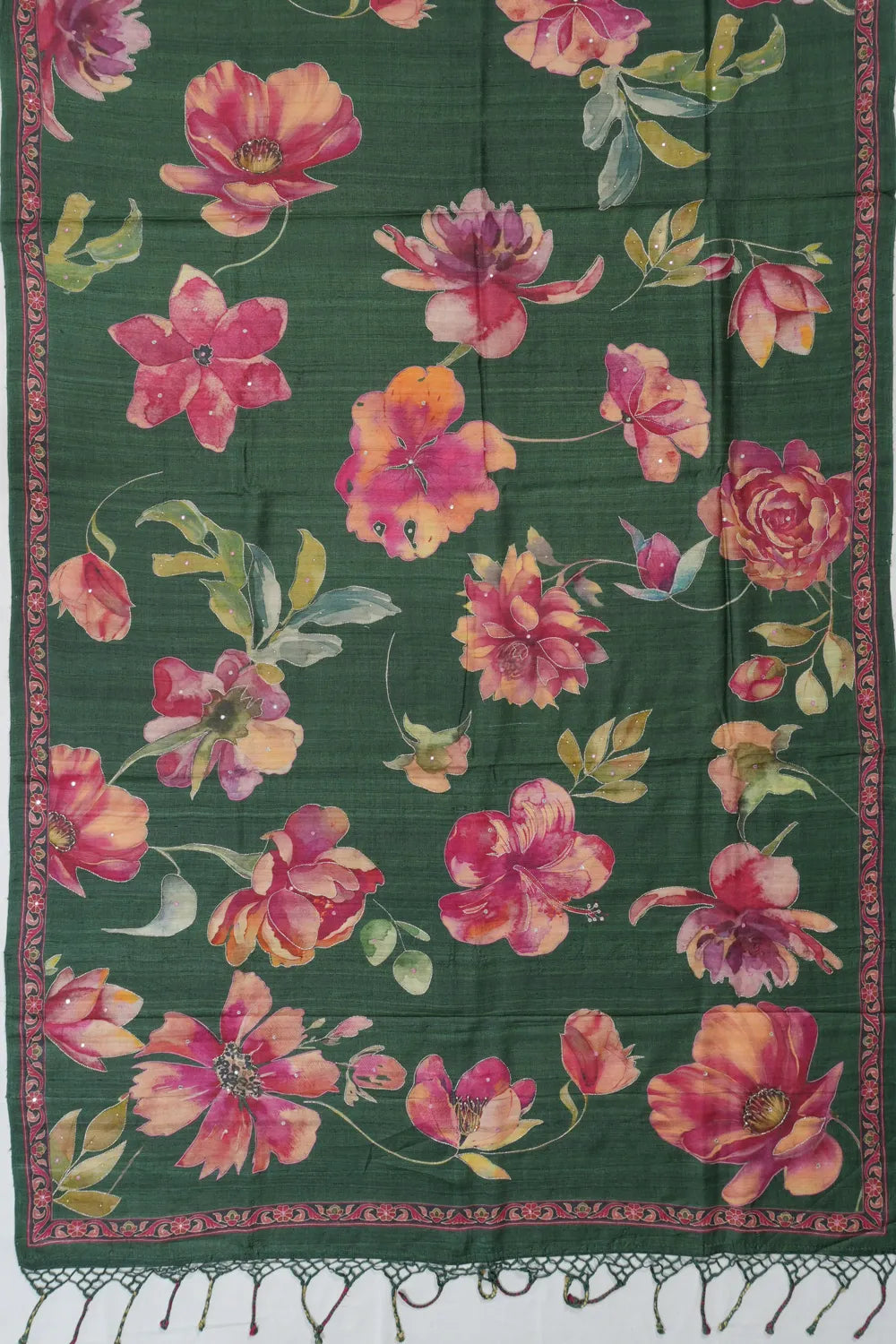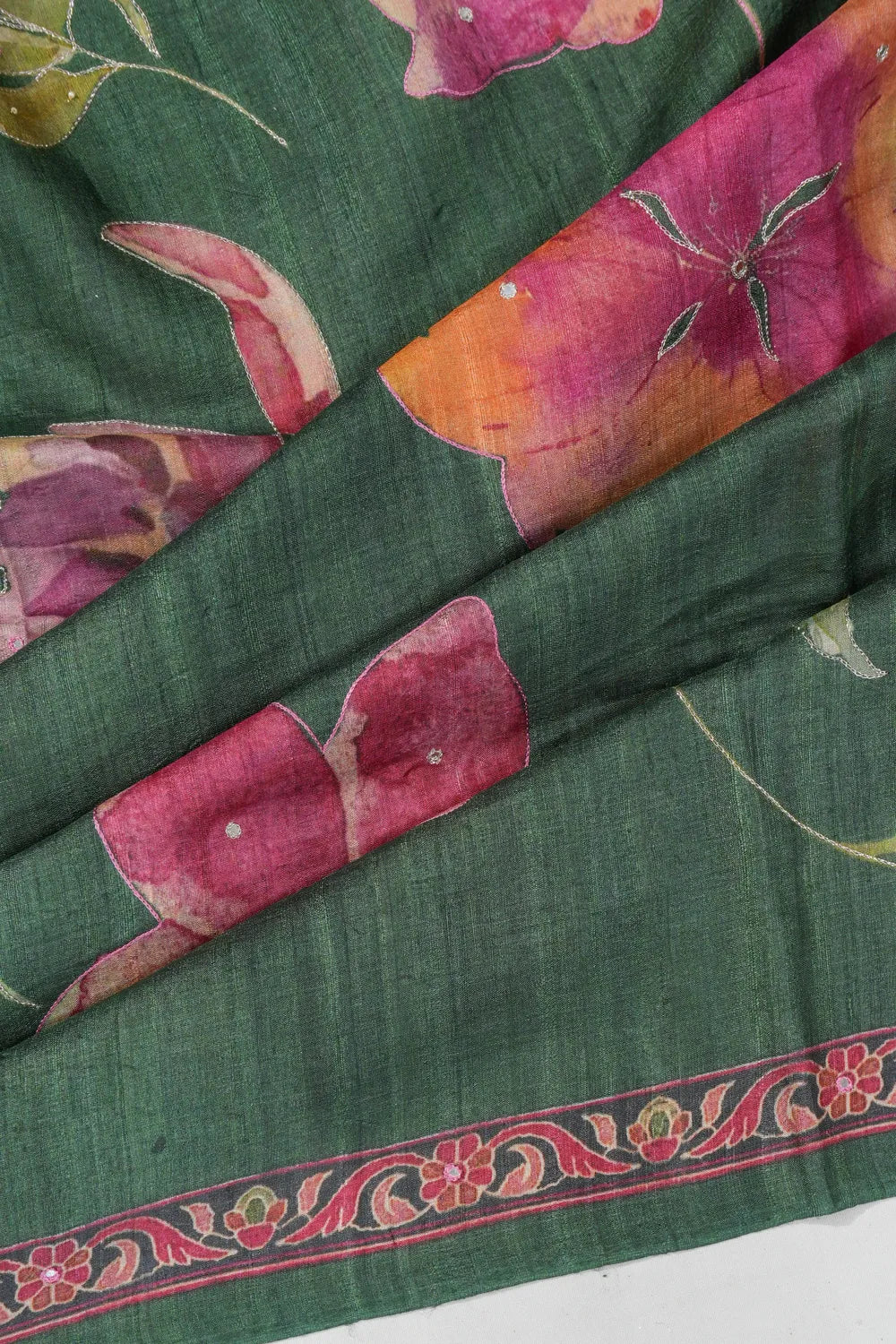 The saree features a self-printed small border, offering a seamless flow of its beautiful green hue