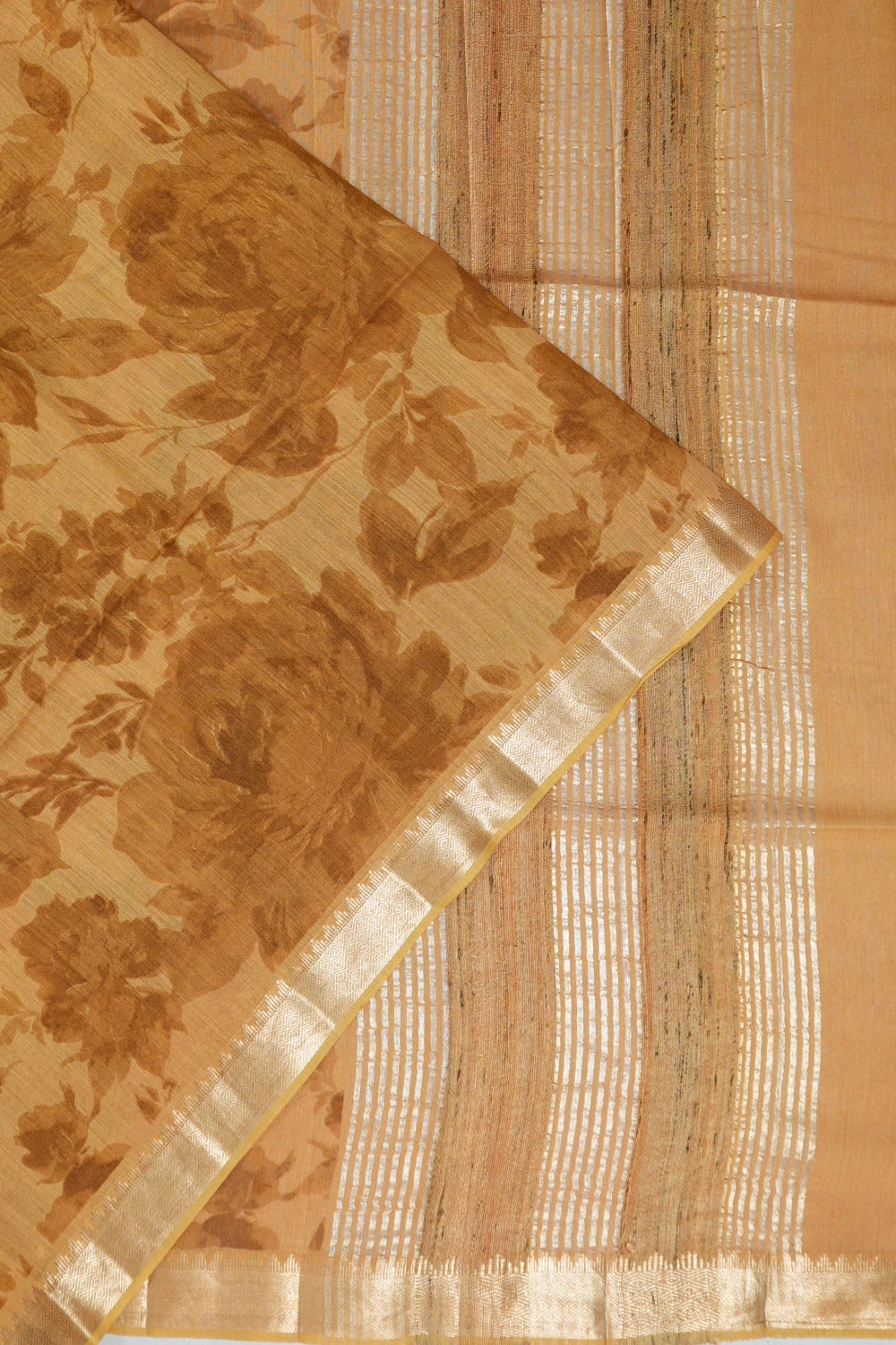 The saree's subtle brown hue is enriched with delicate prints, providing a canvas of timeless sophistication and charm