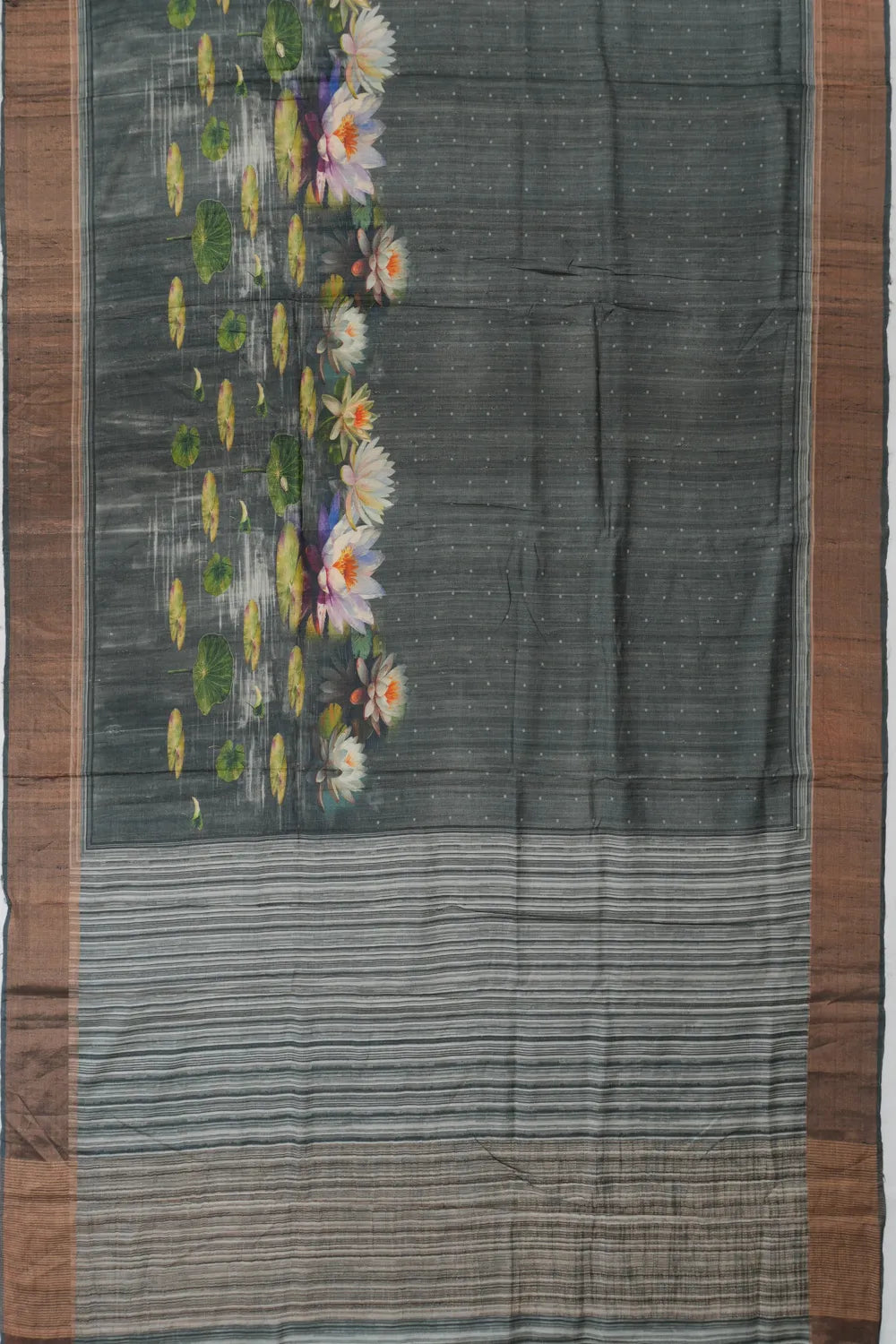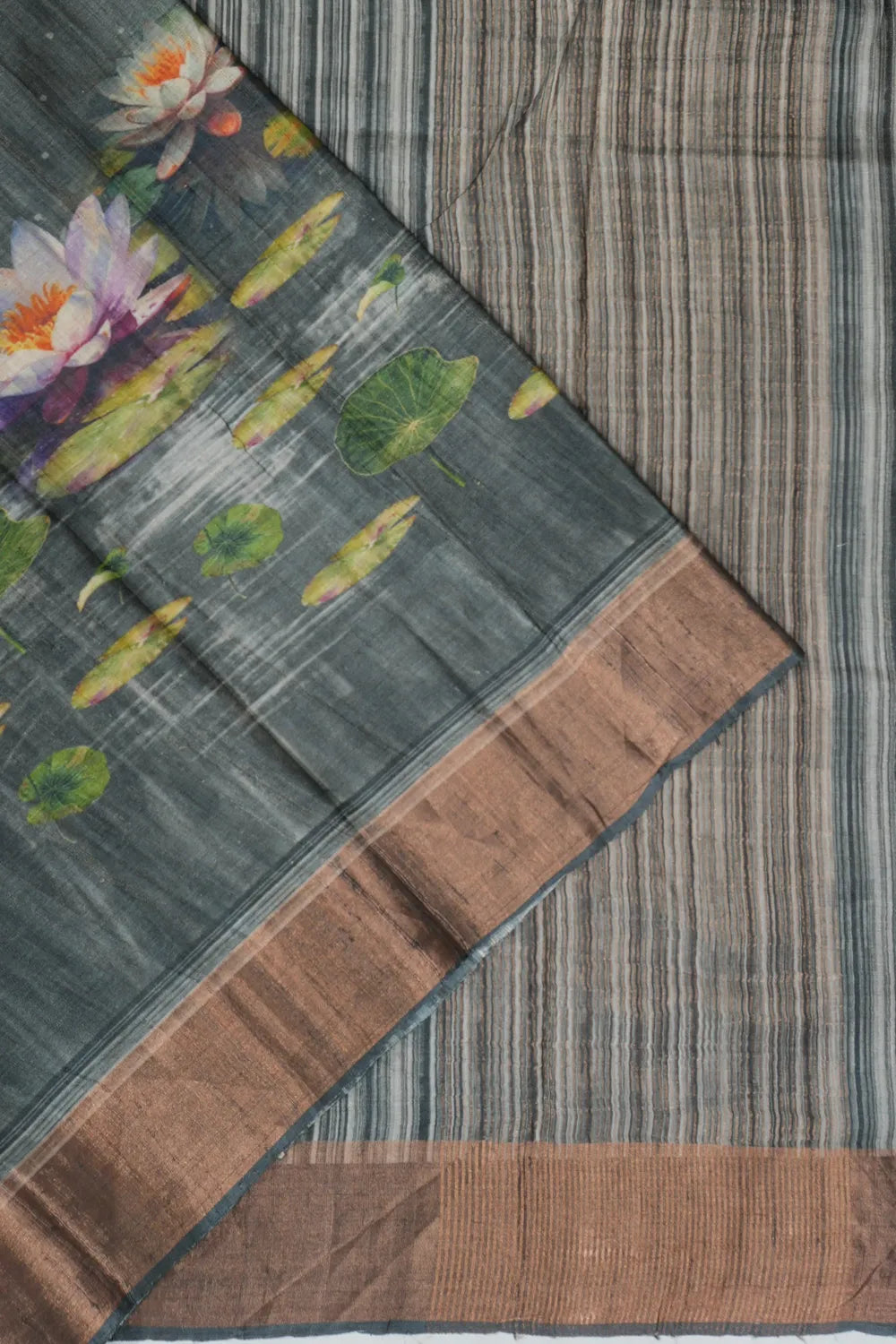 The body of the saree features a harmonious blend of green hues, enhanced by the soft sheen of tussar silk that offers a graceful drape