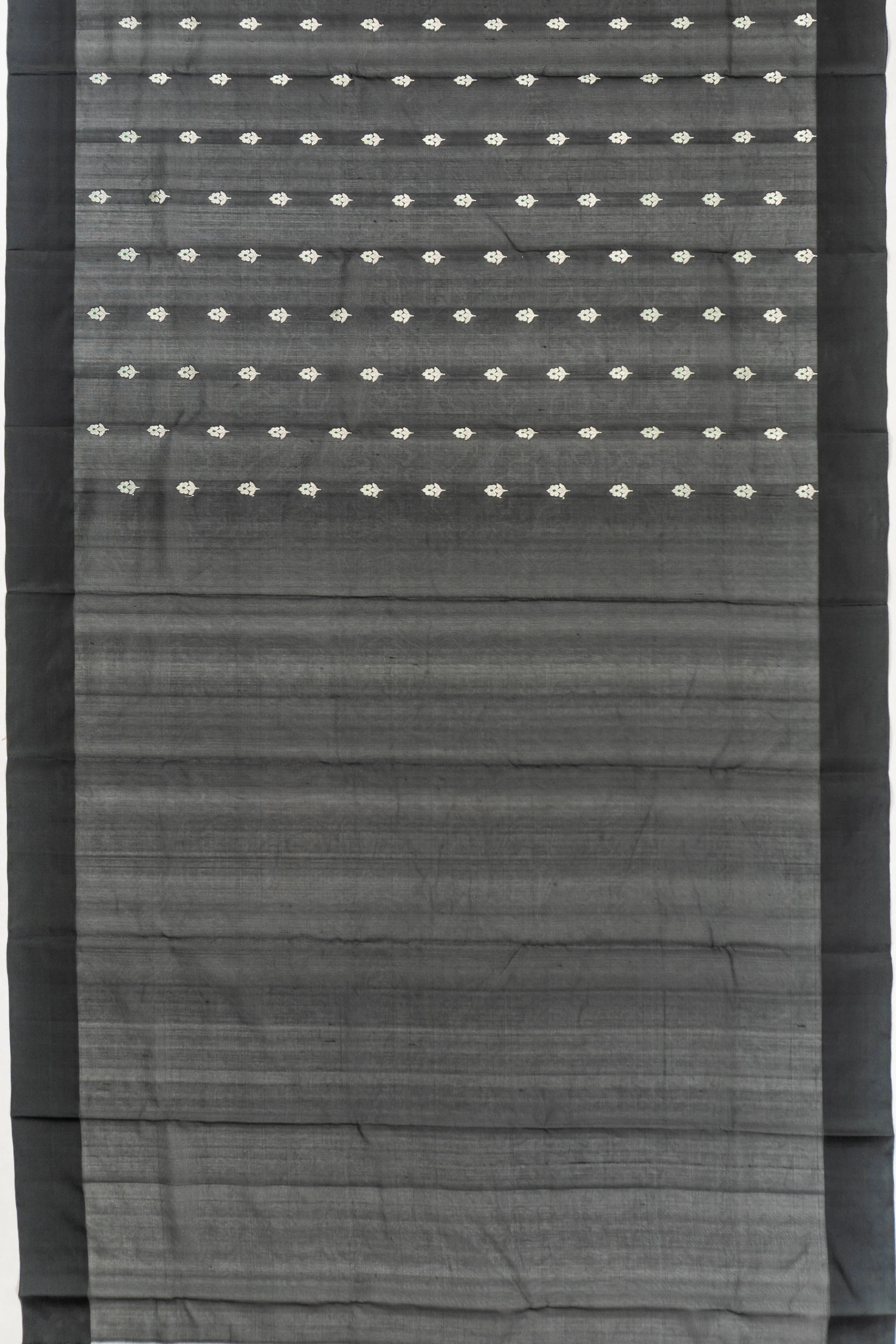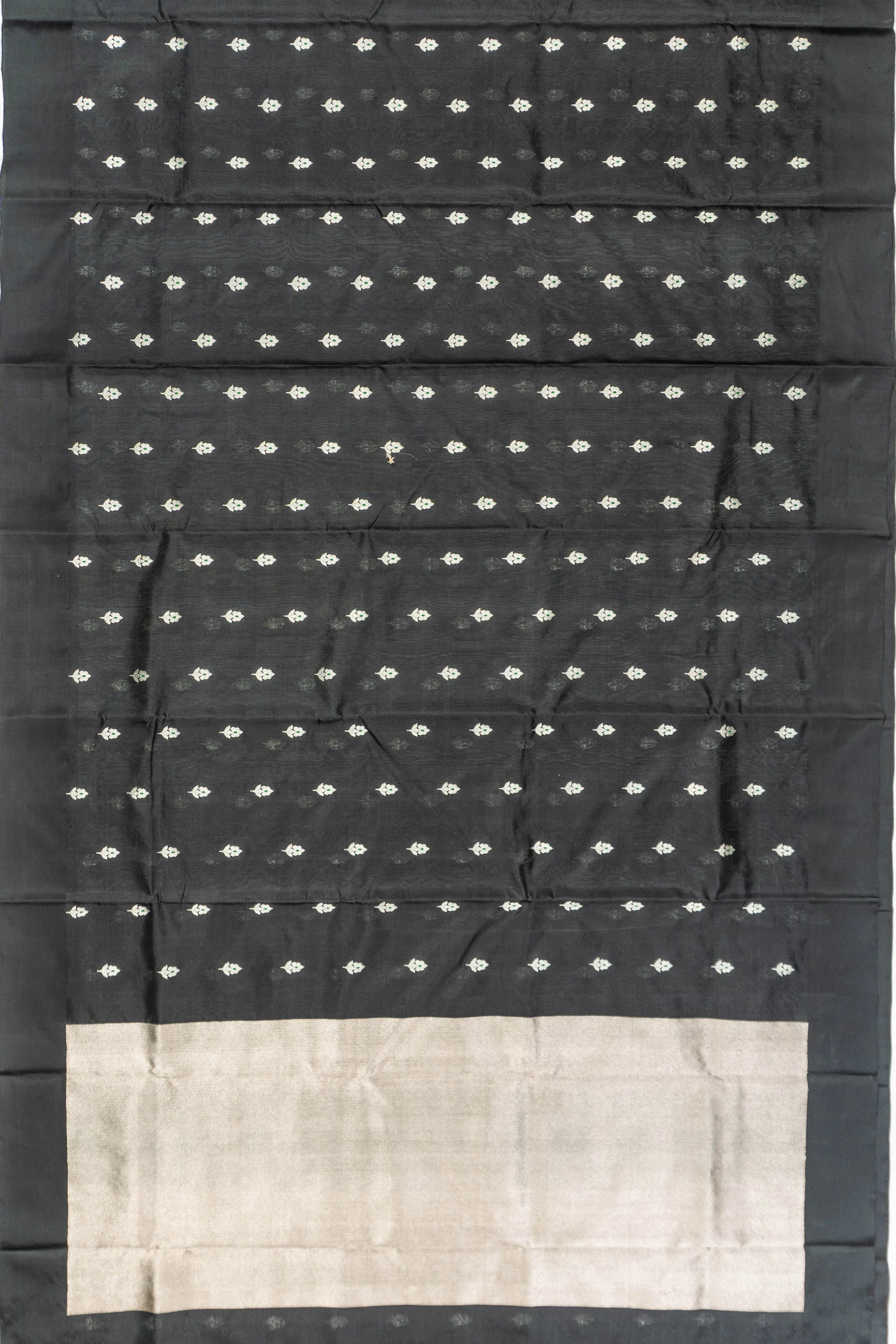 Its body is adorned with silver zari floral buttas, adding a touch of grace and sophistication that shimmers subtly against the deep black silk