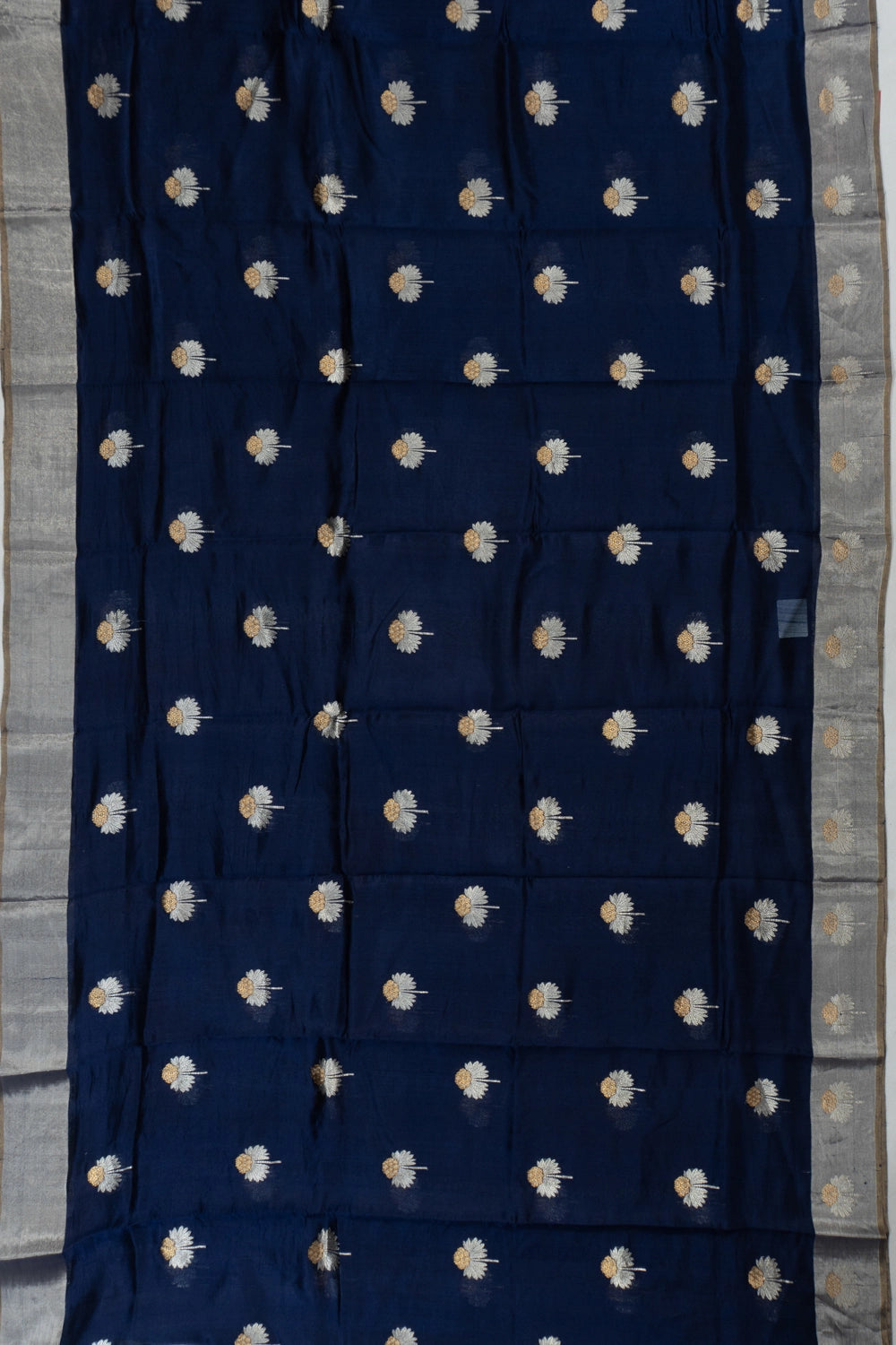 Elevate your ensemble with the self silver zari kaddi border, enhanced by intricate buttas, offering a harmonious finish that complements the saree's rich blue hue