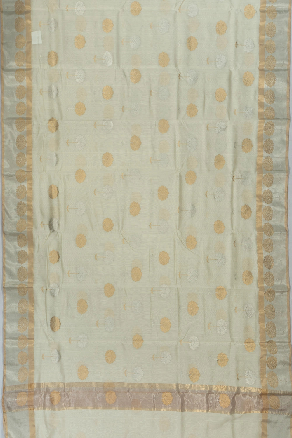 The saree's body features delicate silk buttas, accentuating its graceful charm and understated sophistication