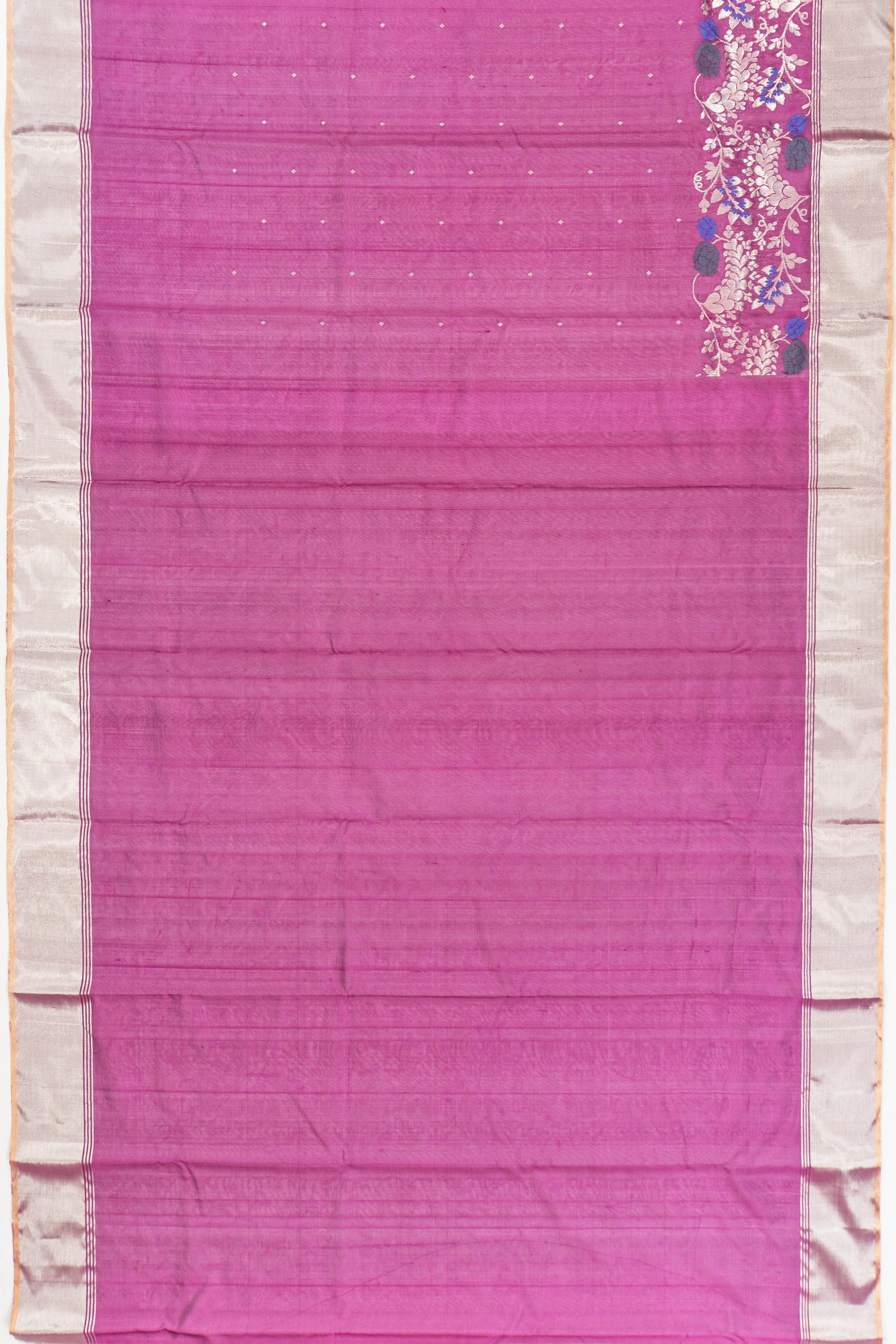 The saree's body is adorned with exquisite silver zari floral buttas, accompanied by delicate floral vines that cascade over its pleats, exuding a blend of elegance and tradition