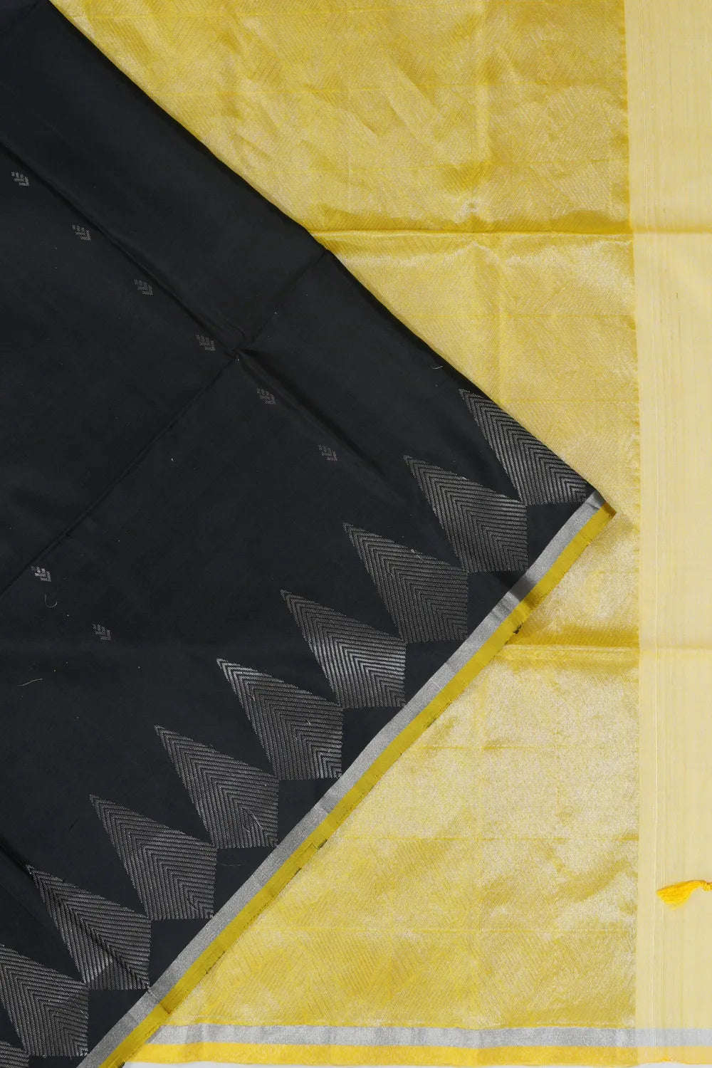 A harmonious contrast is achieved with the pallu, which is adorned in gold zari tissue yellow, radiating warmth and opulence