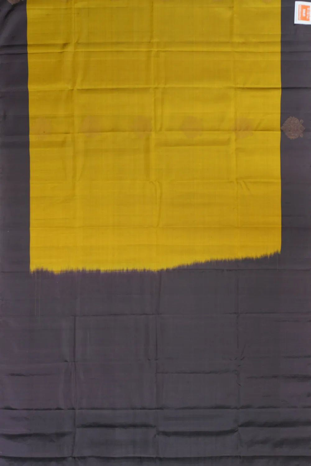The contrast black medium border features delicate zari floral buttas, offering a splendid harmony that enhances the saree's opulent appeal