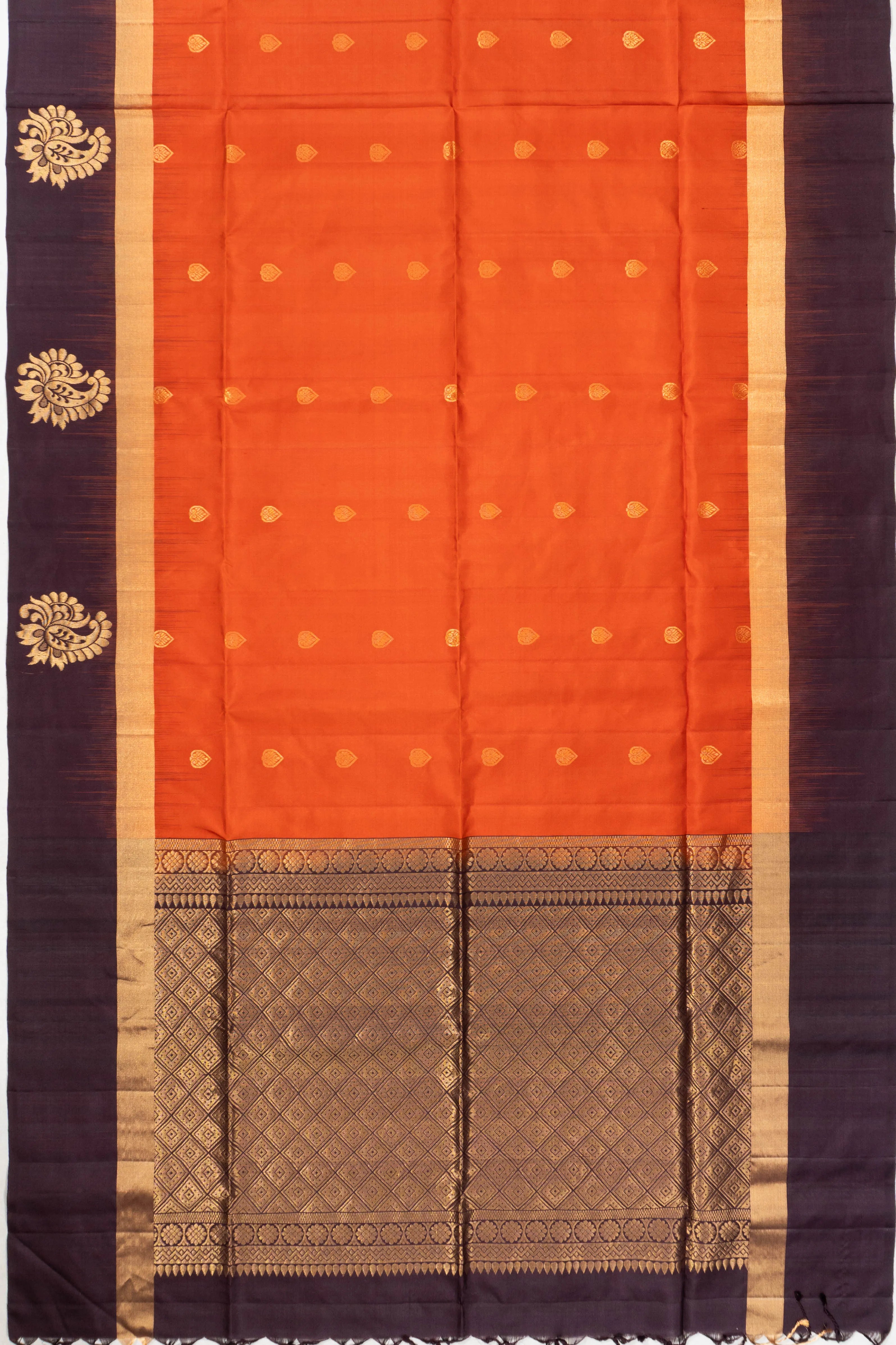 The vibrant orange hue, complemented by the shimmering gold, creates a harmonious blend of elegance and heritage-rich style