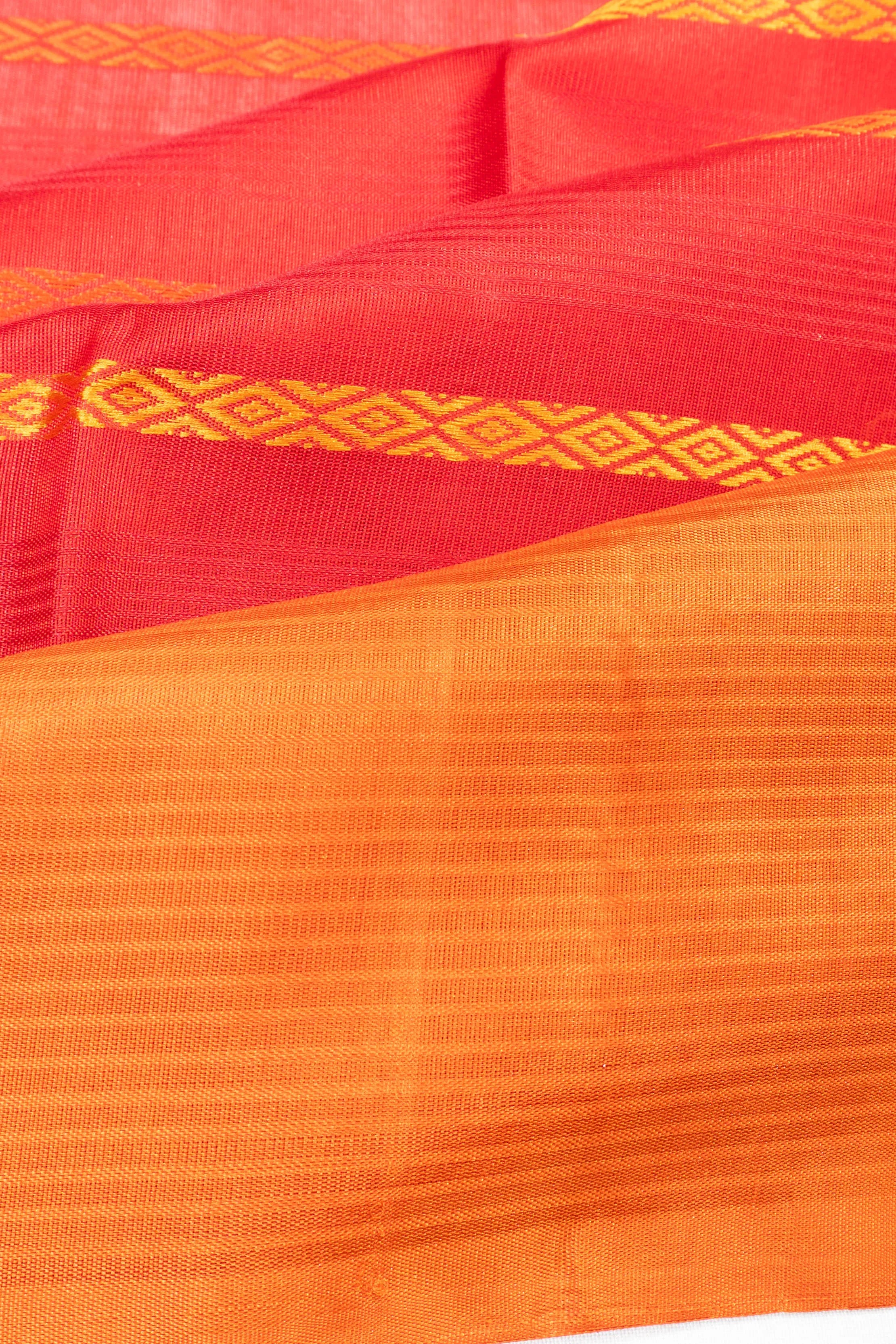 This exquisite saree is beautifully contrasted by a subtle orange border, featuring a fine gold zari line that adds a touch of refined distinction