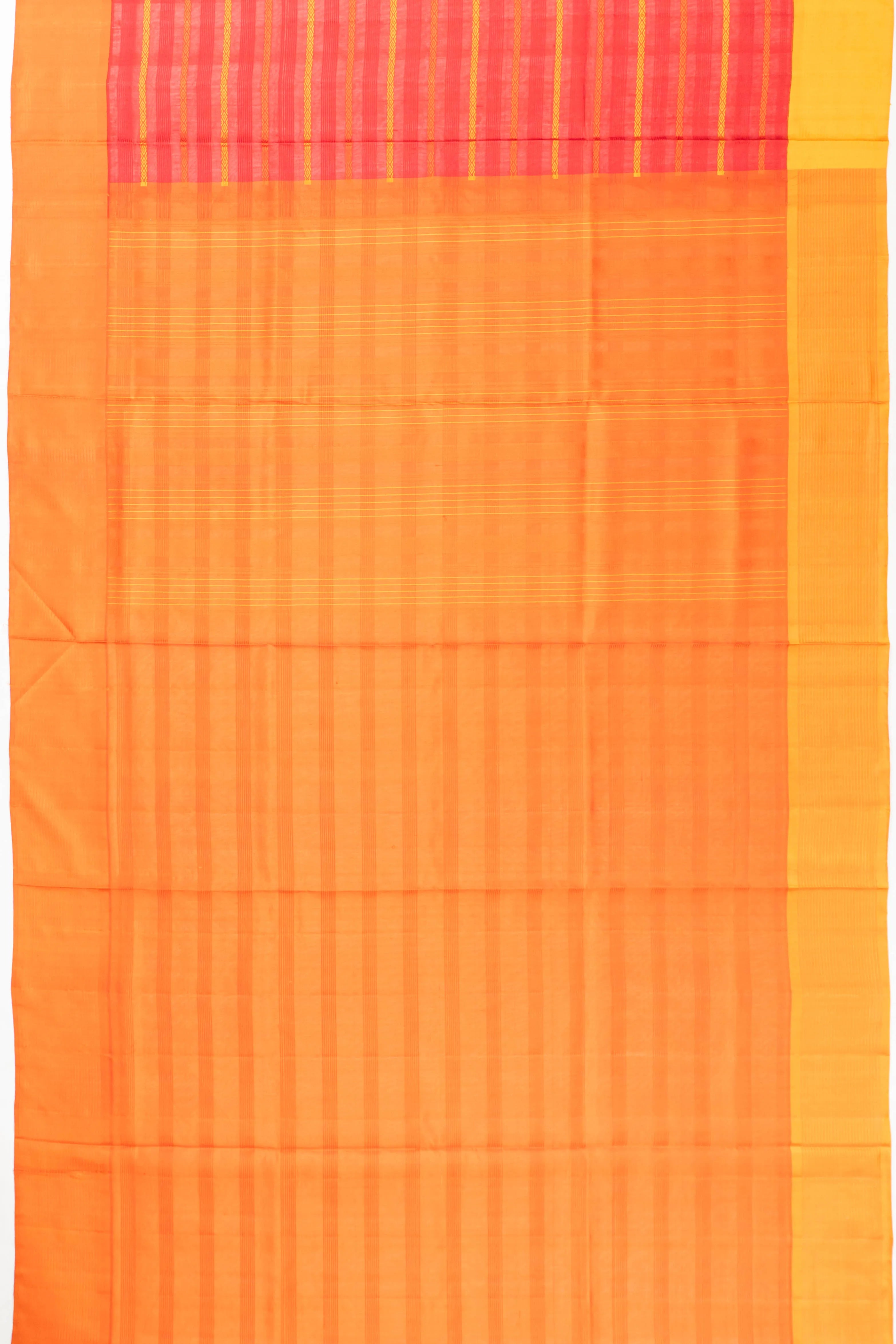 Accompanied by an orange blouse with harmonious horizontal lines, this saree offers a seamless blend of style and tradition
