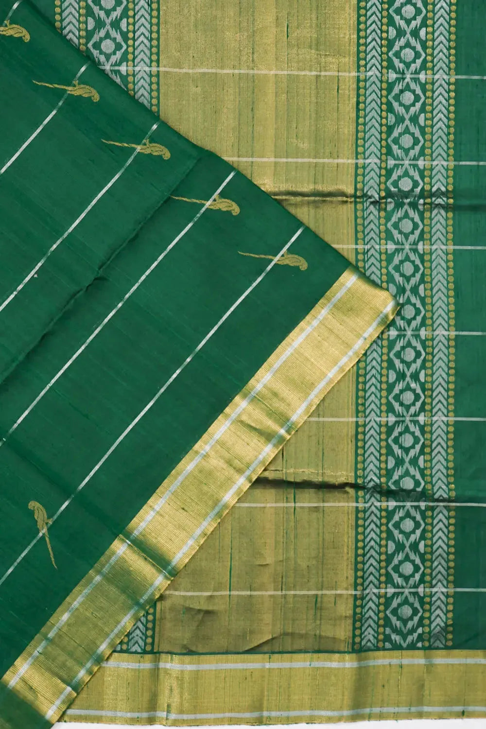 The body is adorned with exquisite gold zari parrot motifs and delicate silver zari horizontal lines, offering a blend of tradition and contemporary design