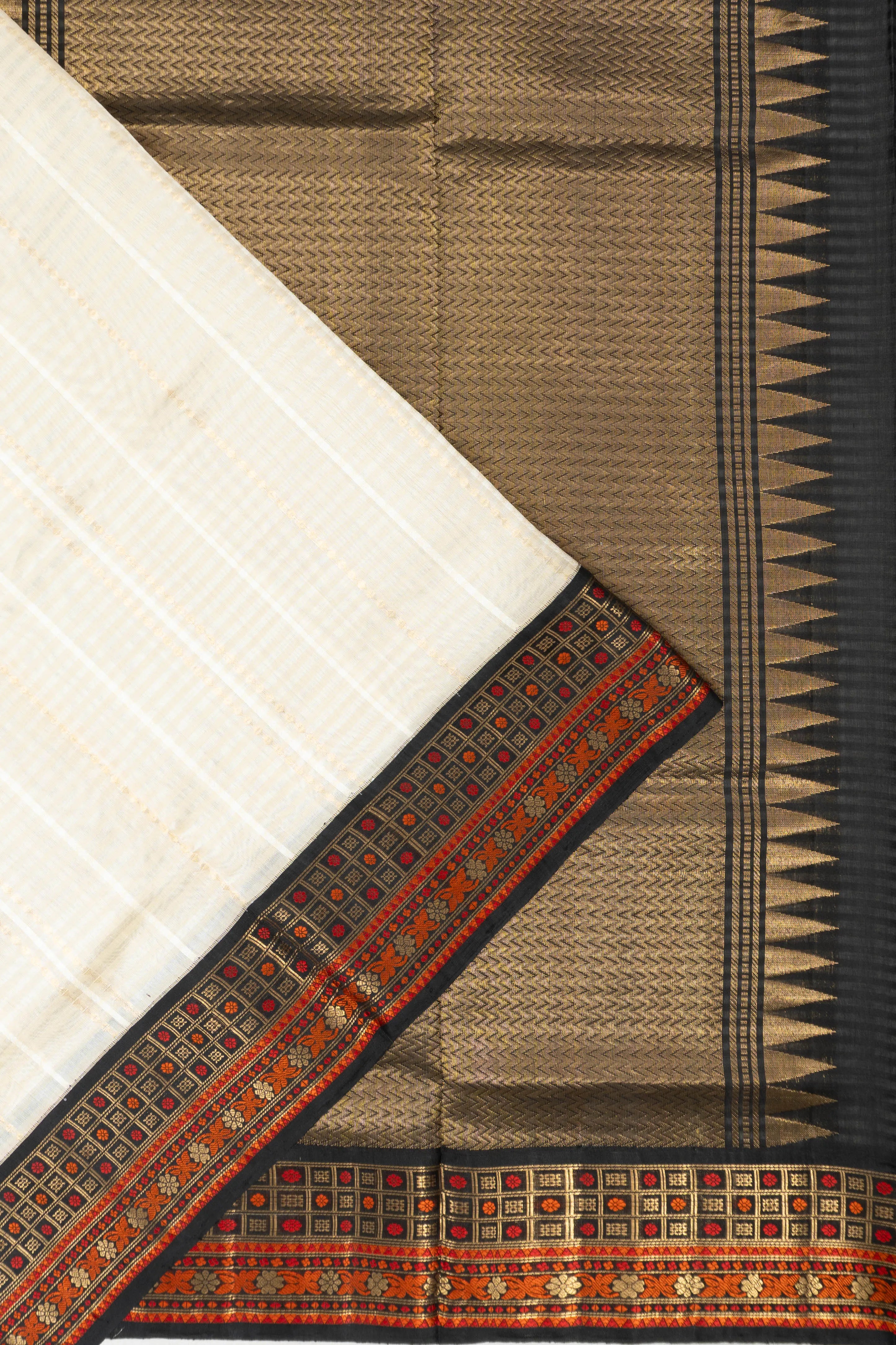 A contrasting black small border, adorned with gold zari checks and floral buttas, adds a touch of graceful sophistication