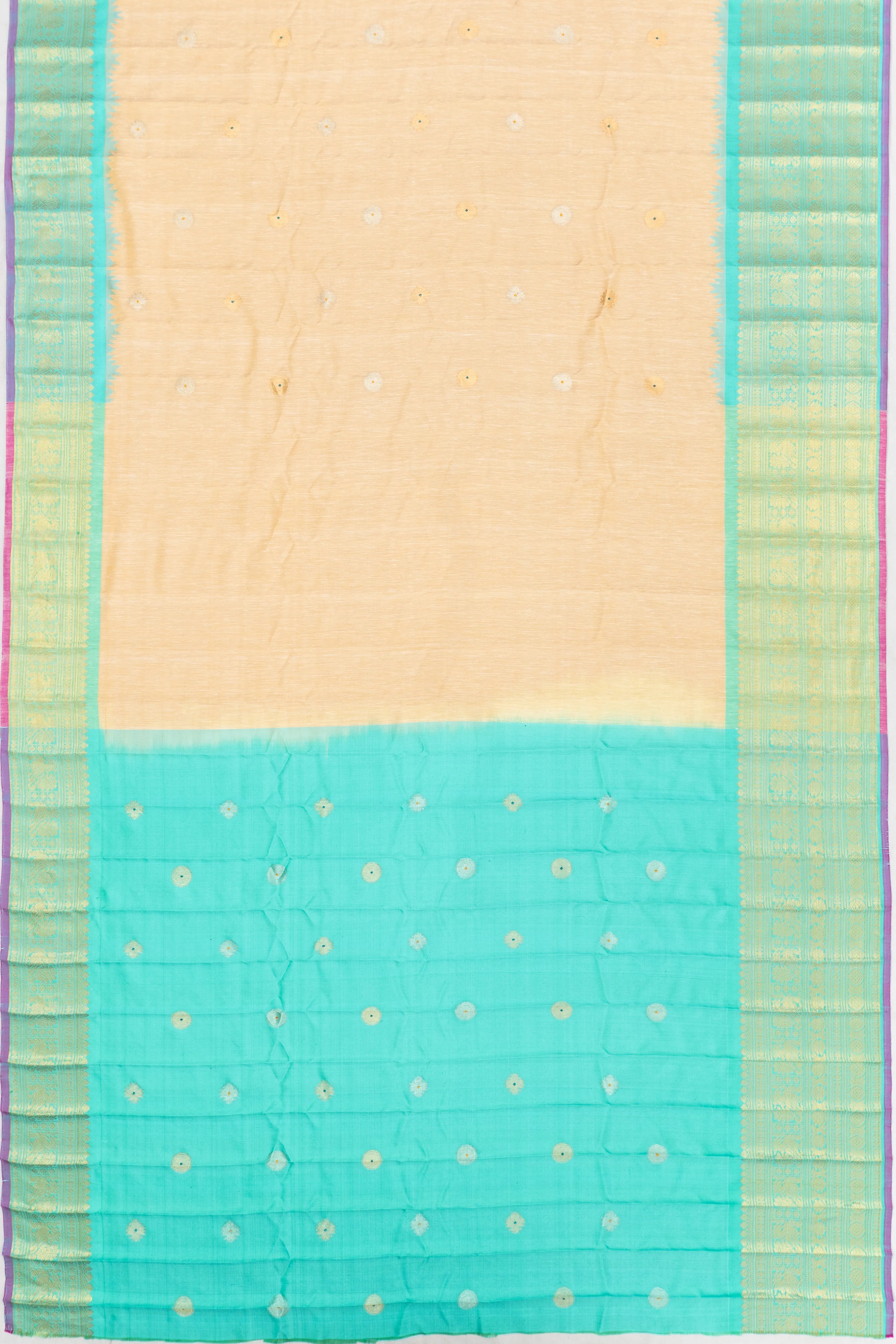 Paired with a sky blue blouse, embellished with gold and silver zari buttas and zari borders, this saree ensures a harmonious ensemble