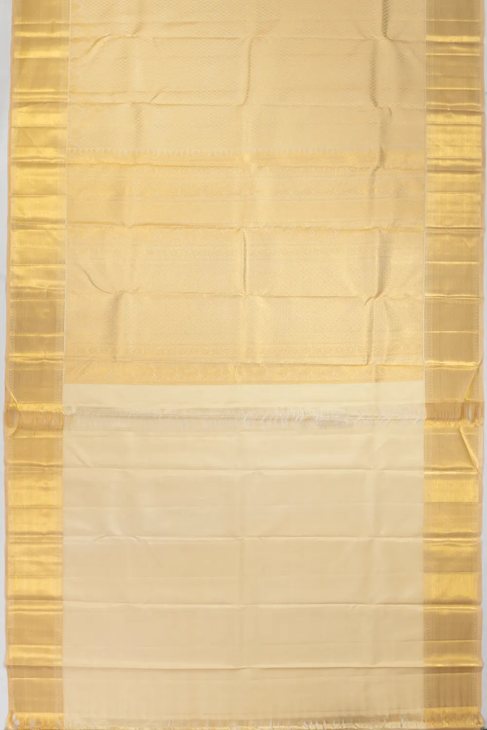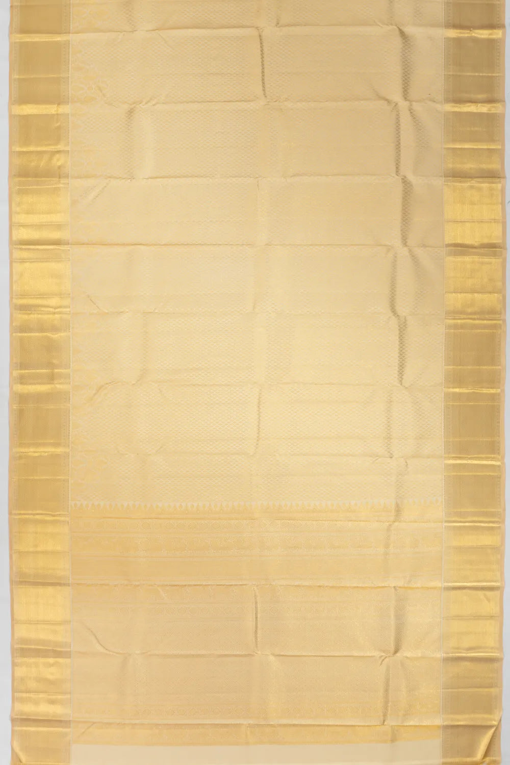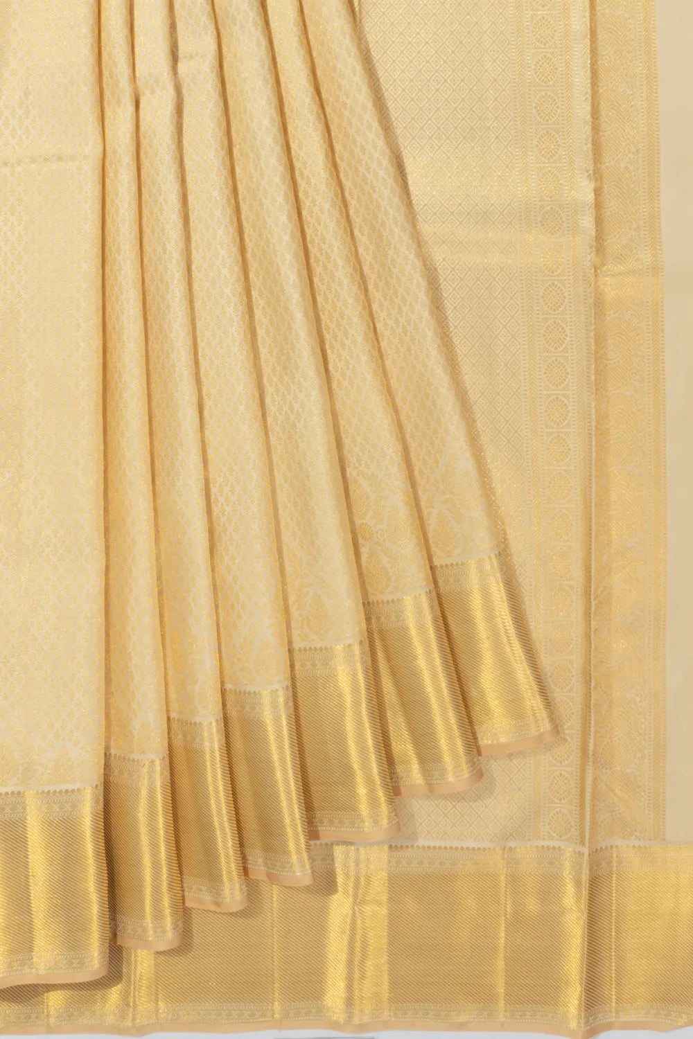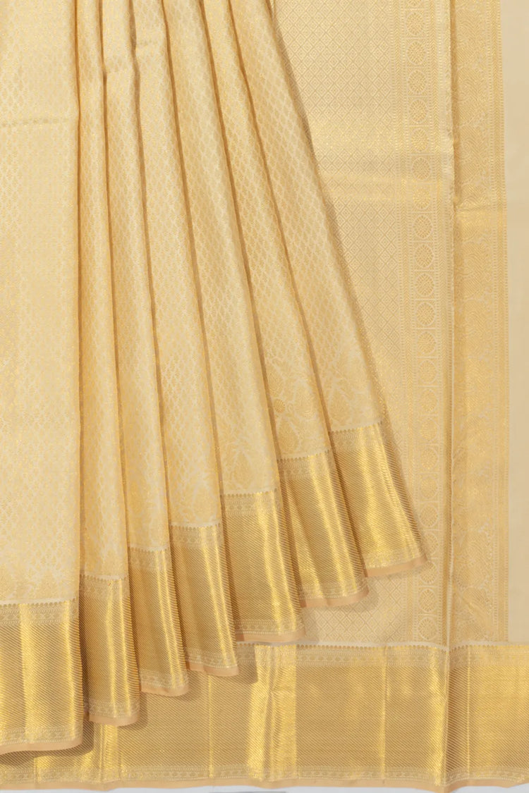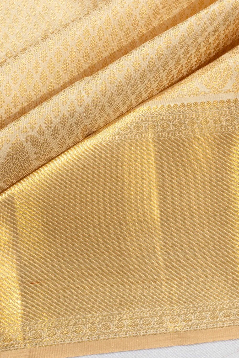 Crafted on a cream base, this saree is adorned with exquisite gold zari floral brocade, featuring delicate floral vines beautifully accentuated on the pleats for added charm.